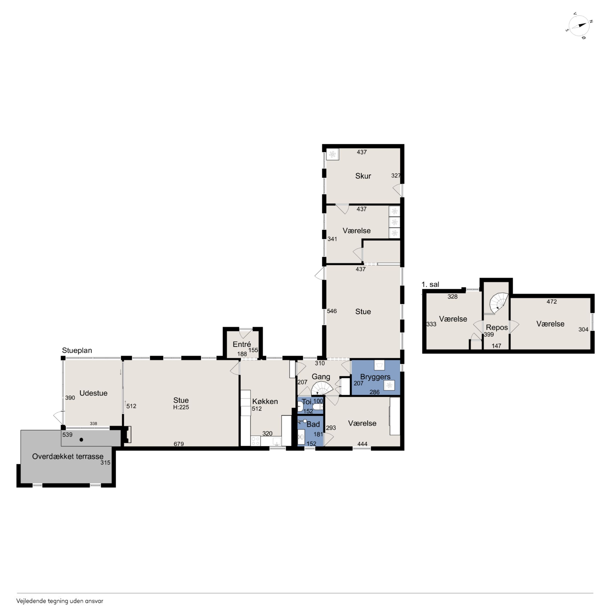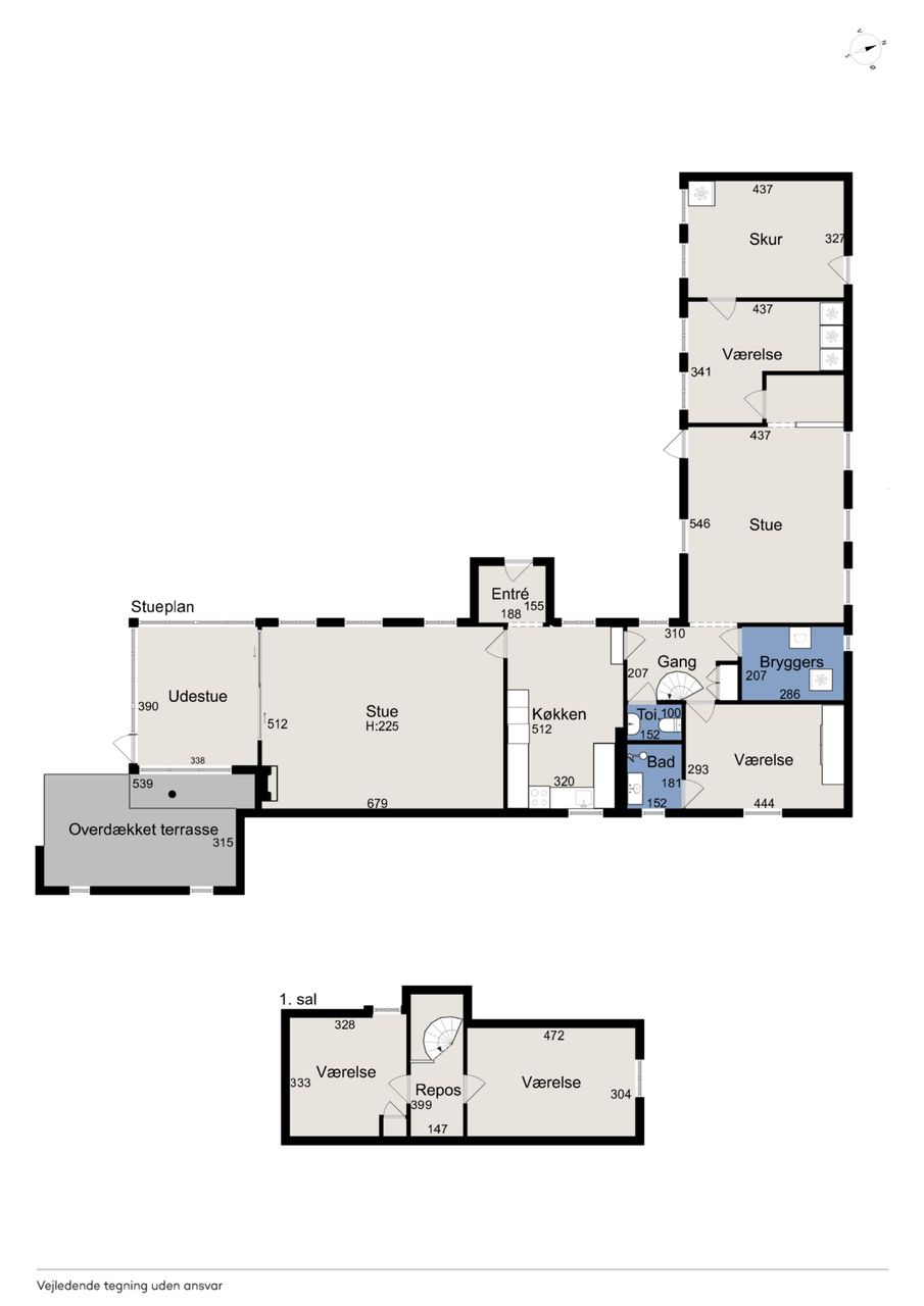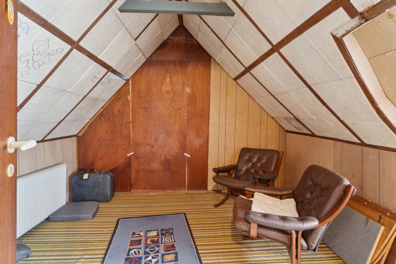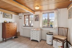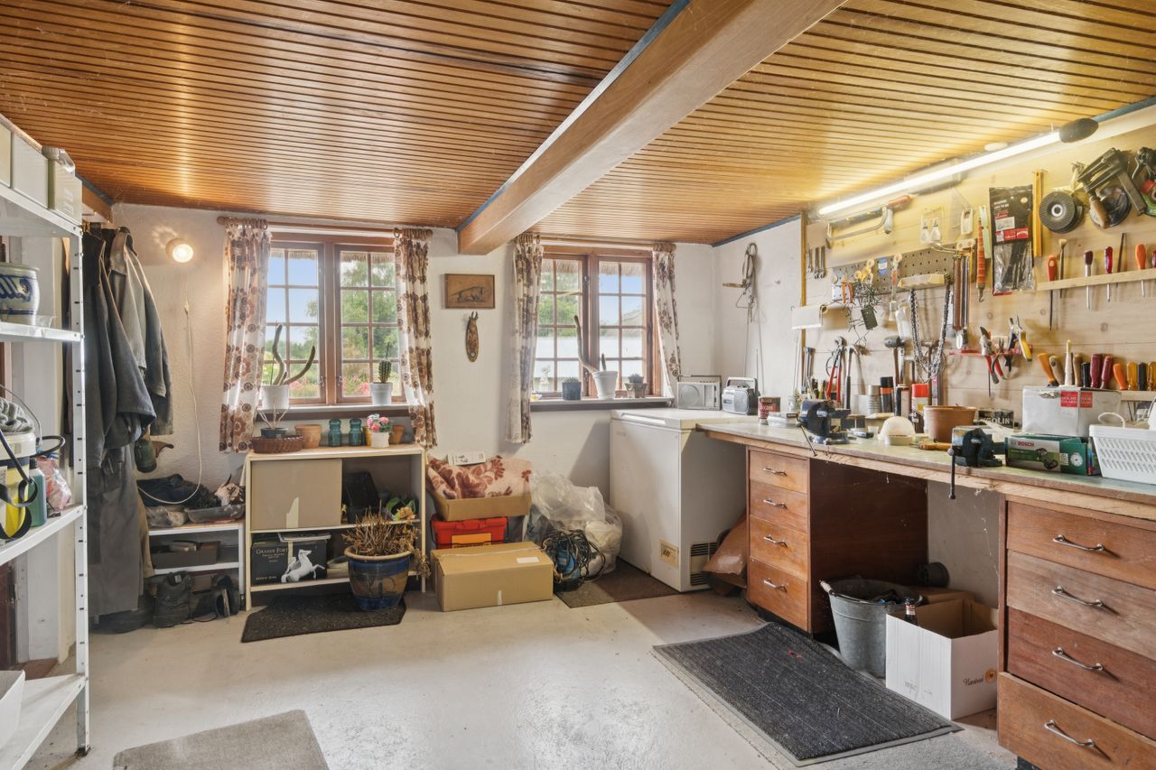 Fra køkkenet fører en baggang til et gæstetoilet, et bryggers og et værelse med adgang til eget badeværelse. Derudover rummer stueplanet endnu en stue og et værelse mere samt et skur med egen indgang. På førstesalen finder I to værelser.