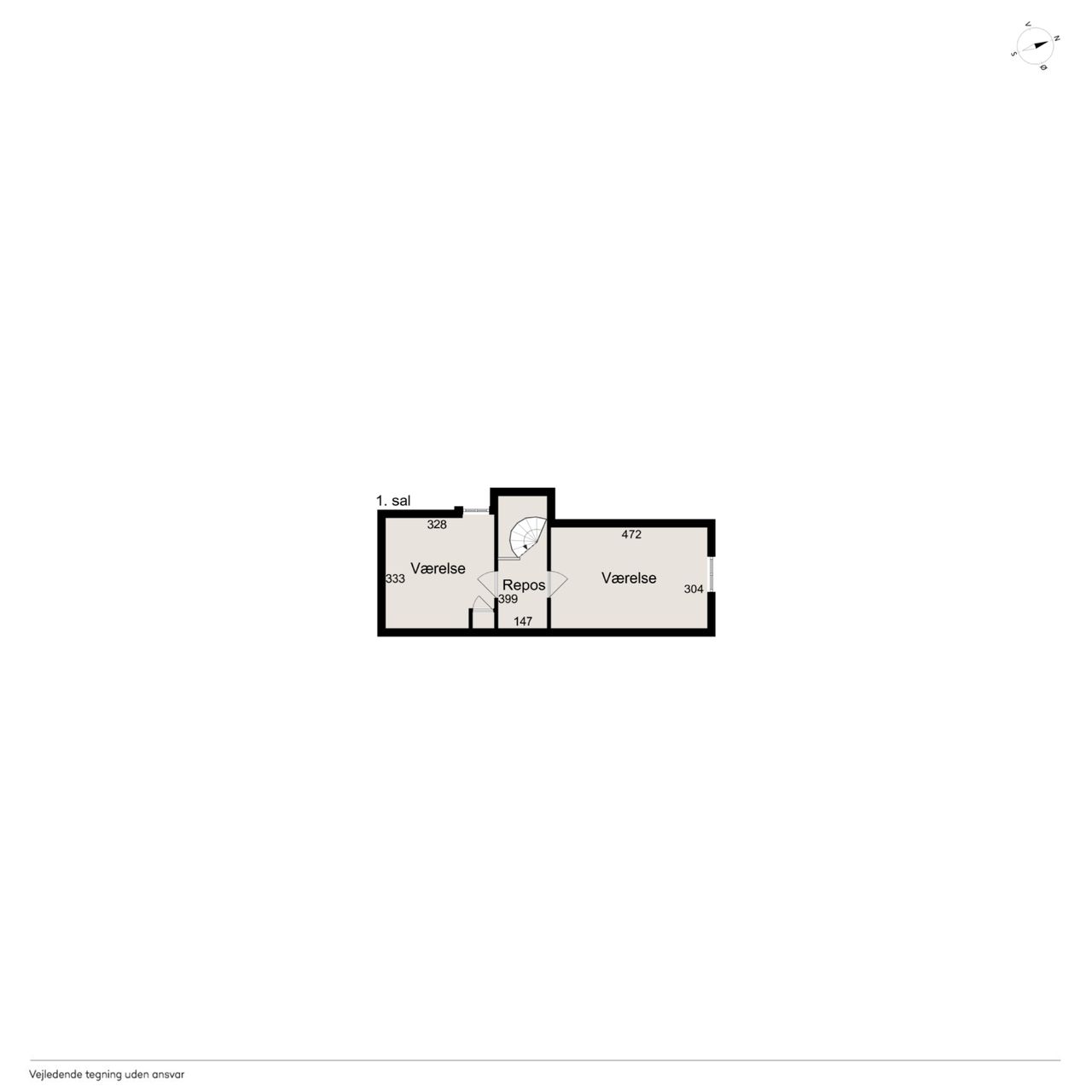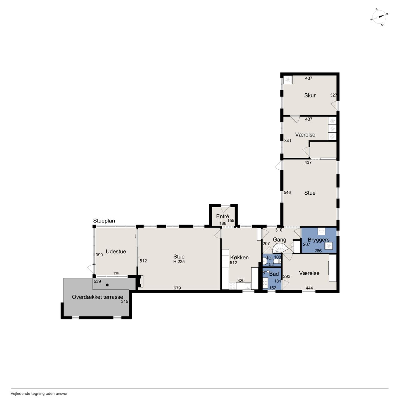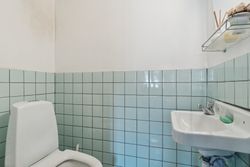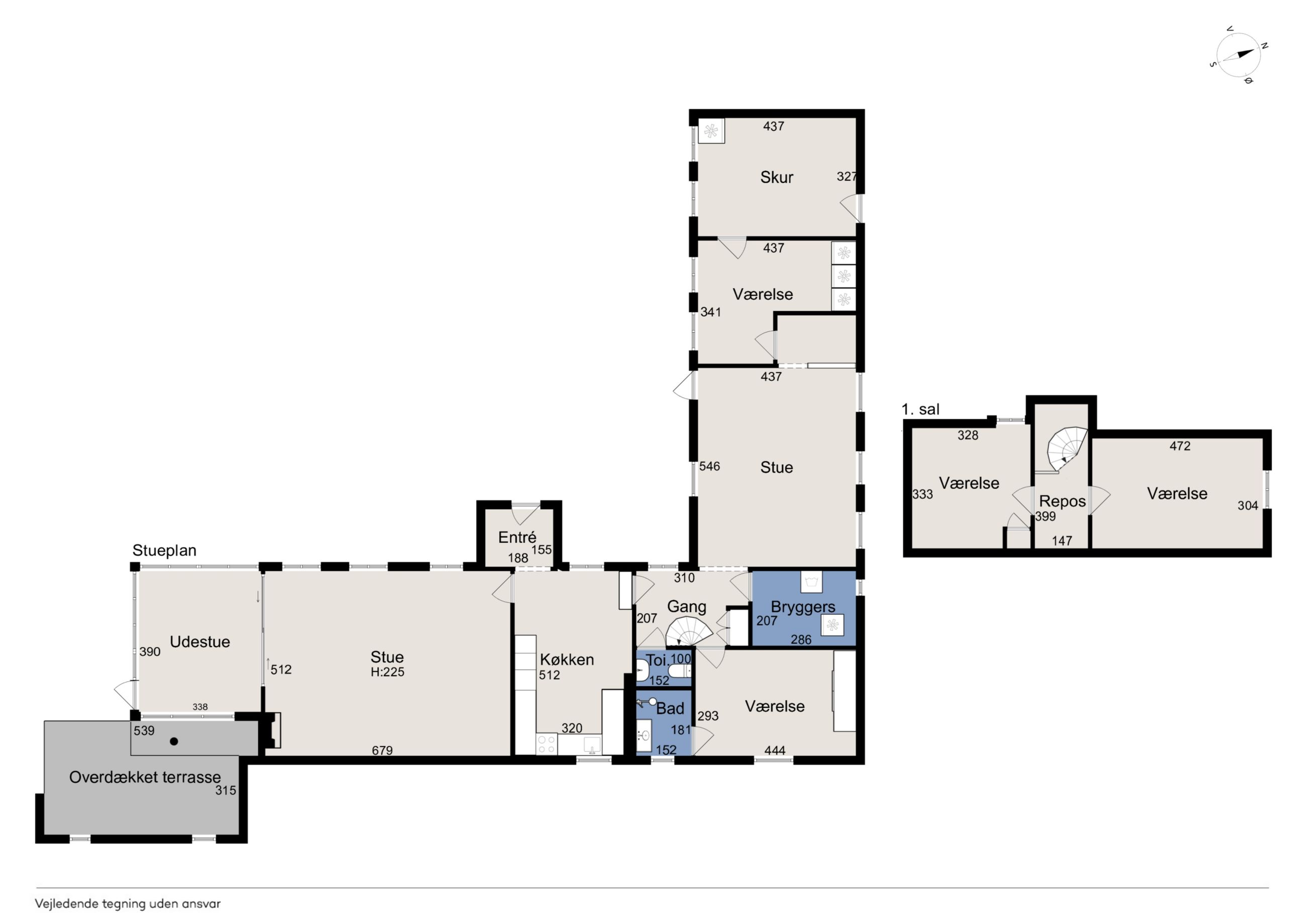 Fra køkkenet fører en baggang til et gæstetoilet, et bryggers og et værelse med adgang til eget badeværelse. Derudover rummer stueplanet endnu en stue og et værelse mere samt et skur med egen indgang. På førstesalen finder I to værelser.