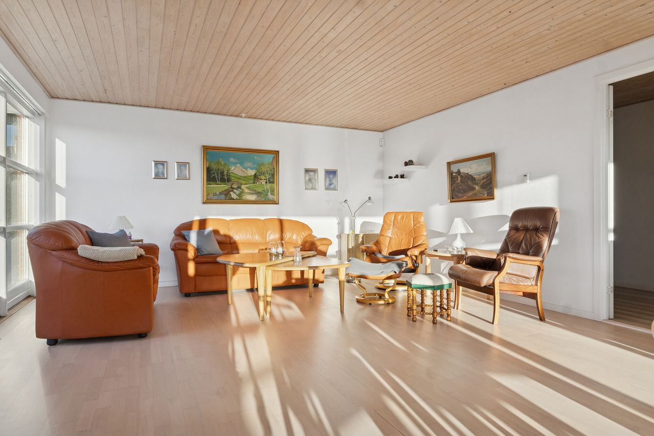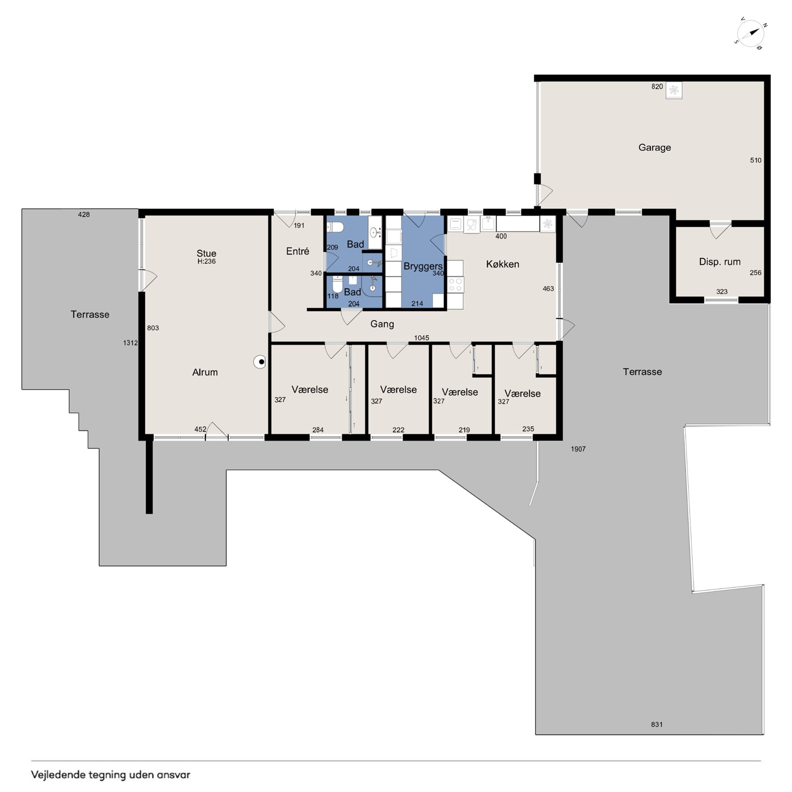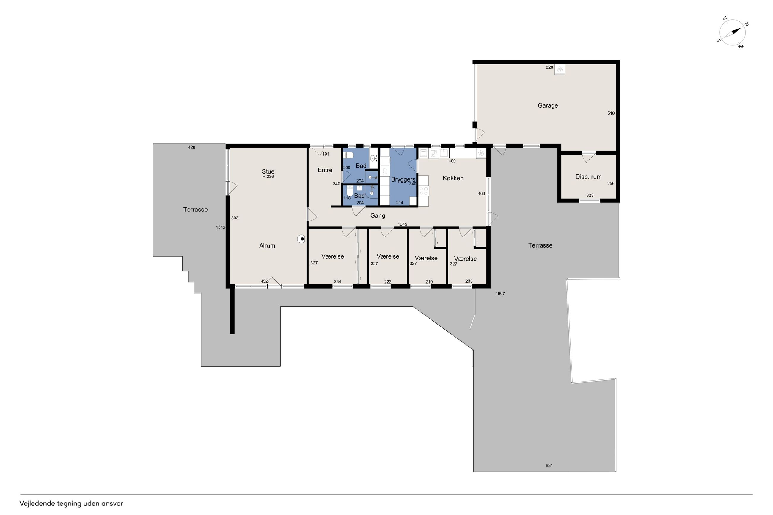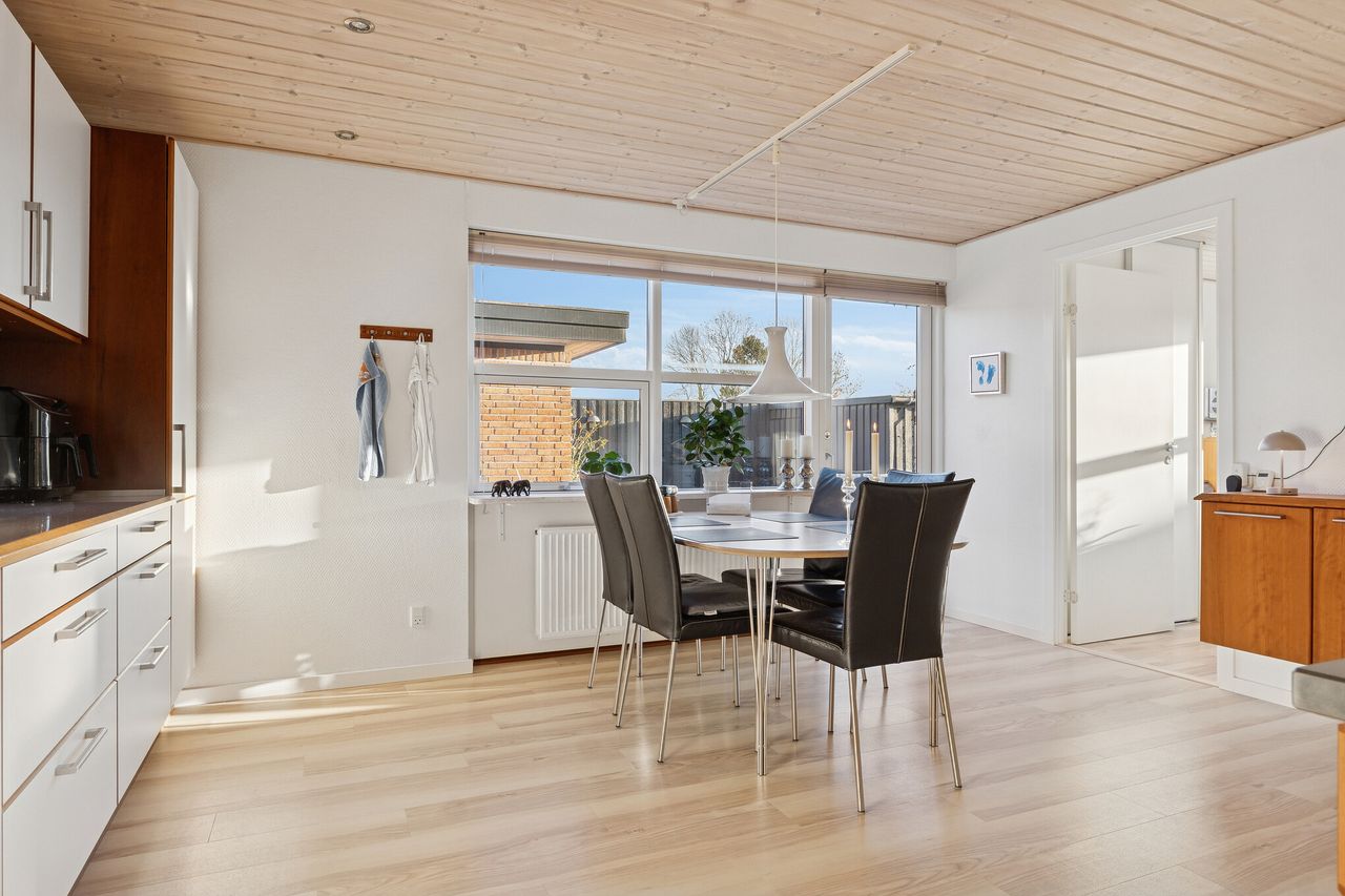 Køkkenet er stort, så der er masser af plads til et spisebord, og herpå følger endnu fire værelser, der kan indrettes på et hav af måder, så det matcher jeres behov og præferencer. I forlængelse af køkkenet råder I over et praktisk bryggers med egen indgang, og ved entréen er der to badeværelser.