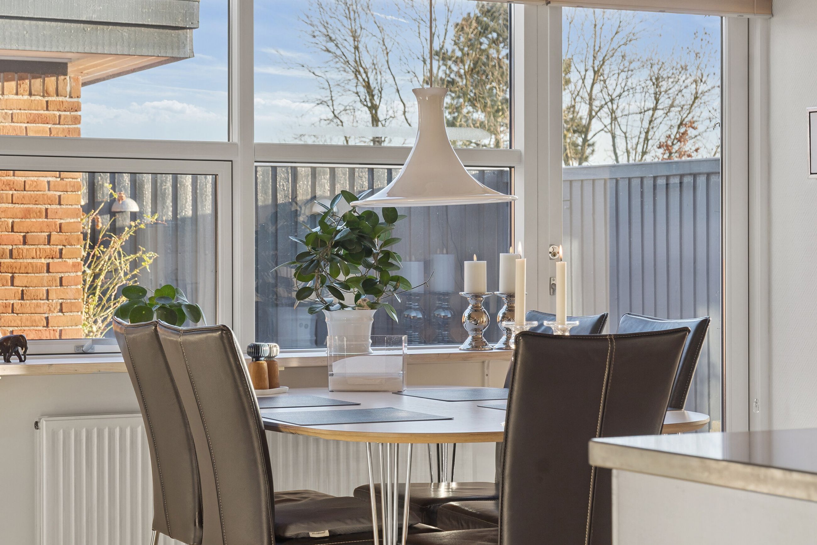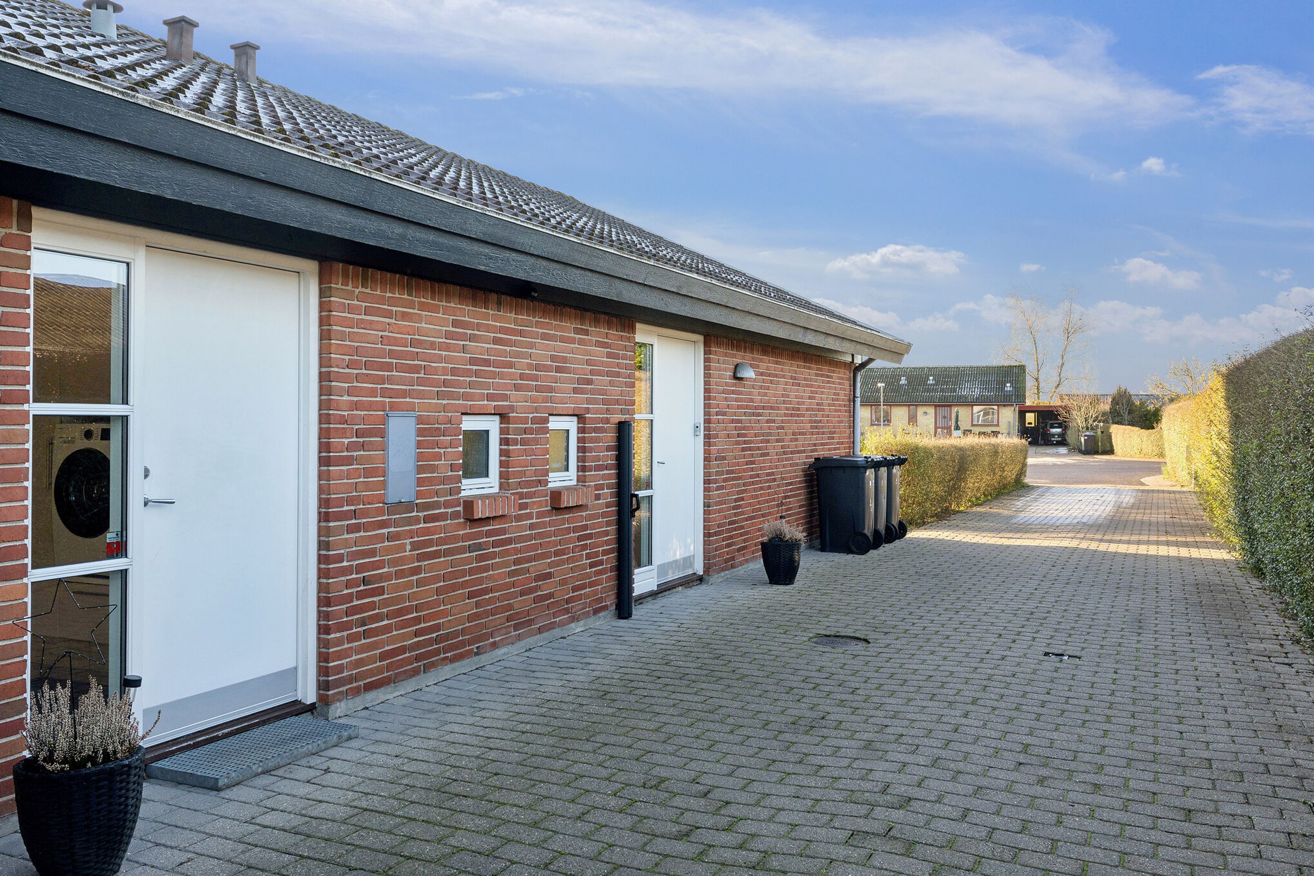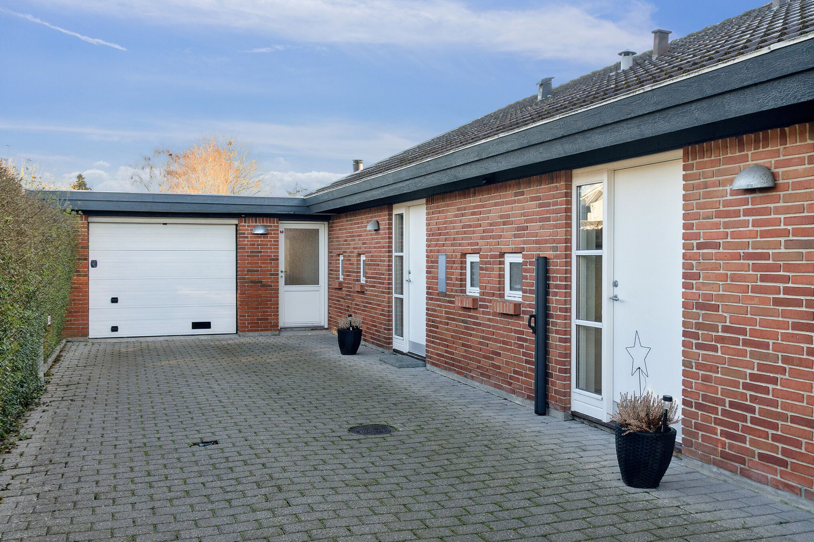 Udefra fremstår villaen med en nydelig rødstensfacade. Vinduerne er hvide, og det samme er træværket ved gavle og udhæng. Inden døre fortsætter det velkomponerede udtryk, og især vil det rige lysindfald i den store stue tiltrække sig stor opmærksomhed. De markante glaspartier skaber et formidabelt lysindfald.