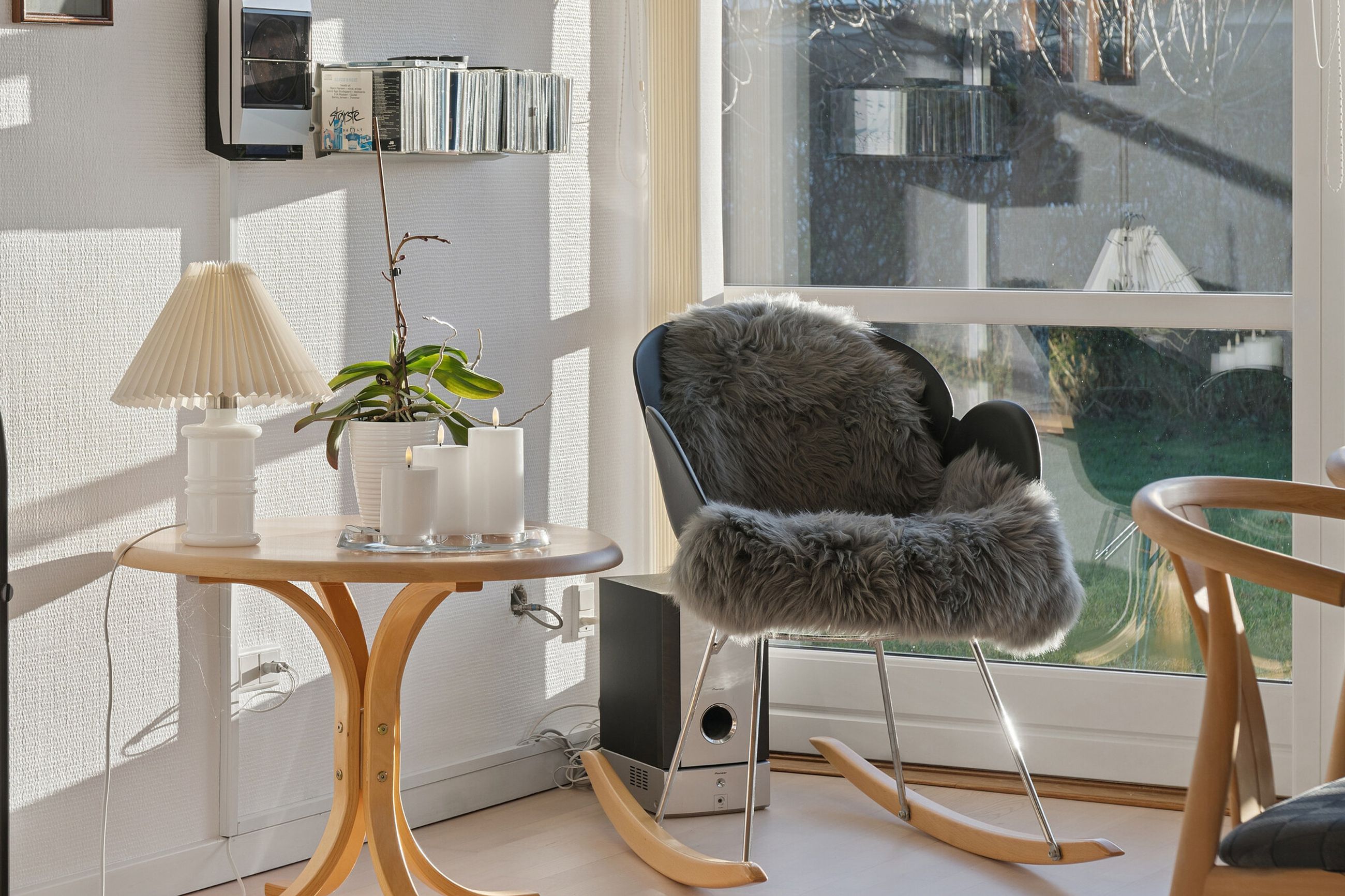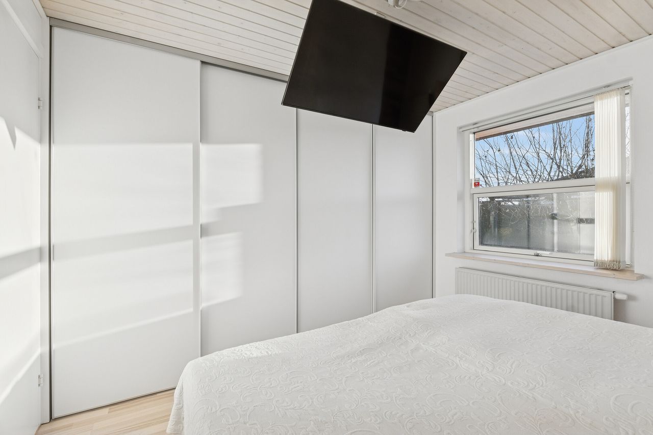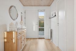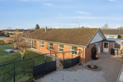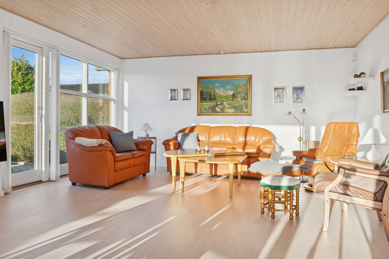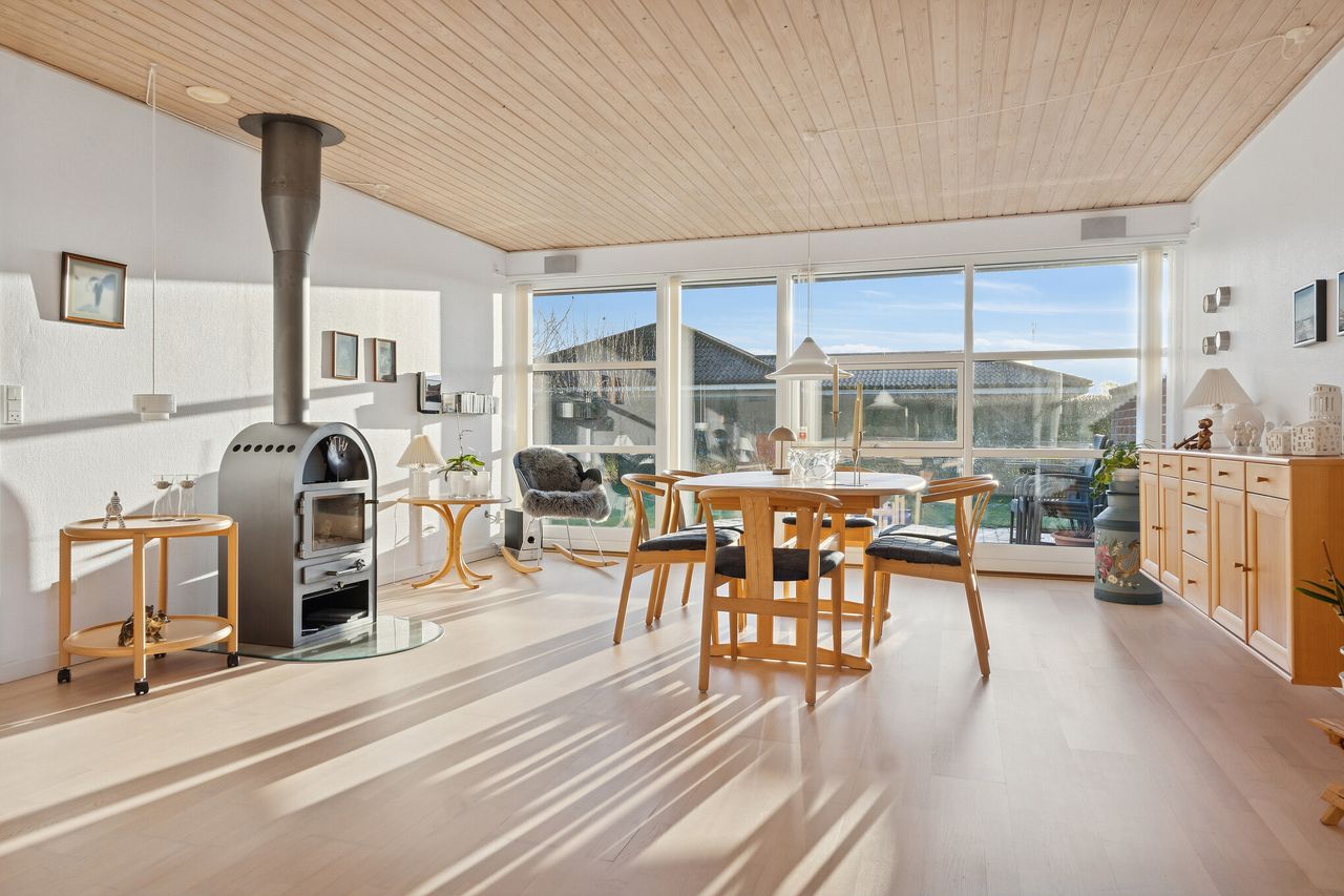Udefra fremstår villaen med en nydelig rødstensfacade. Vinduerne er hvide, og det samme er træværket ved gavle og udhæng. Inden døre fortsætter det velkomponerede udtryk, og især vil det rige lysindfald i den store stue tiltrække sig stor opmærksomhed. De markante glaspartier skaber et formidabelt lysindfald.