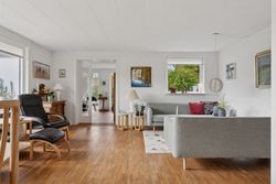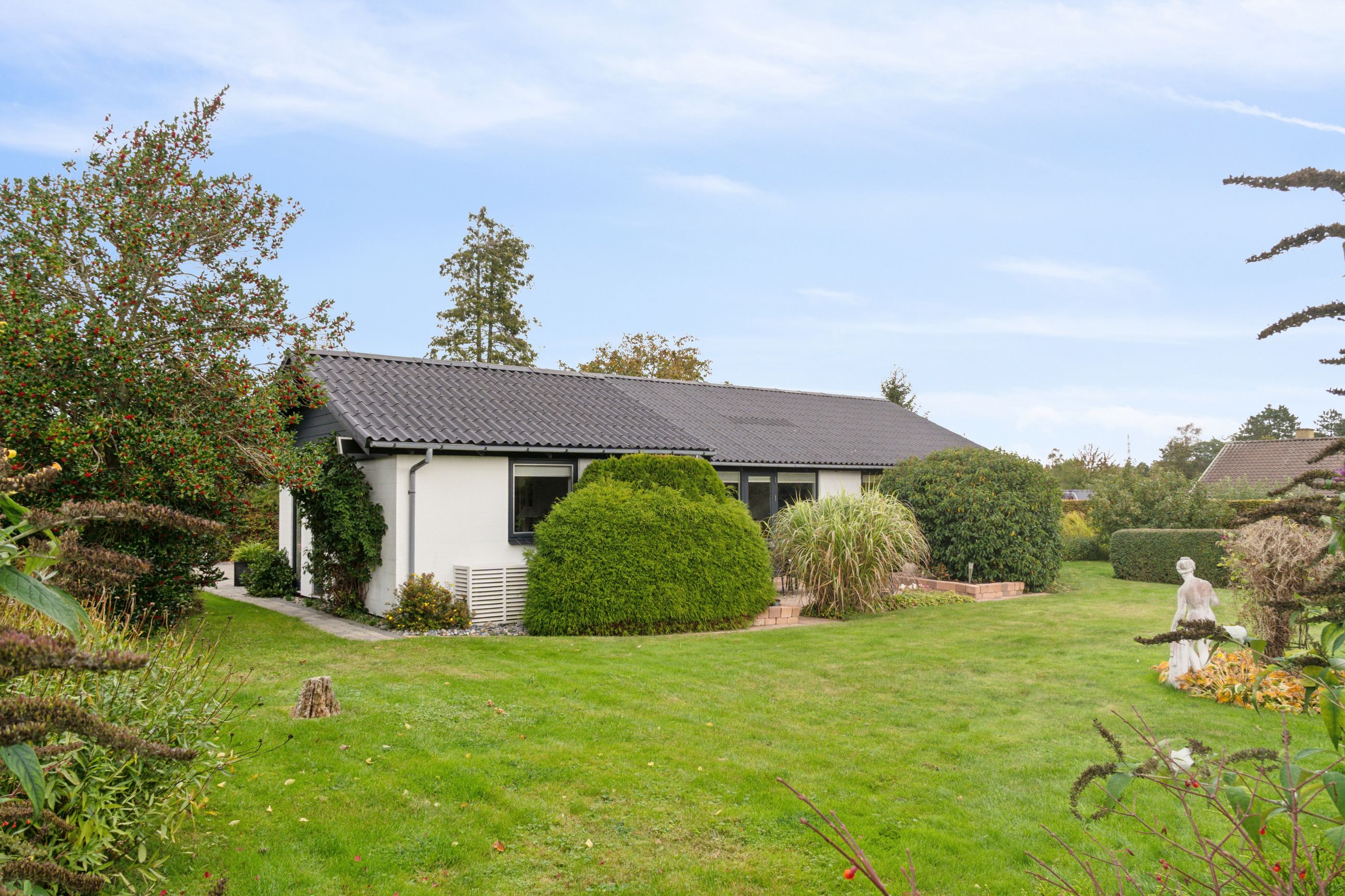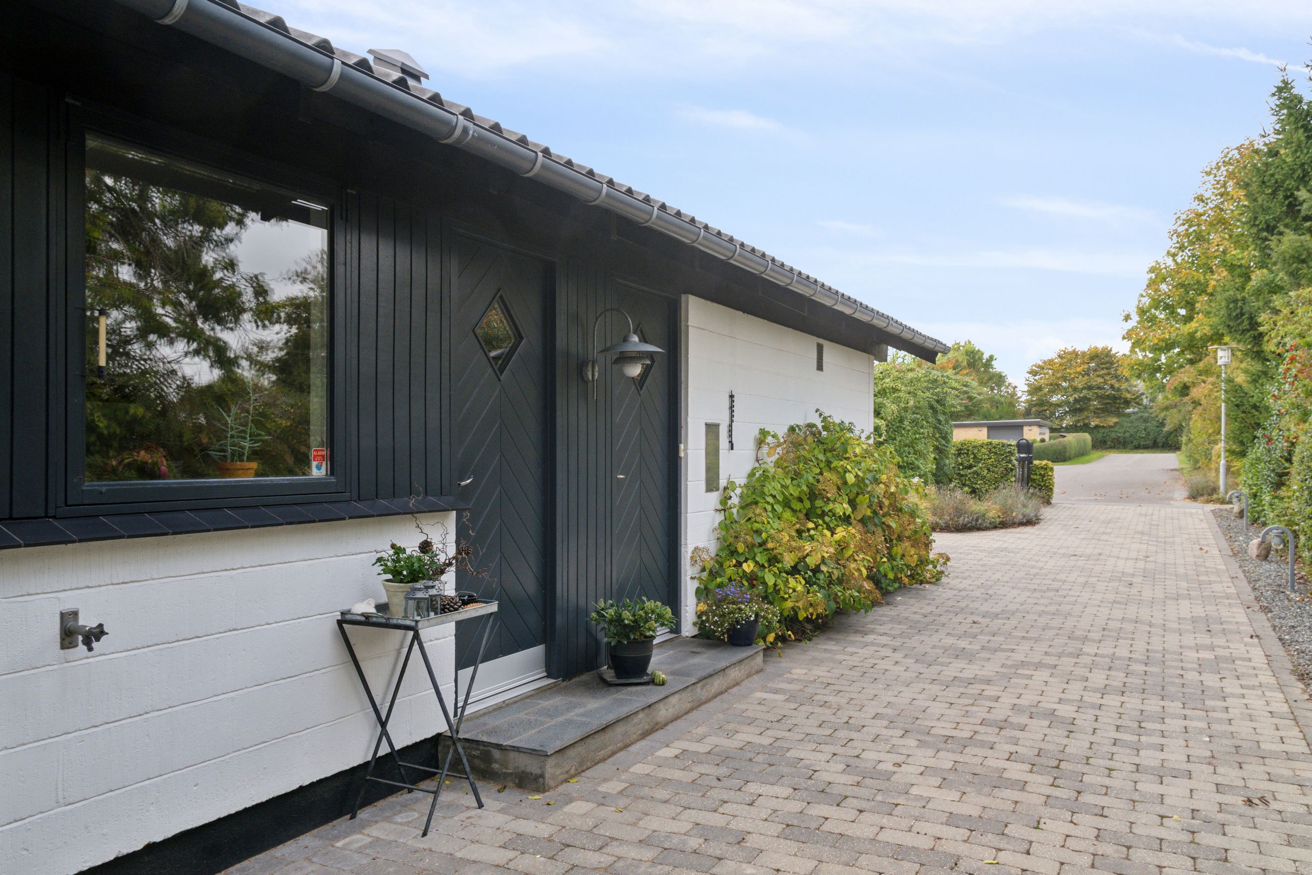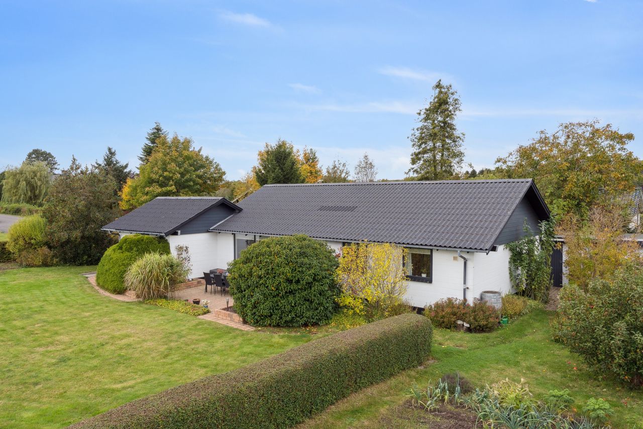 Villaen er fra 1972, og den fremtræder med velholdt, hvid facade og mørkegrå detaljer, der skaber et pænt og harmonisk udtryk.
