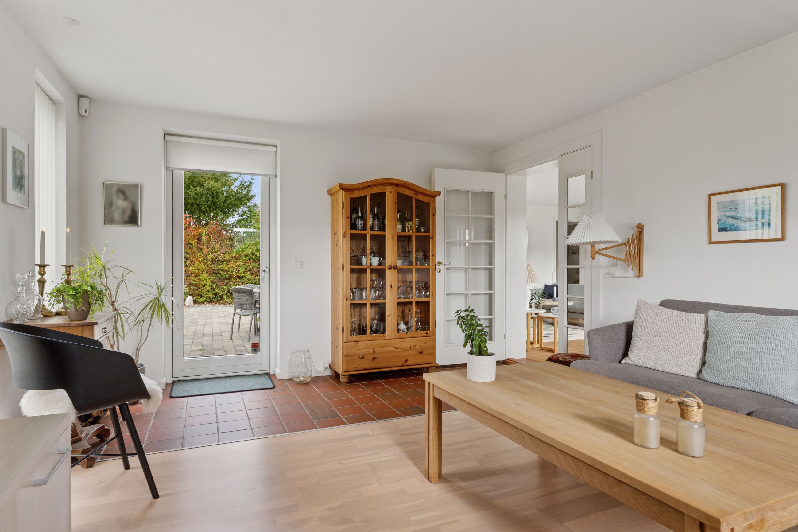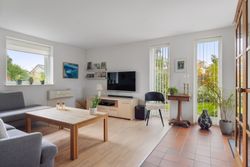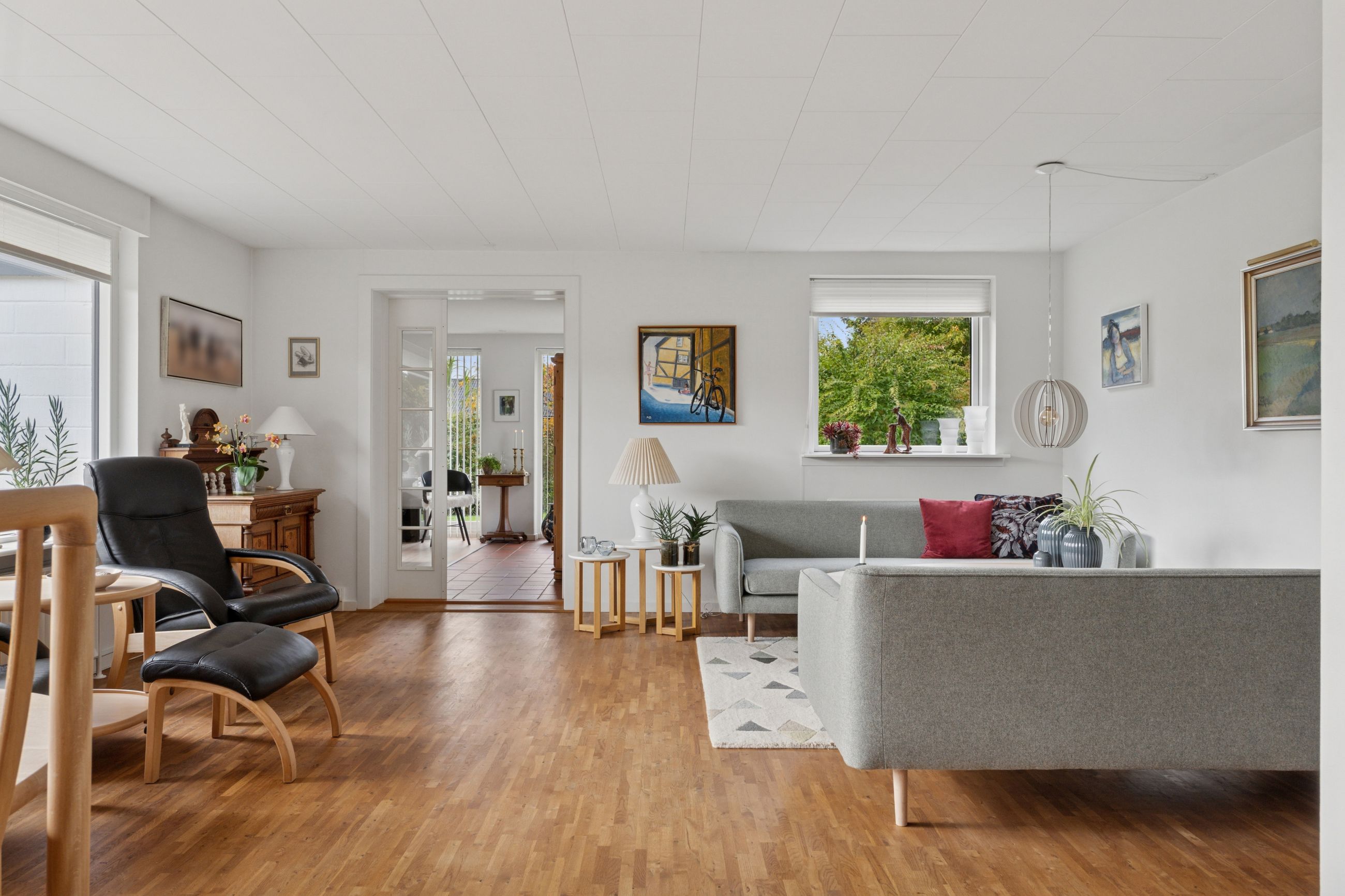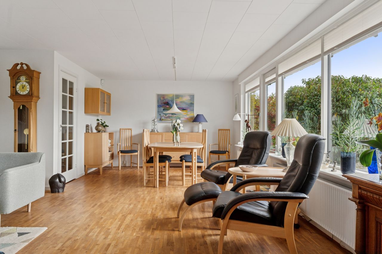 Indenfor er det uden tvivl vinkelstuen, der først tiltrækker sig opmærksomhed, for her er en rigtig behagelig rumfornemmelse – og de store vinduespartier giver et dejligt lysindfald. I forlængelse af vinkelstuen får I som sagt endnu en stue, og begge stuer har terrassedør.