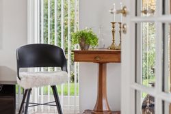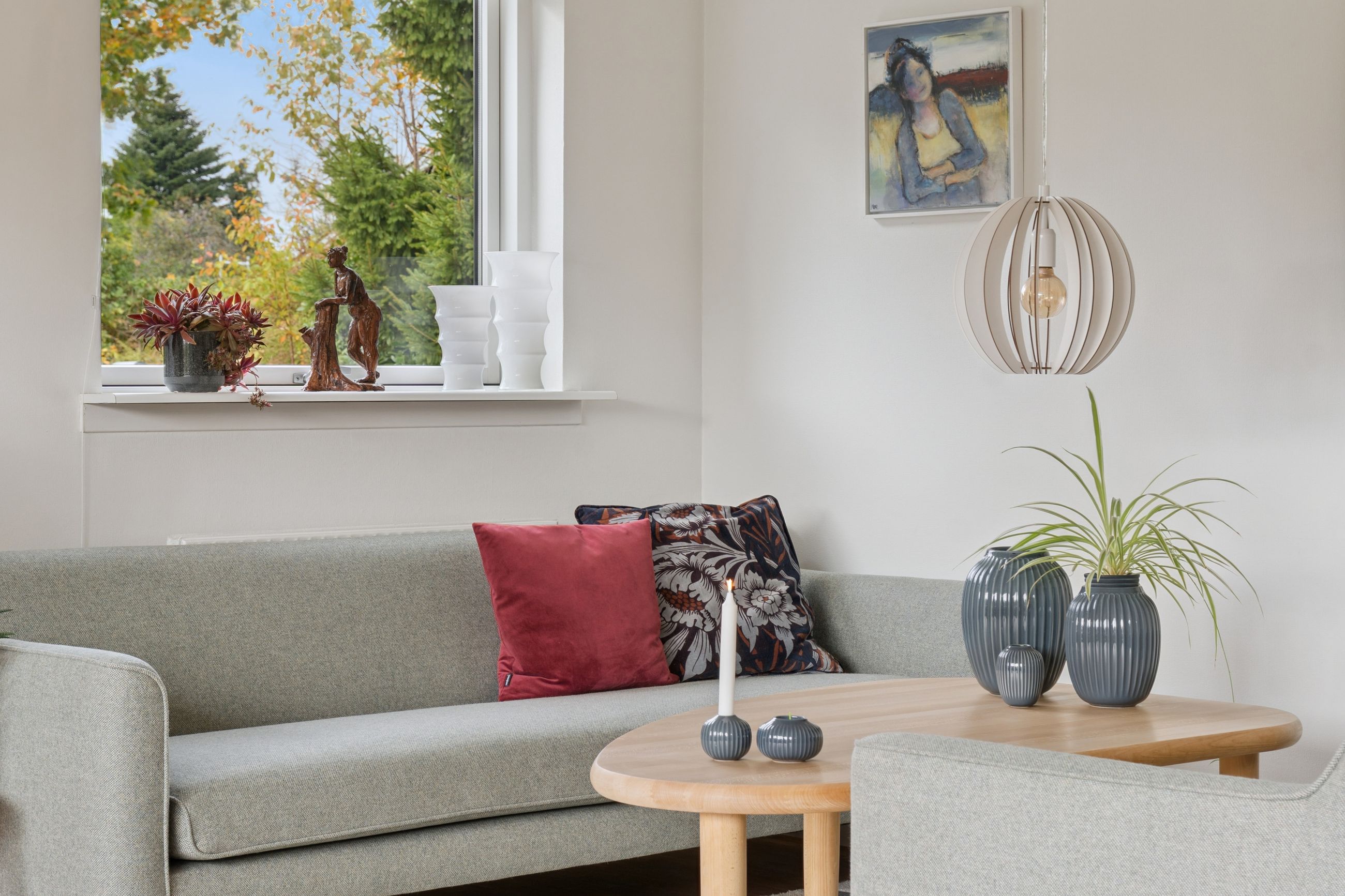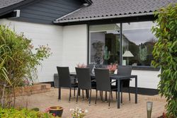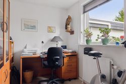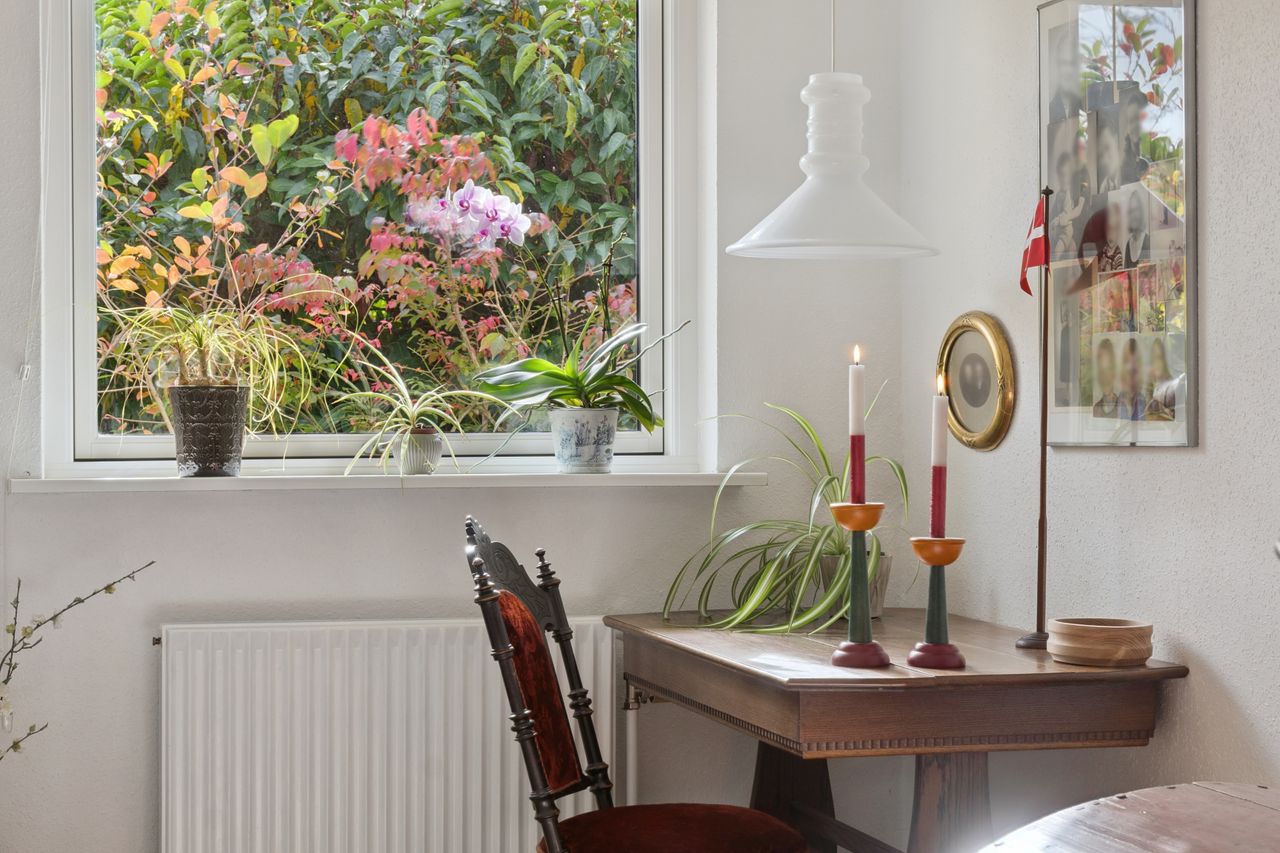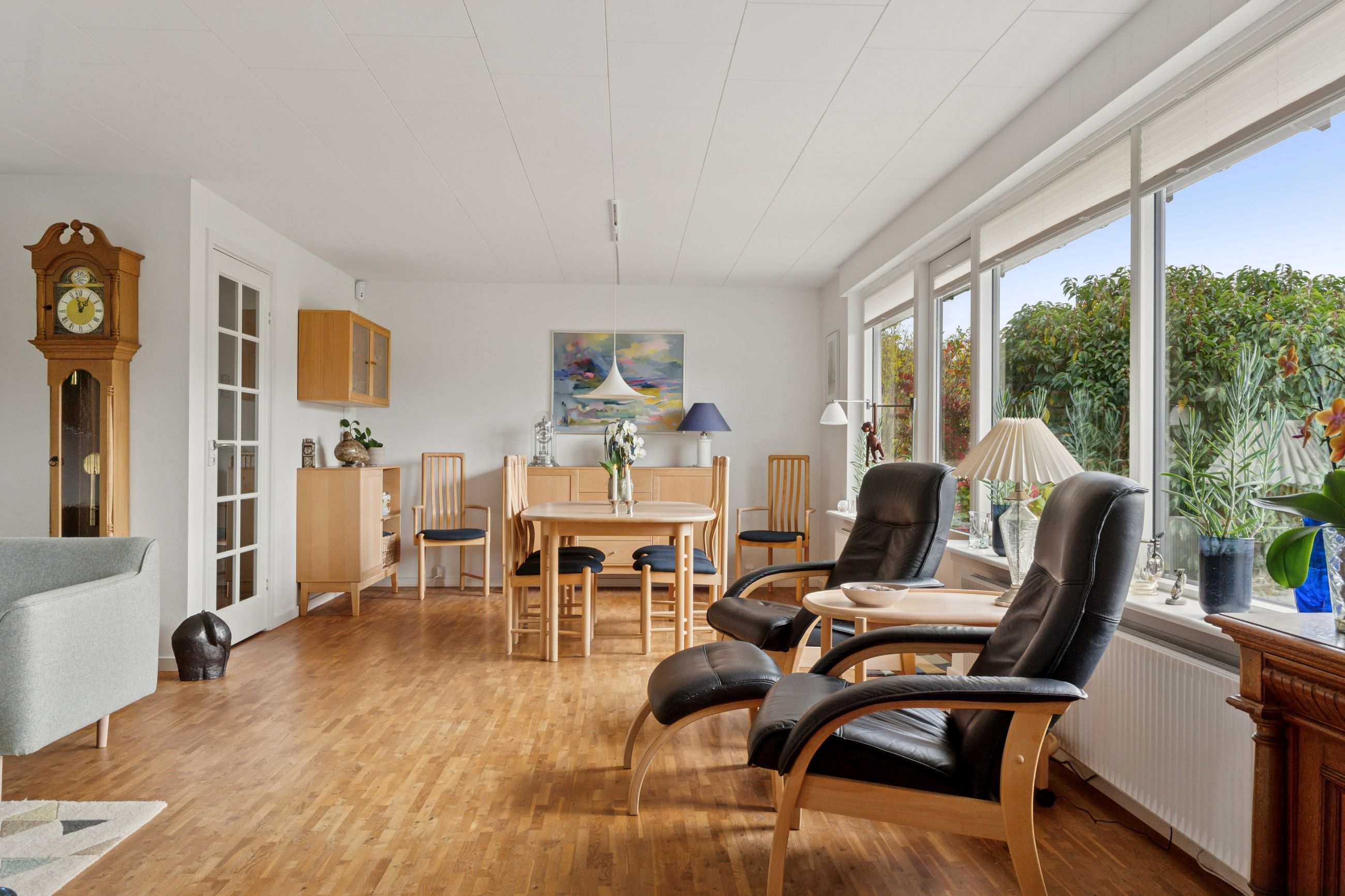 Indenfor er det uden tvivl vinkelstuen, der først tiltrækker sig opmærksomhed, for her er en rigtig behagelig rumfornemmelse – og de store vinduespartier giver et dejligt lysindfald. I forlængelse af vinkelstuen får I som sagt endnu en stue, og begge stuer har terrassedør.