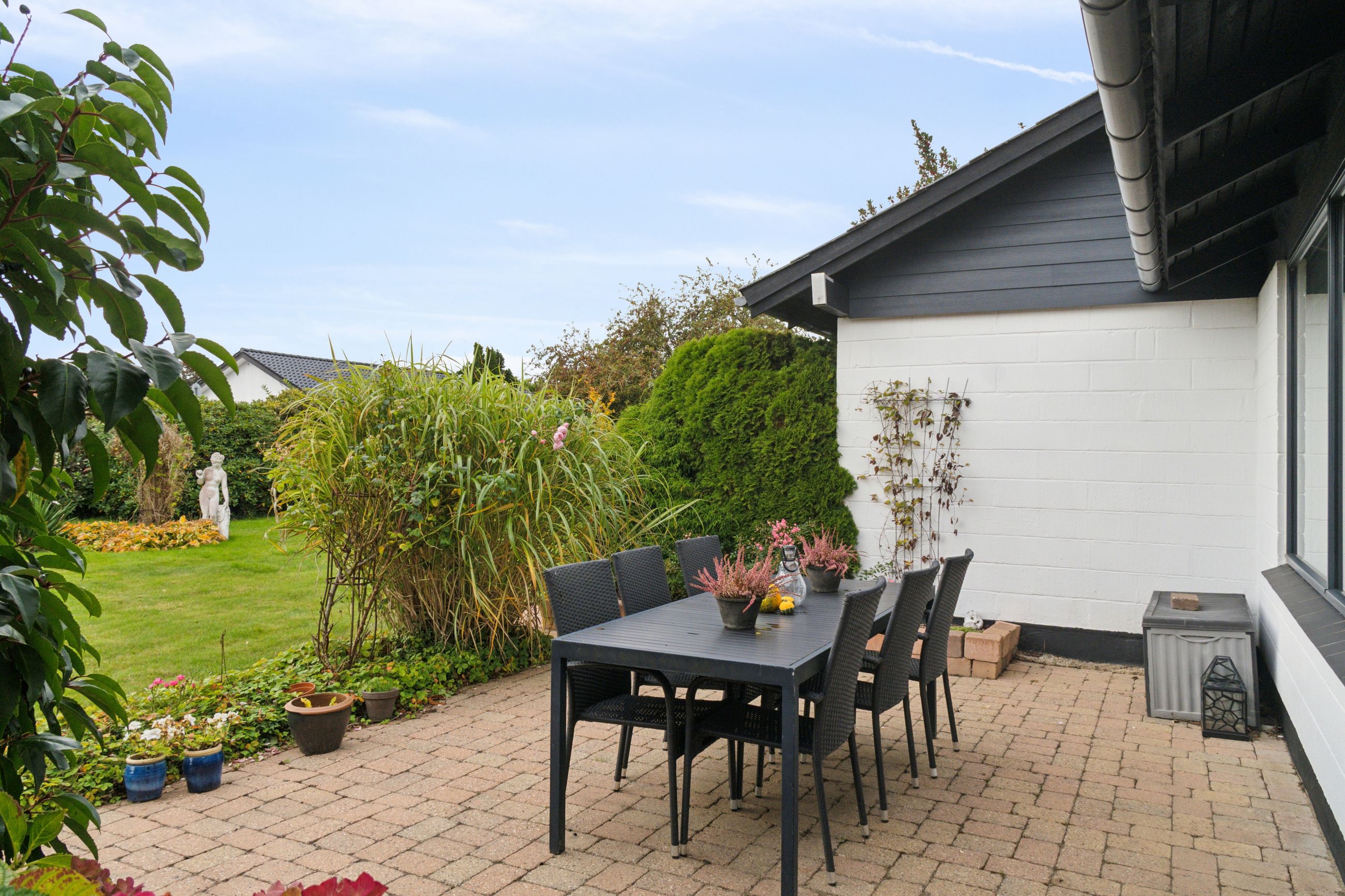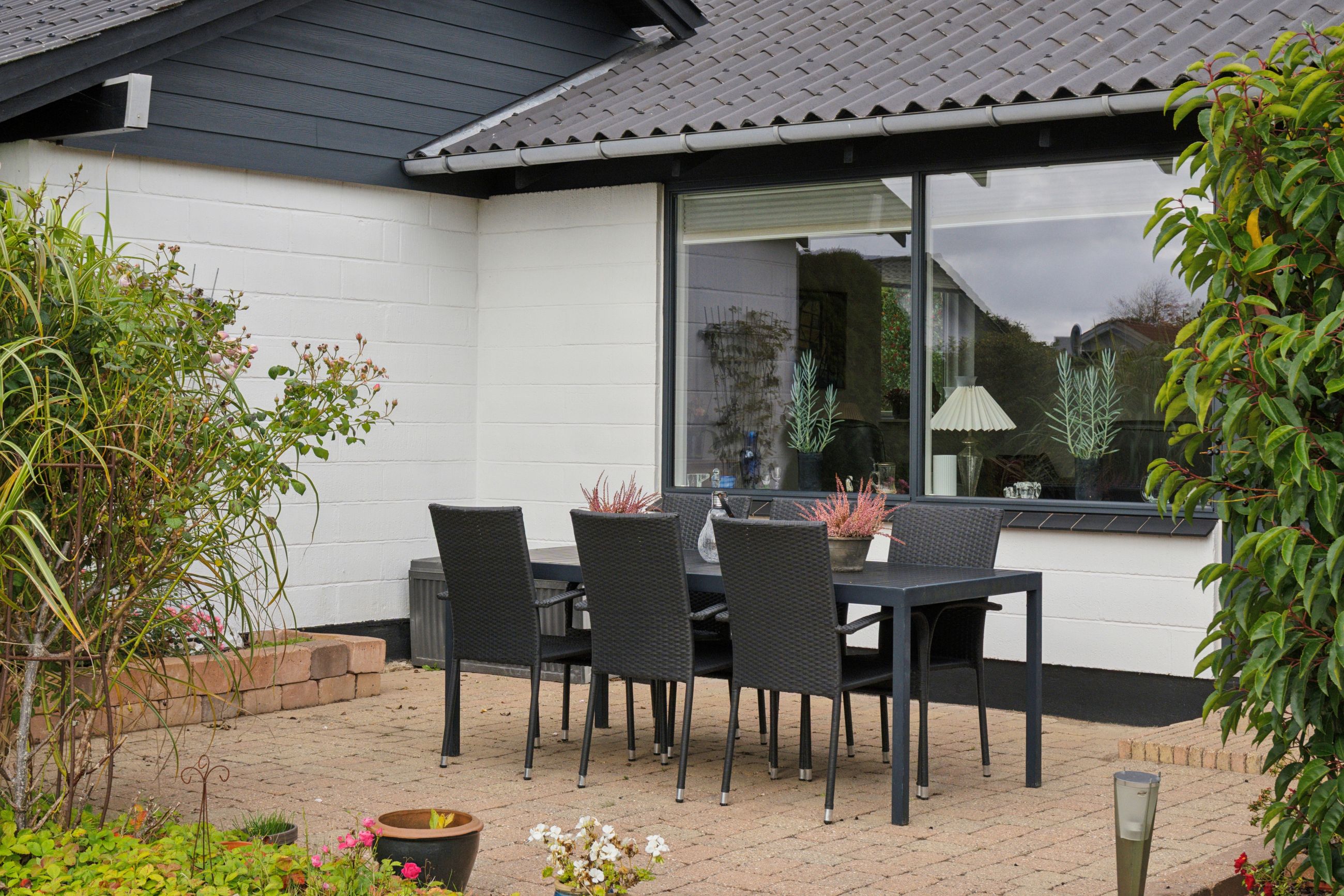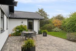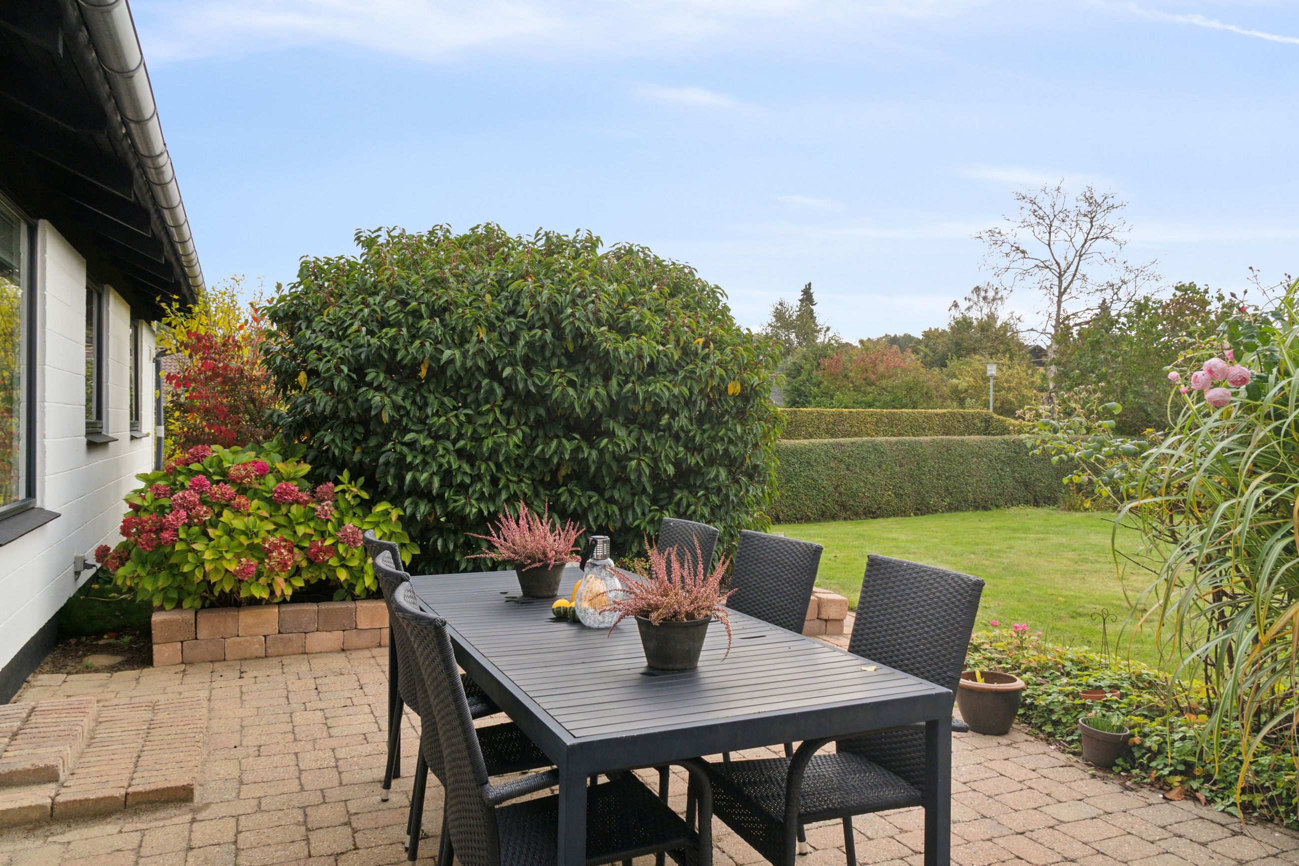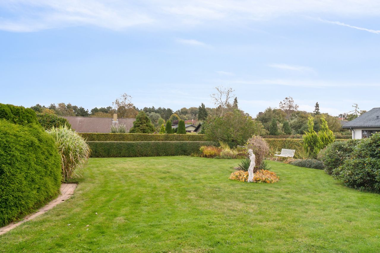 Haven vender mod syd, og den er flot anlagt med en fliseterrasse og alskens frodige beplantning. Haven har desuden et afsnit med køkkenhave, og forrest på grunden er der endnu et fliseareal, hvor I kan indrette en hyggekrog med aftensol.