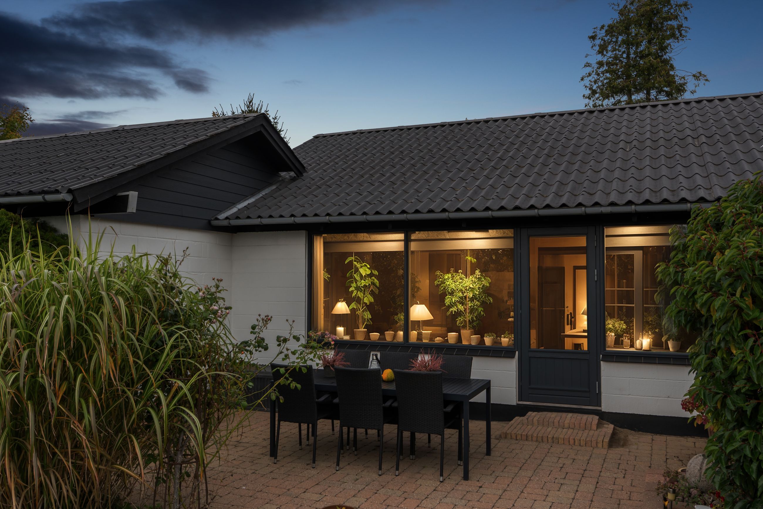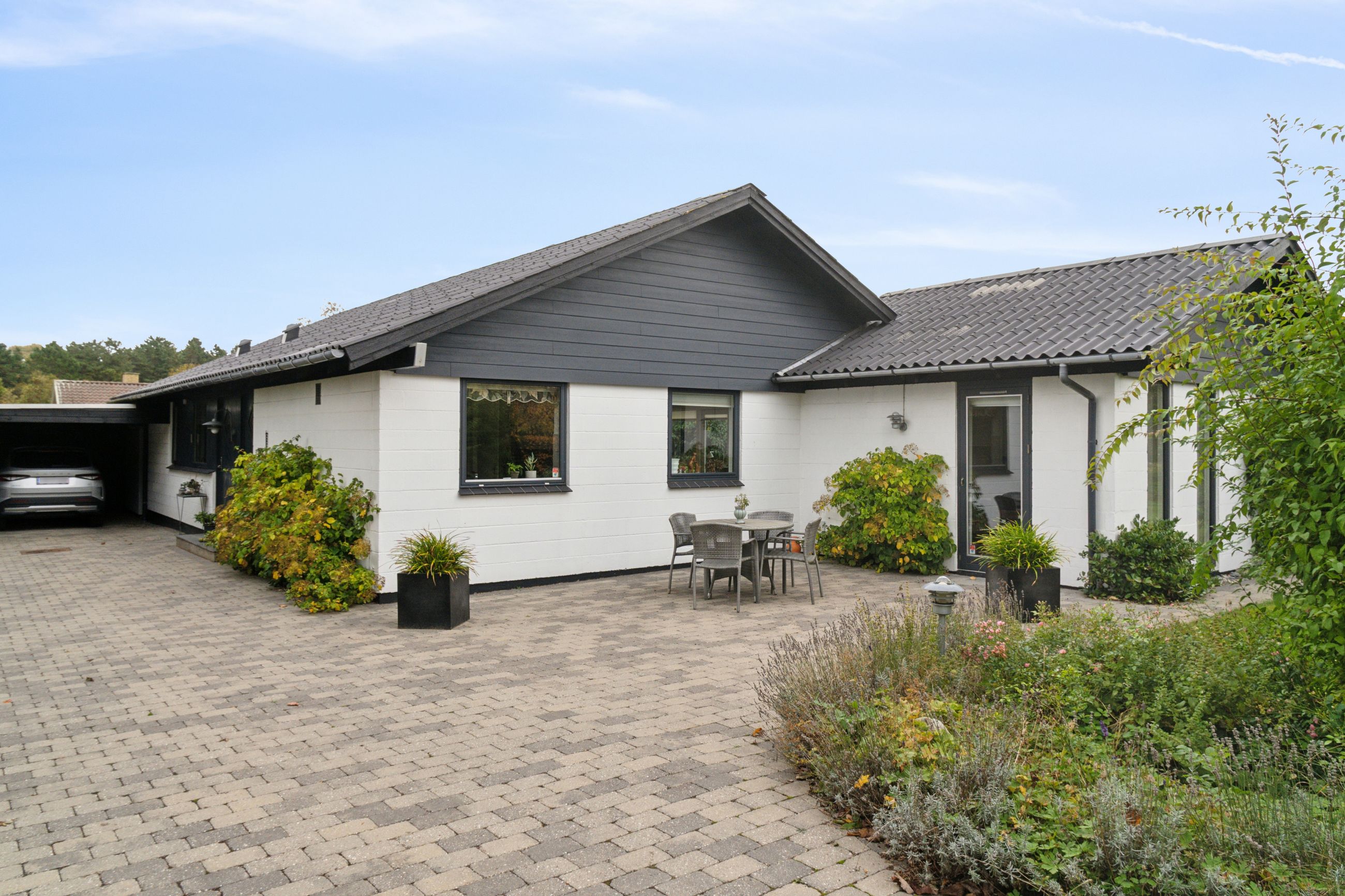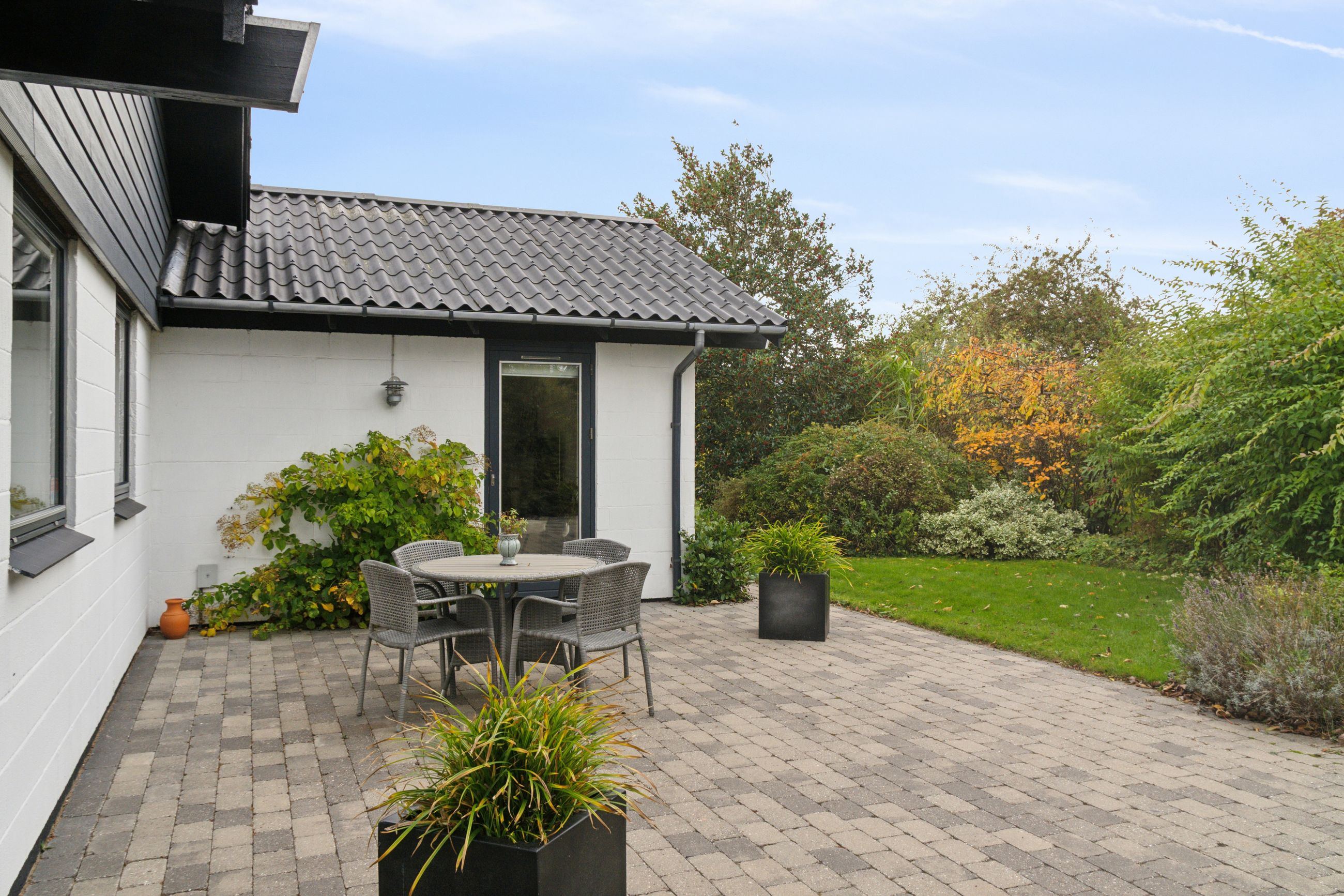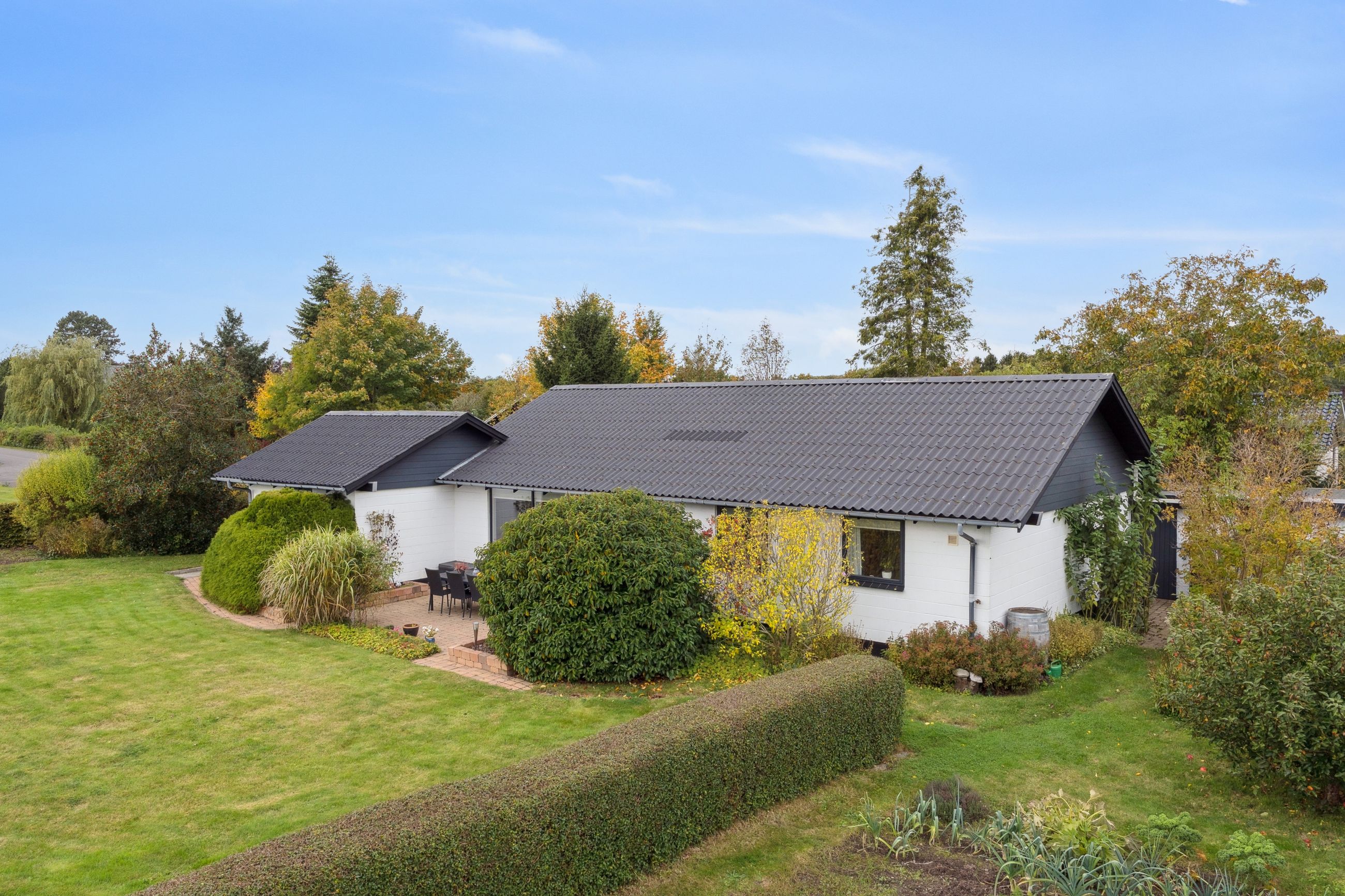 Haven vender mod syd, og den er flot anlagt med en fliseterrasse og alskens frodige beplantning. Haven har desuden et afsnit med køkkenhave, og forrest på grunden er der endnu et fliseareal, hvor I kan indrette en hyggekrog med aftensol.