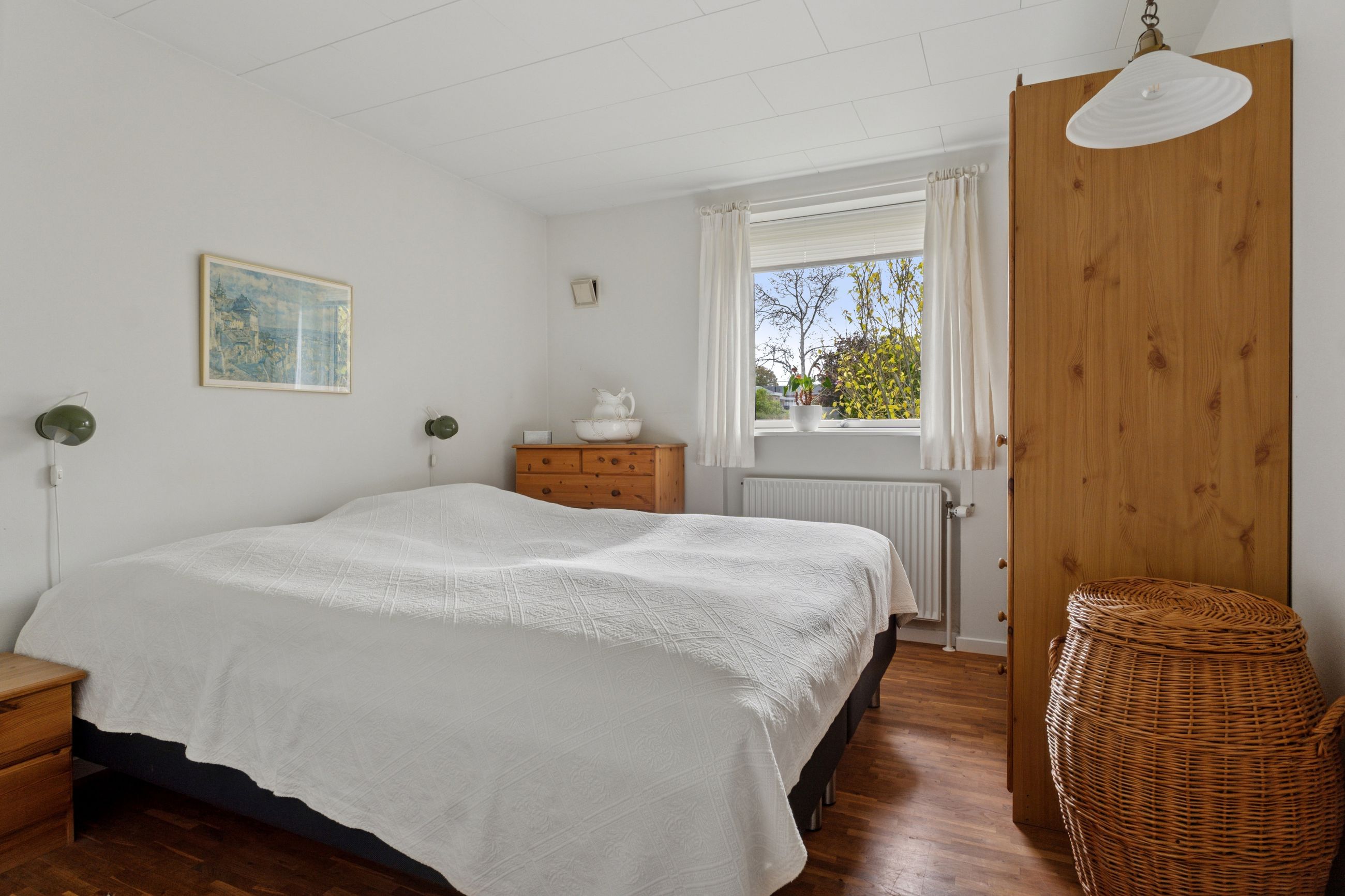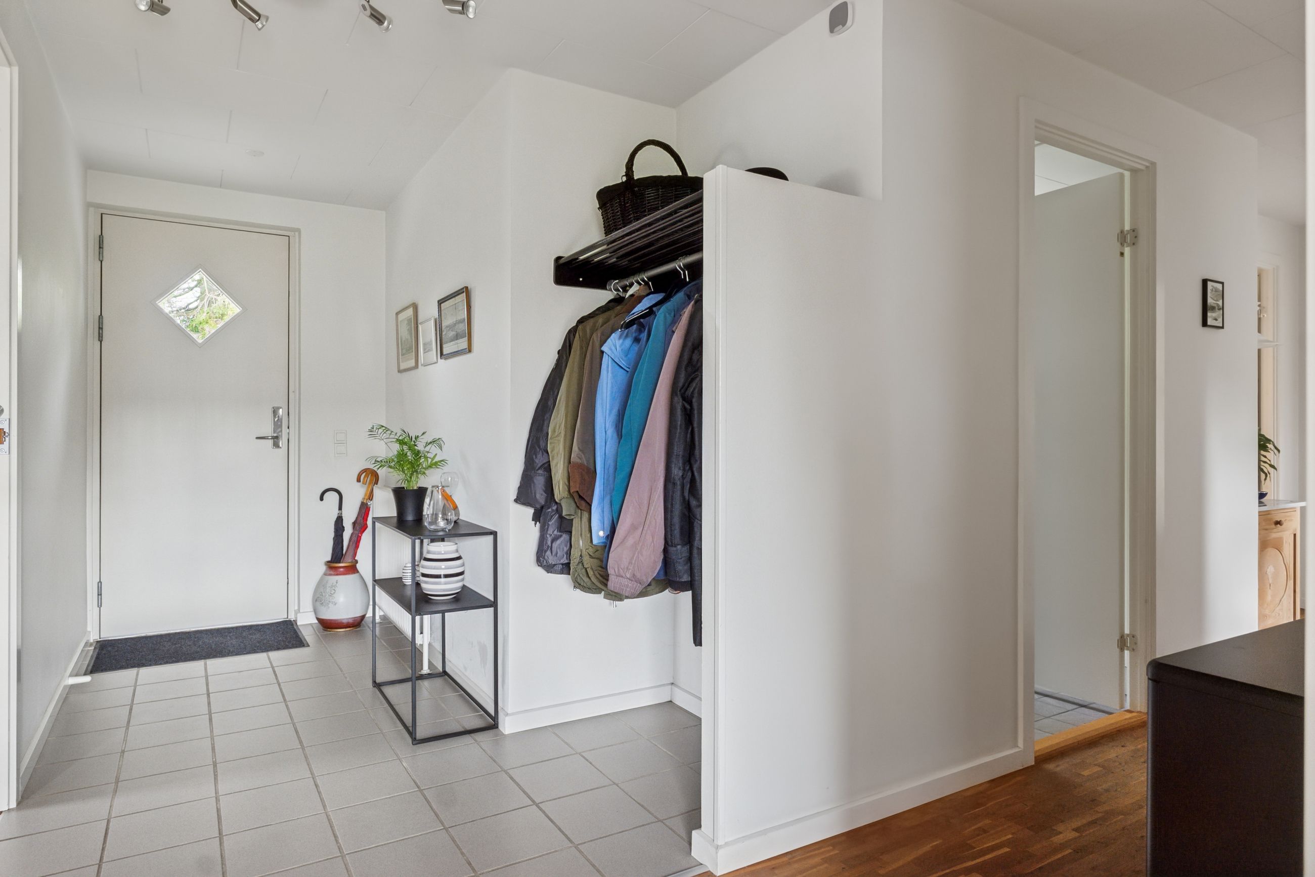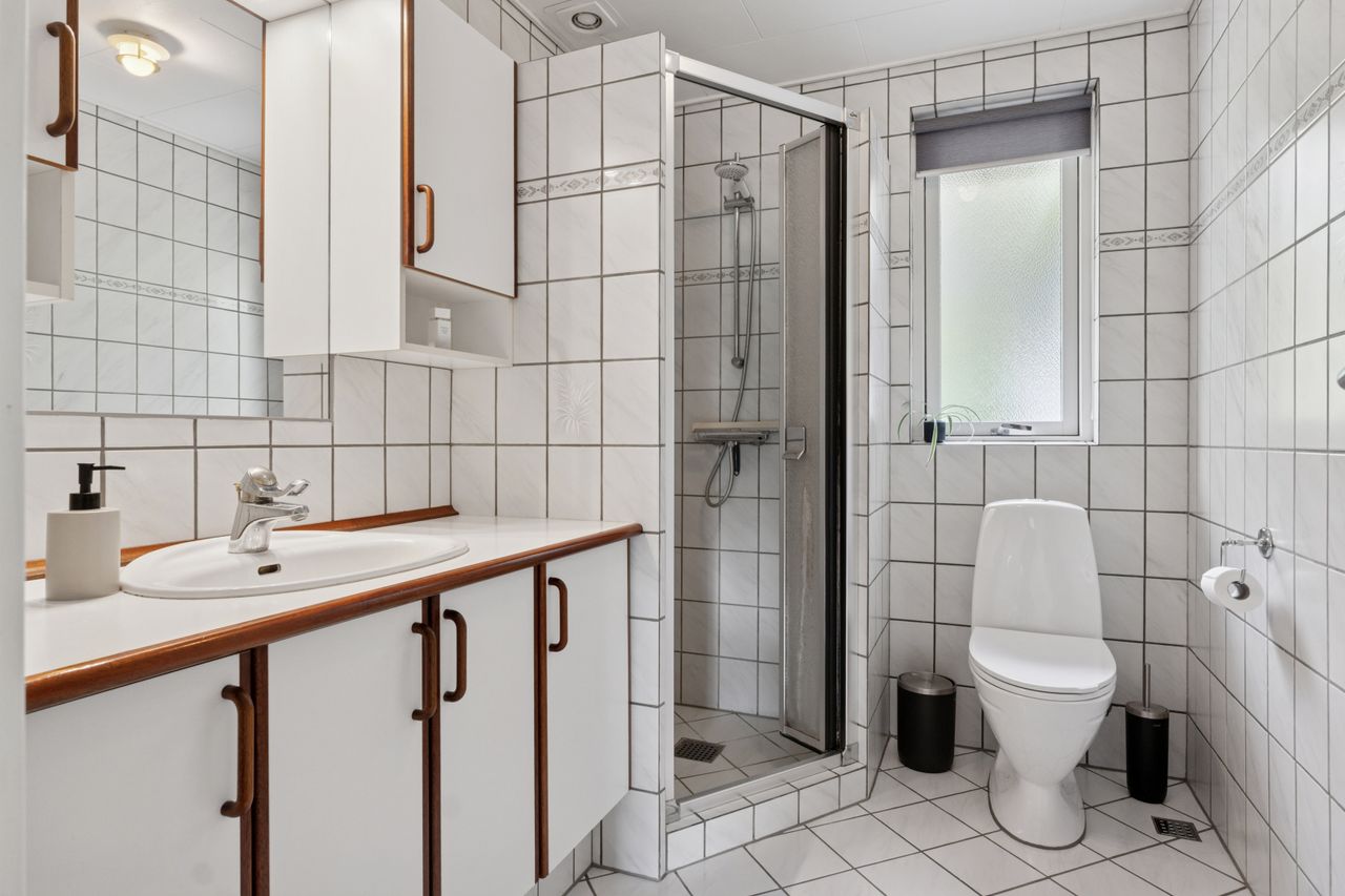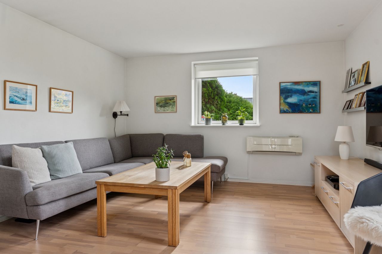 De tre værelser er samlet omkring fordelingsgangen, og det største værelse har indbygget skab. I denne ende af huset er der ligeledes et lyst flisebadeværelse med muret bruseniche, og afslutningsvis indeholder boligen en entré og et bryggers.