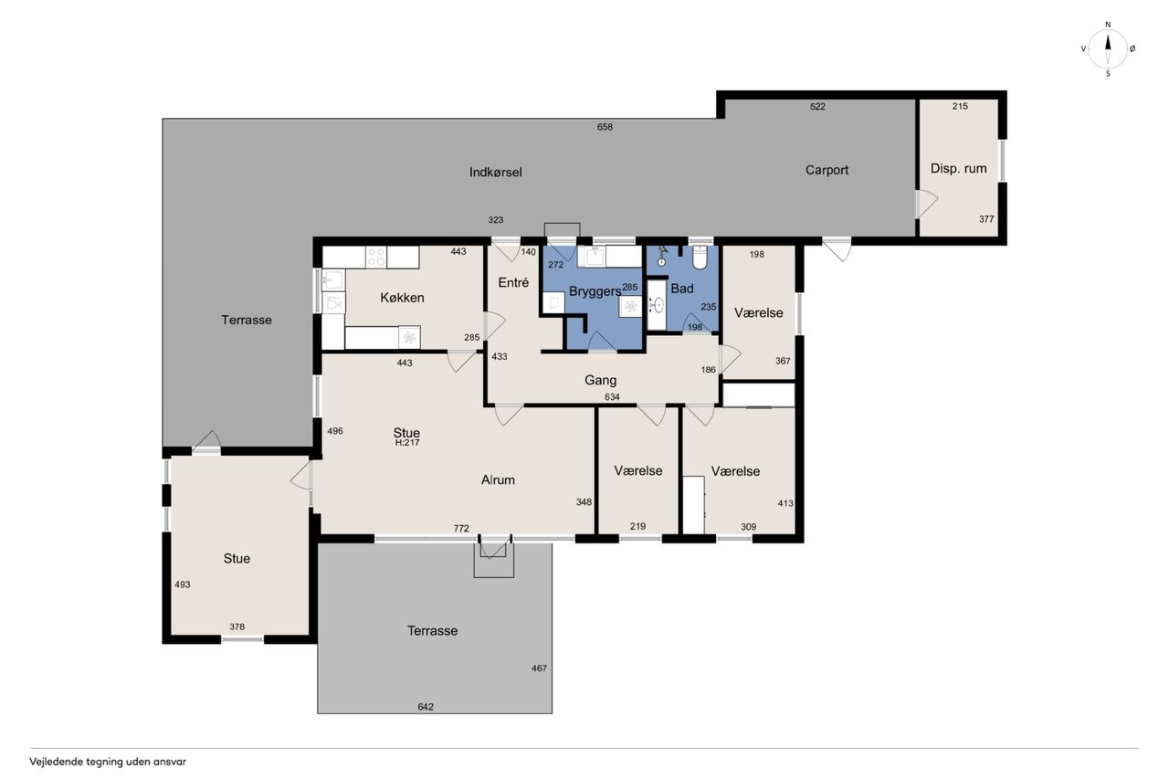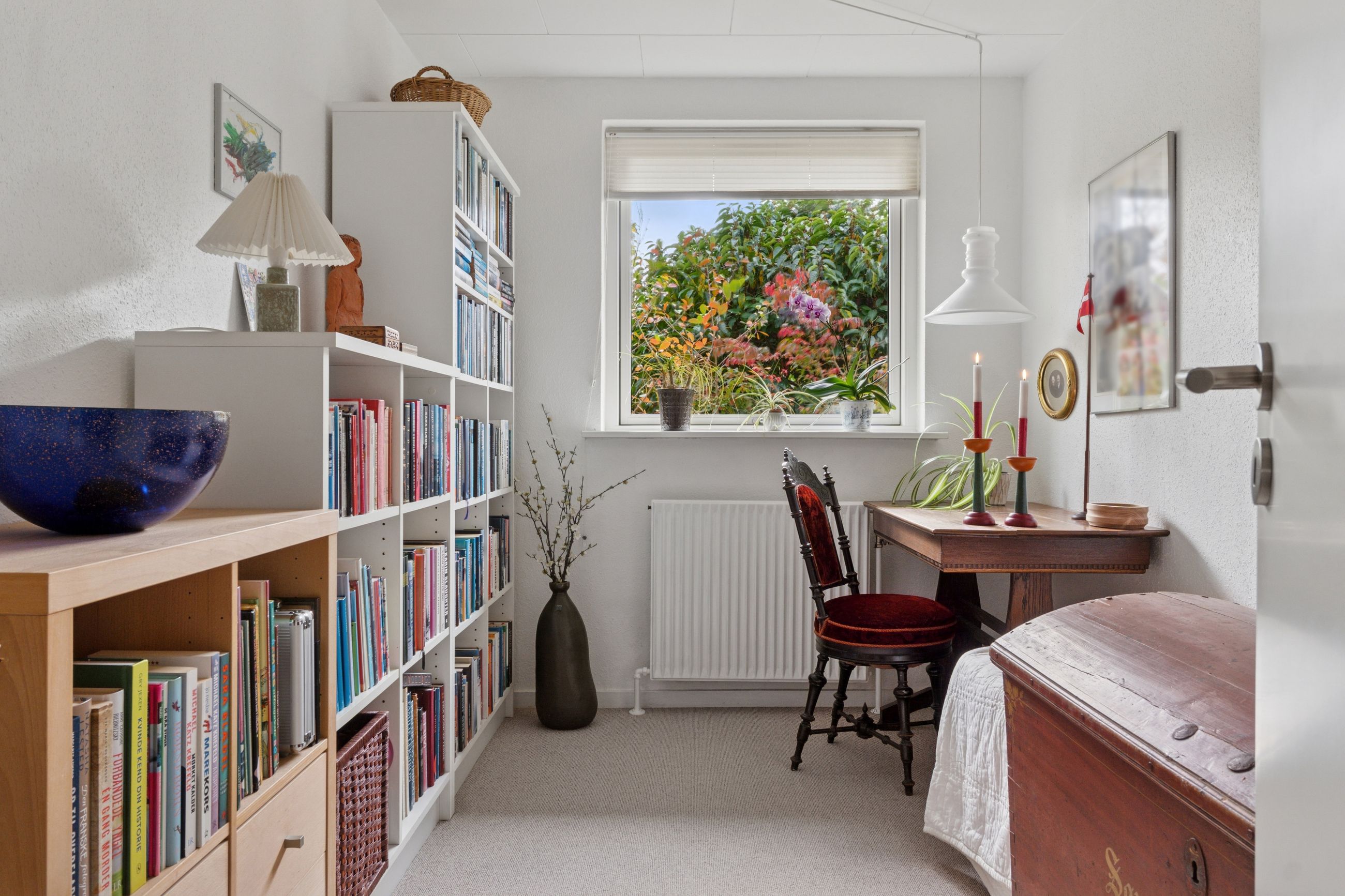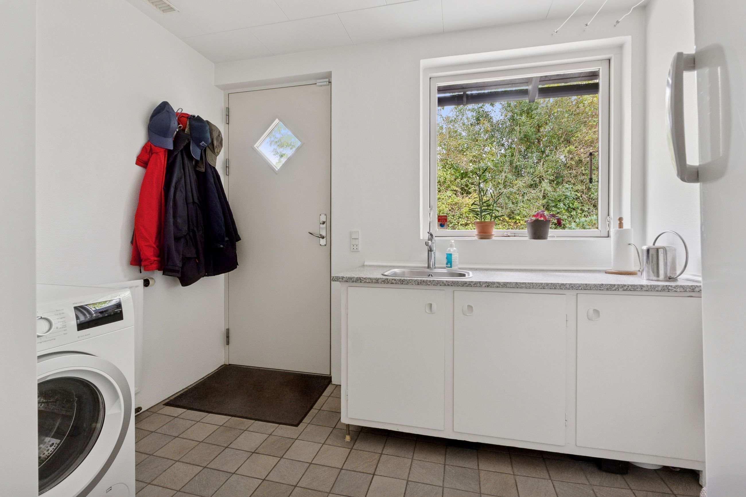 De tre værelser er samlet omkring fordelingsgangen, og det største værelse har indbygget skab. I denne ende af huset er der ligeledes et lyst flisebadeværelse med muret bruseniche, og afslutningsvis indeholder boligen en entré og et bryggers.
