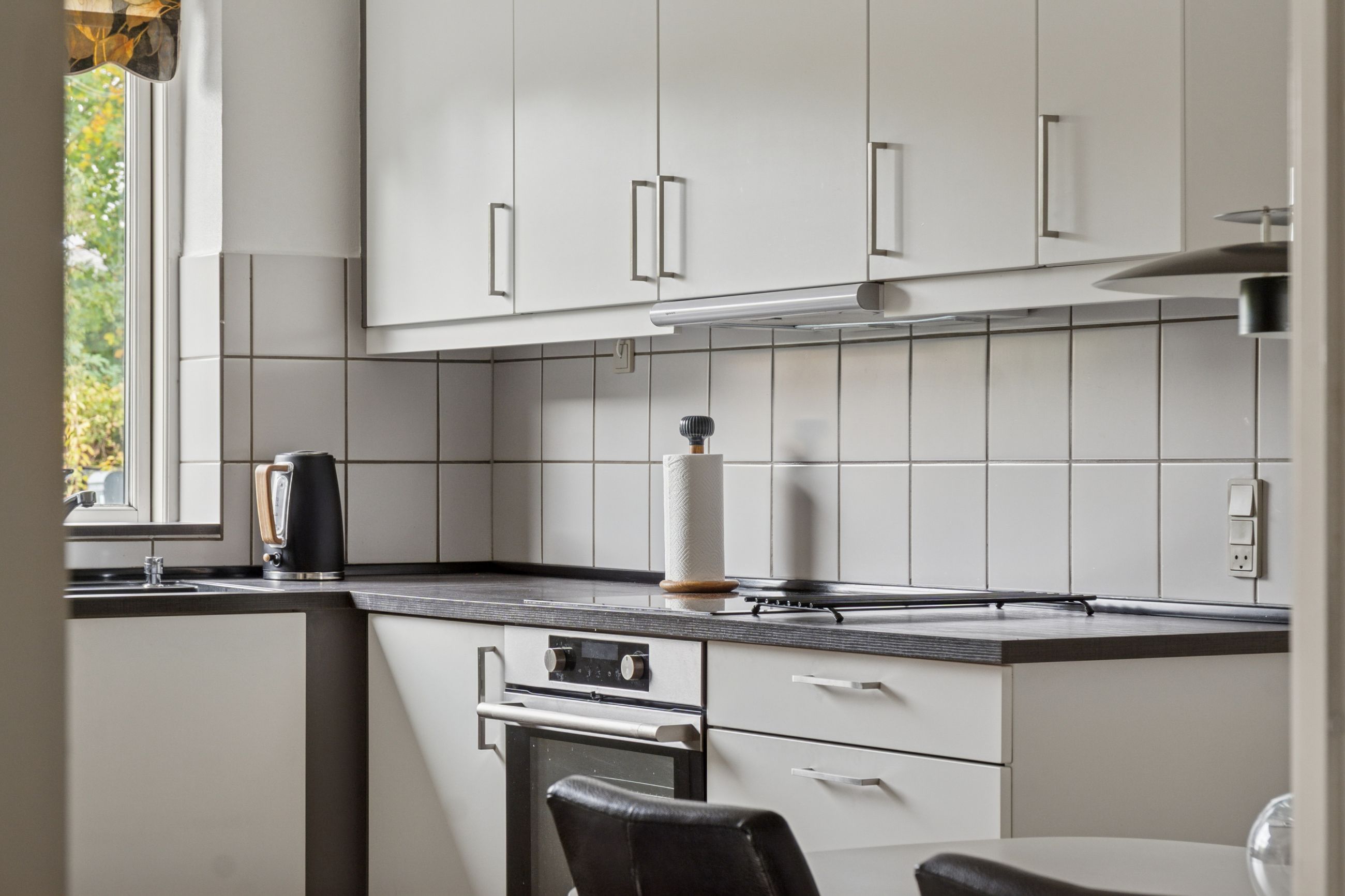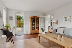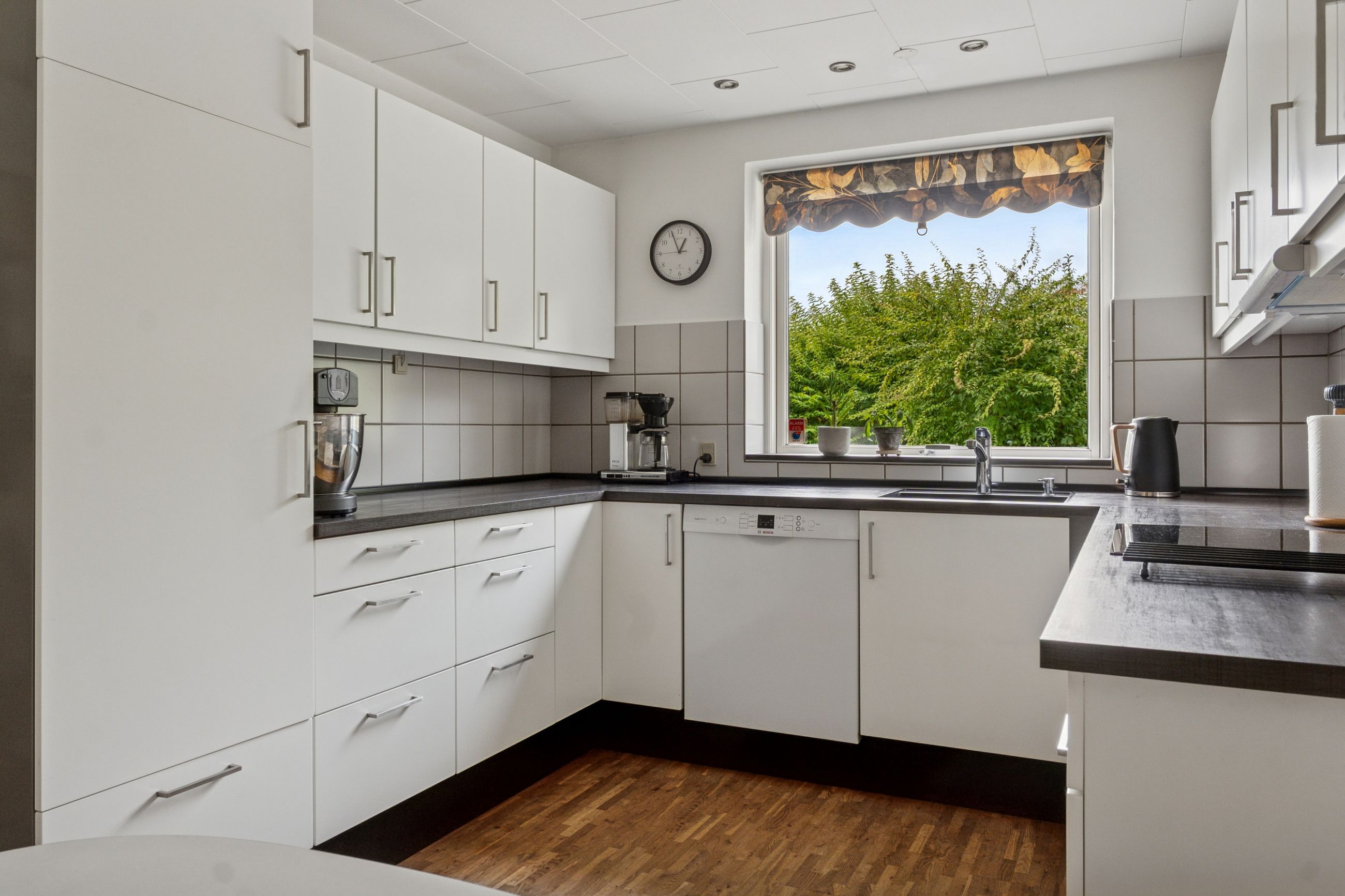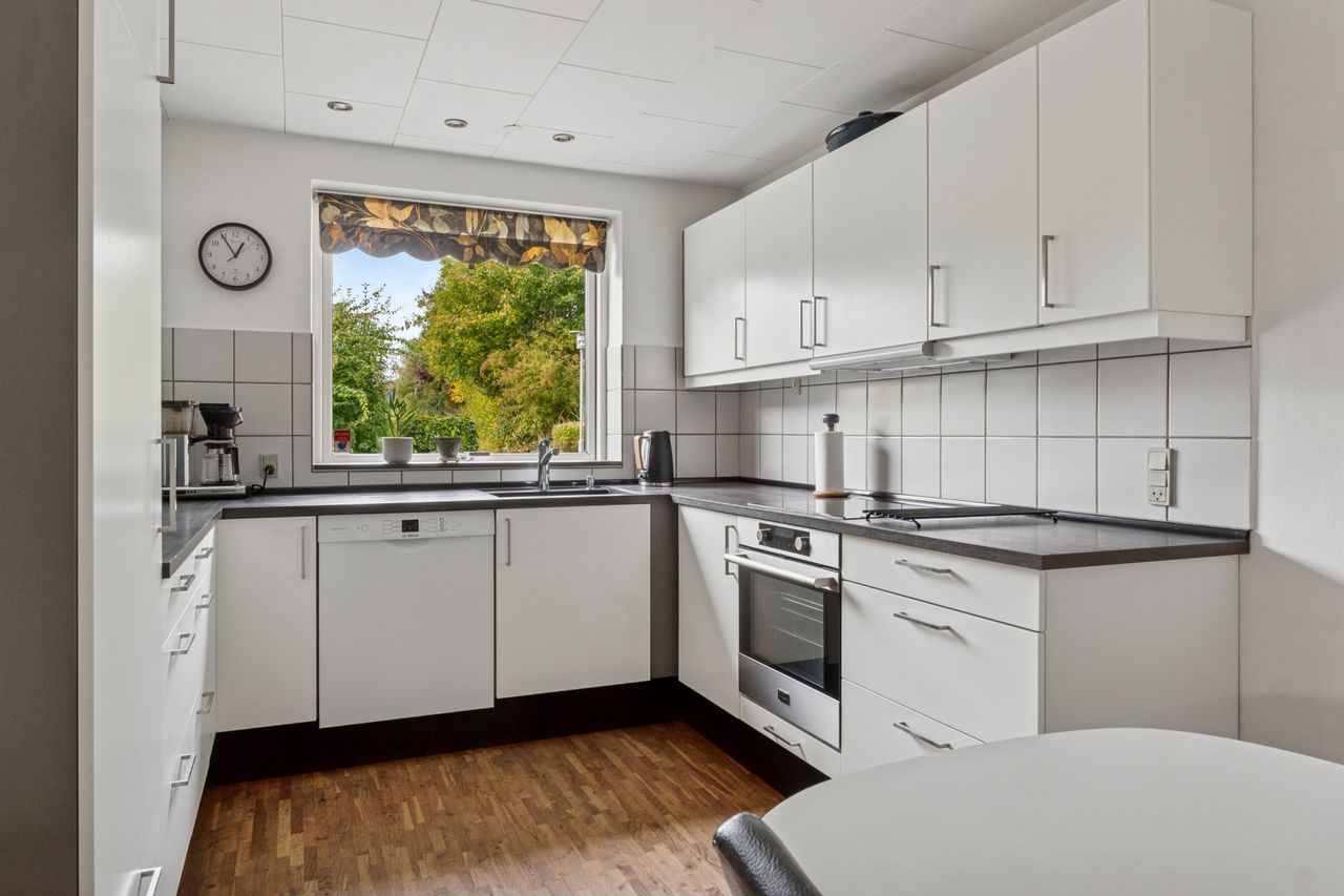 Side om side med stuemiljøet findes køkkenet, der er holdt i et klassisk hvidt design. Køkkenet er funktionelt udført med fine opbevaringsforhold, og der er mulighed for en god spiseplads.