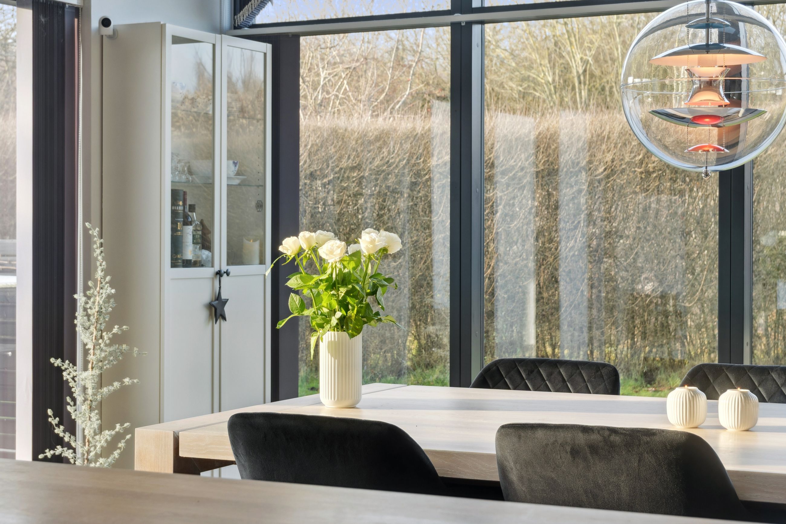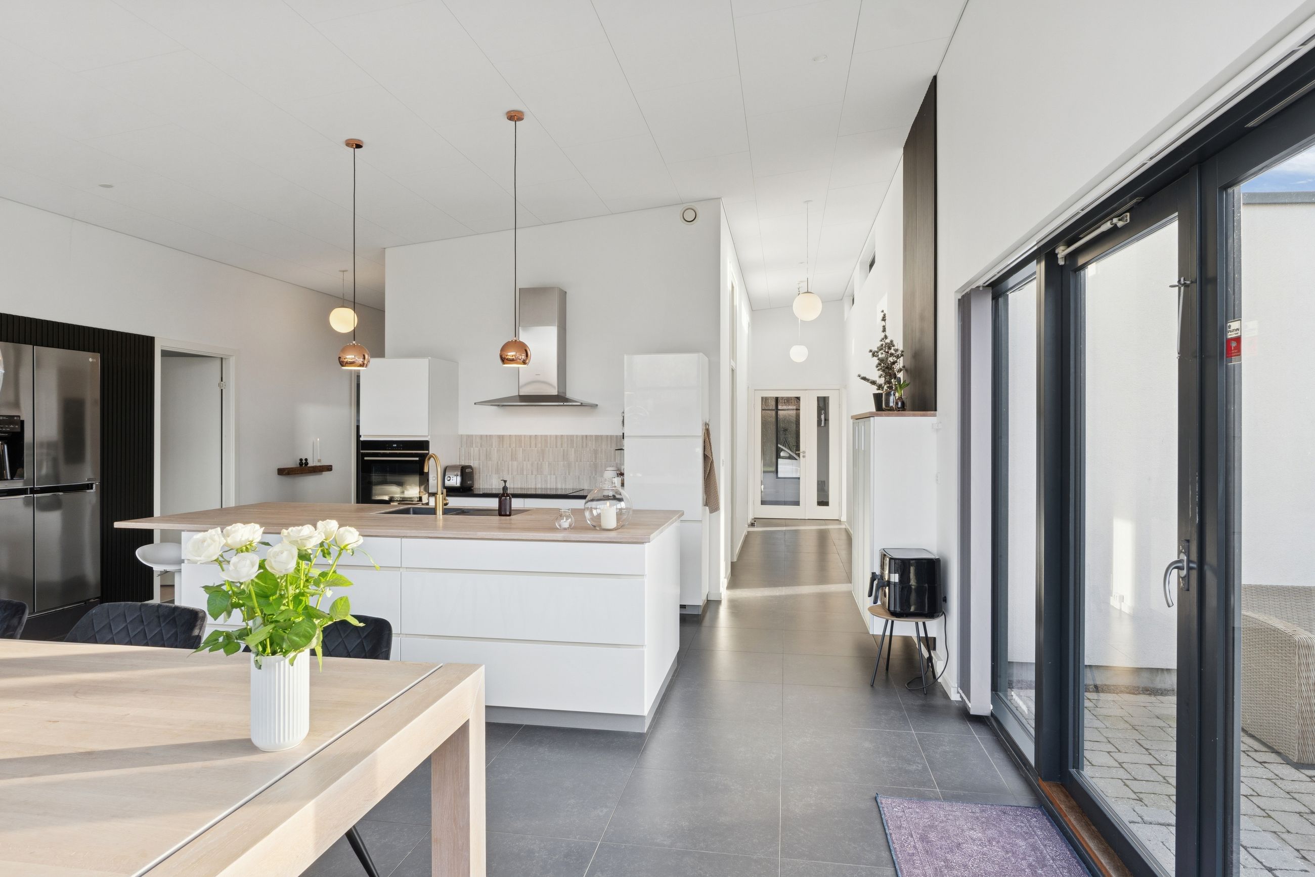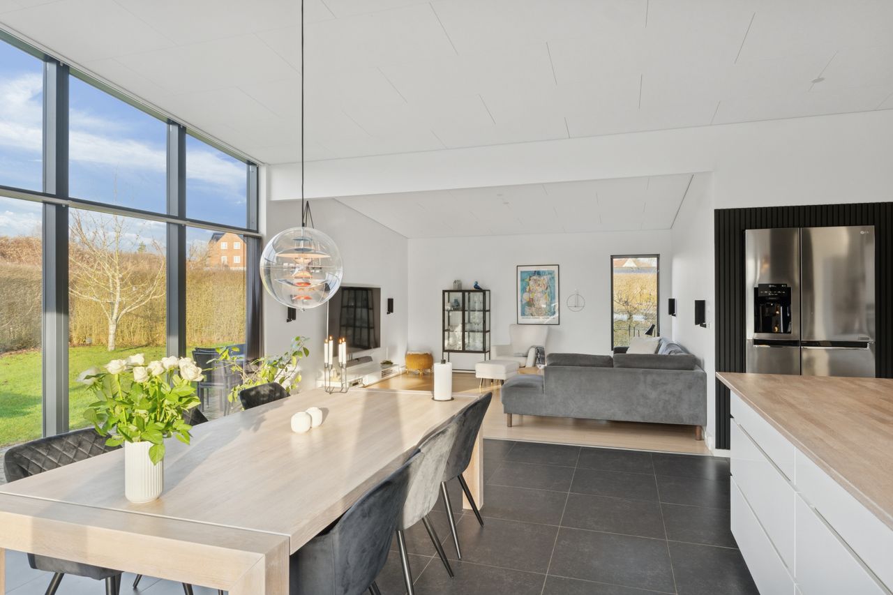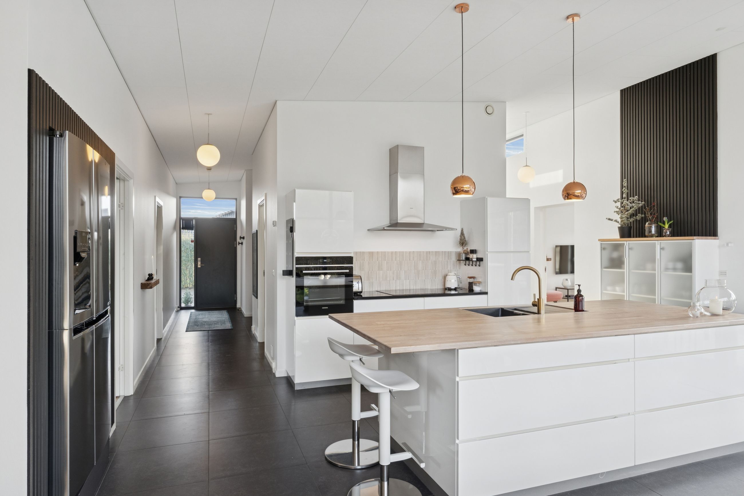 Ejendommen fremstår med et moderne udtryk og byder på vinduespartier, som sikrer et behageligt lysindfald i opholdsarealerne. Boligens naturlige samlingspunkt er det åbne opholdsrum, hvor køkken-alrum og stue er samlet i én indbydende helhed. Her er god plads til både spiseafdeling og sofaområde, og de store glaspartier skaber en glidende overgang til terrassen og haven. Køkkenet er centralt placeret og indrettet med en køkkenø, der giver ekstra arbejdsplads og binder rummet flot sammen.
