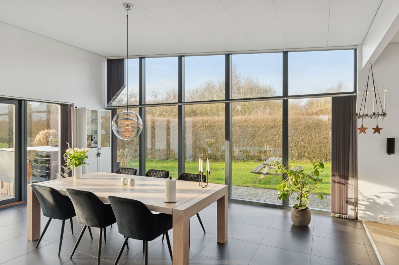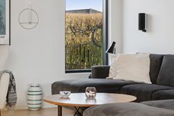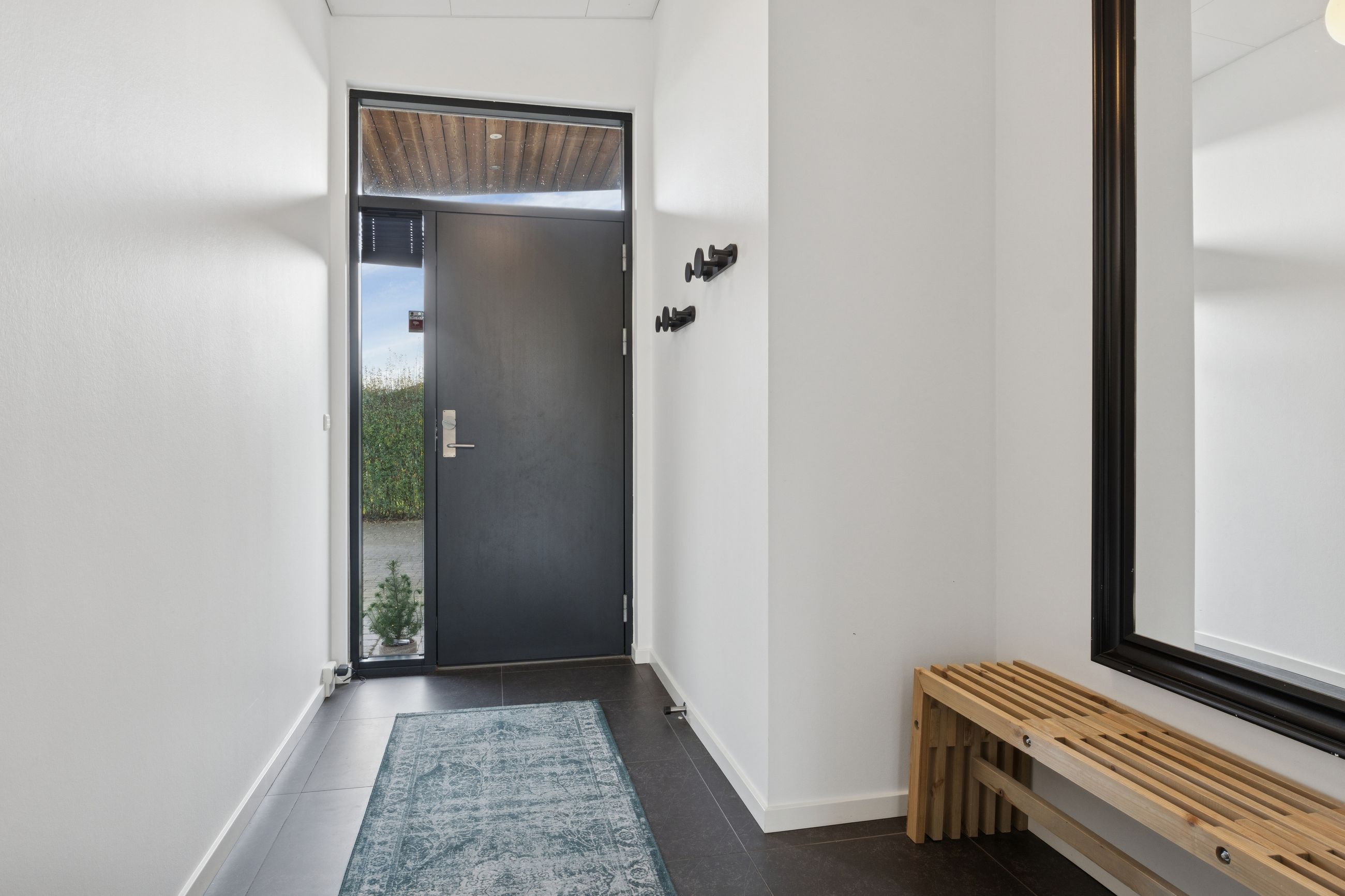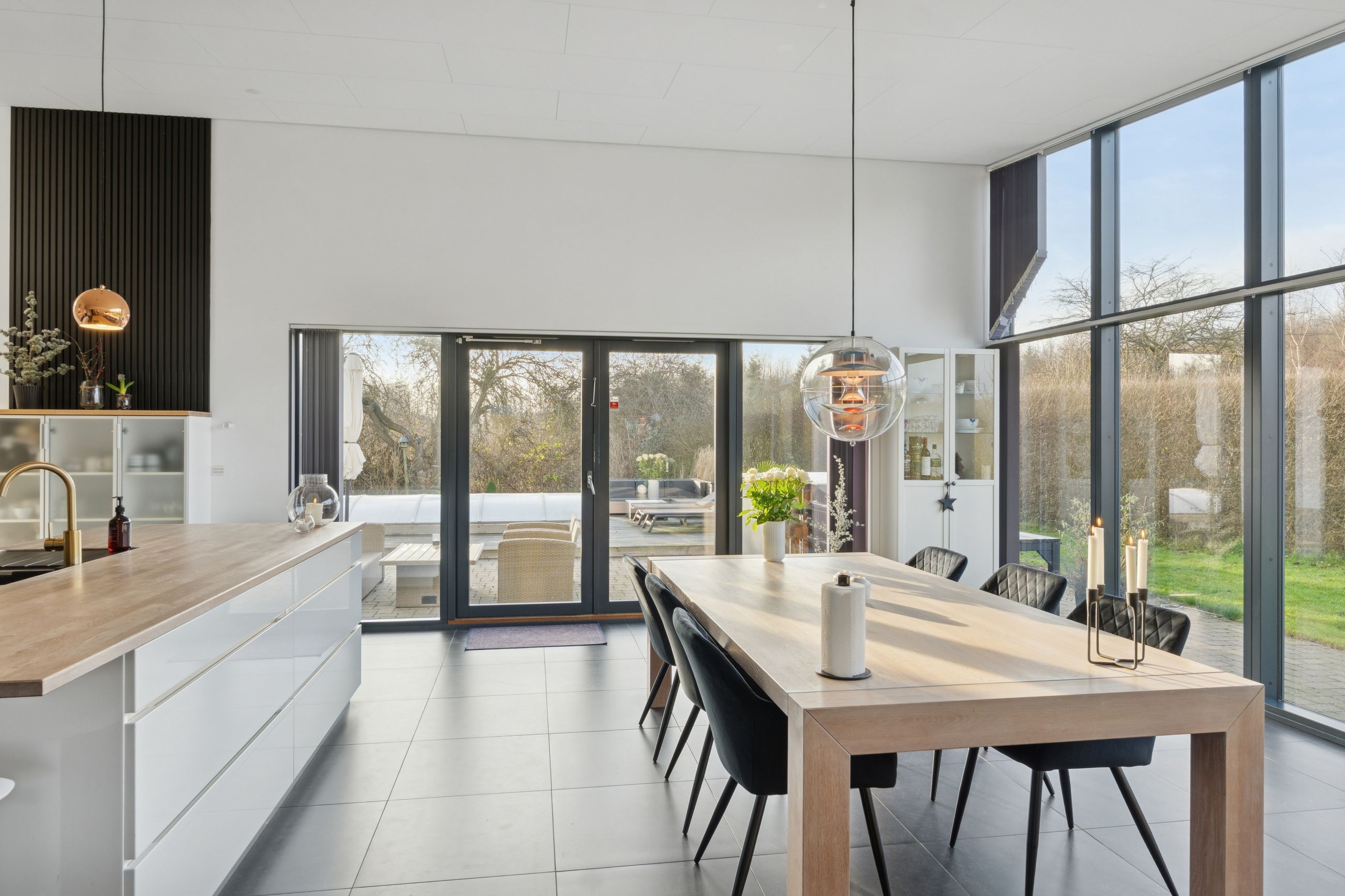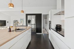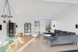 Ejendommen fremstår med et moderne udtryk og byder på vinduespartier, som sikrer et behageligt lysindfald i opholdsarealerne. Boligens naturlige samlingspunkt er det åbne opholdsrum, hvor køkken-alrum og stue er samlet i én indbydende helhed. Her er god plads til både spiseafdeling og sofaområde, og de store glaspartier skaber en glidende overgang til terrassen og haven. Køkkenet er centralt placeret og indrettet med en køkkenø, der giver ekstra arbejdsplads og binder rummet flot sammen.