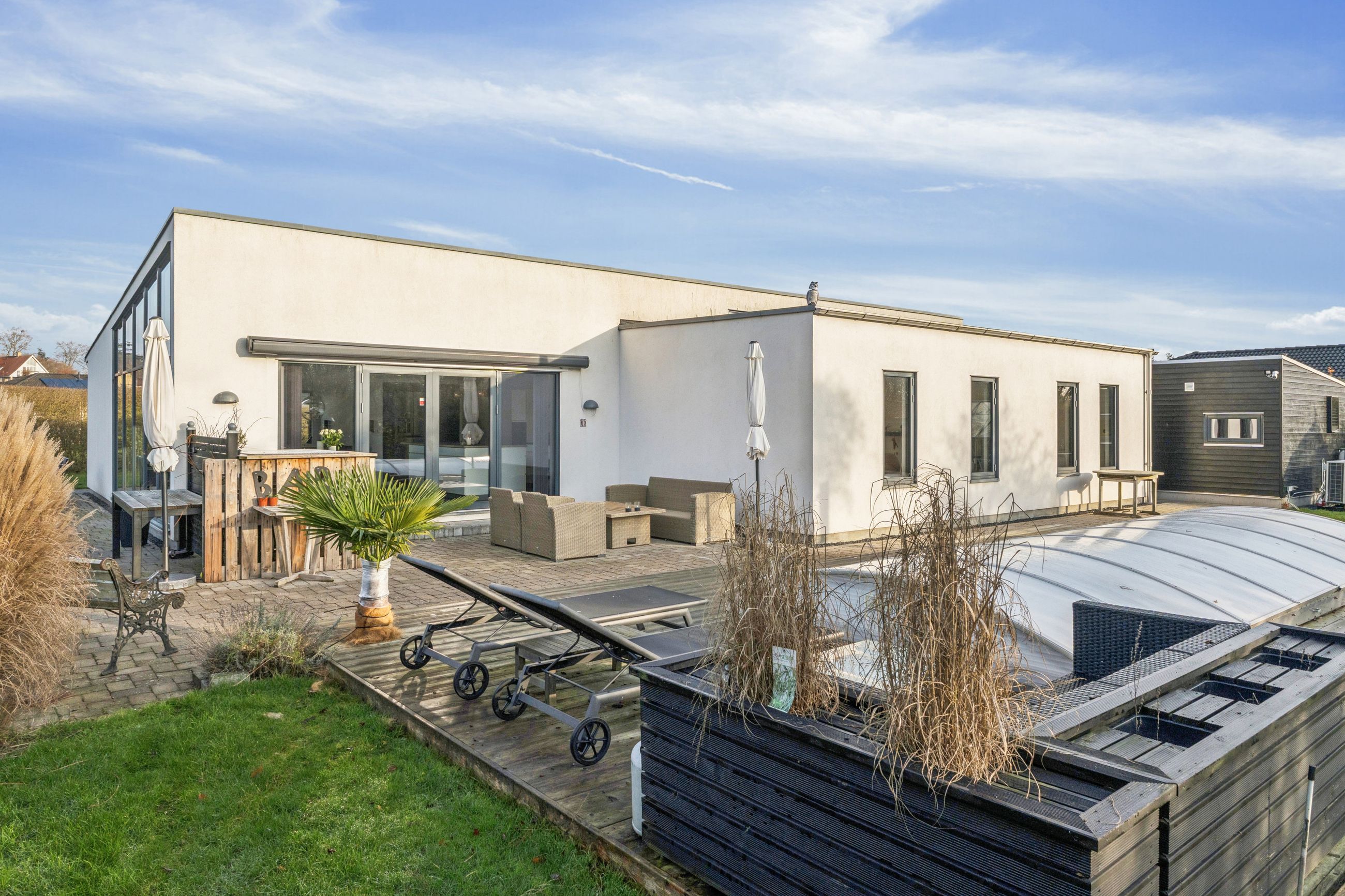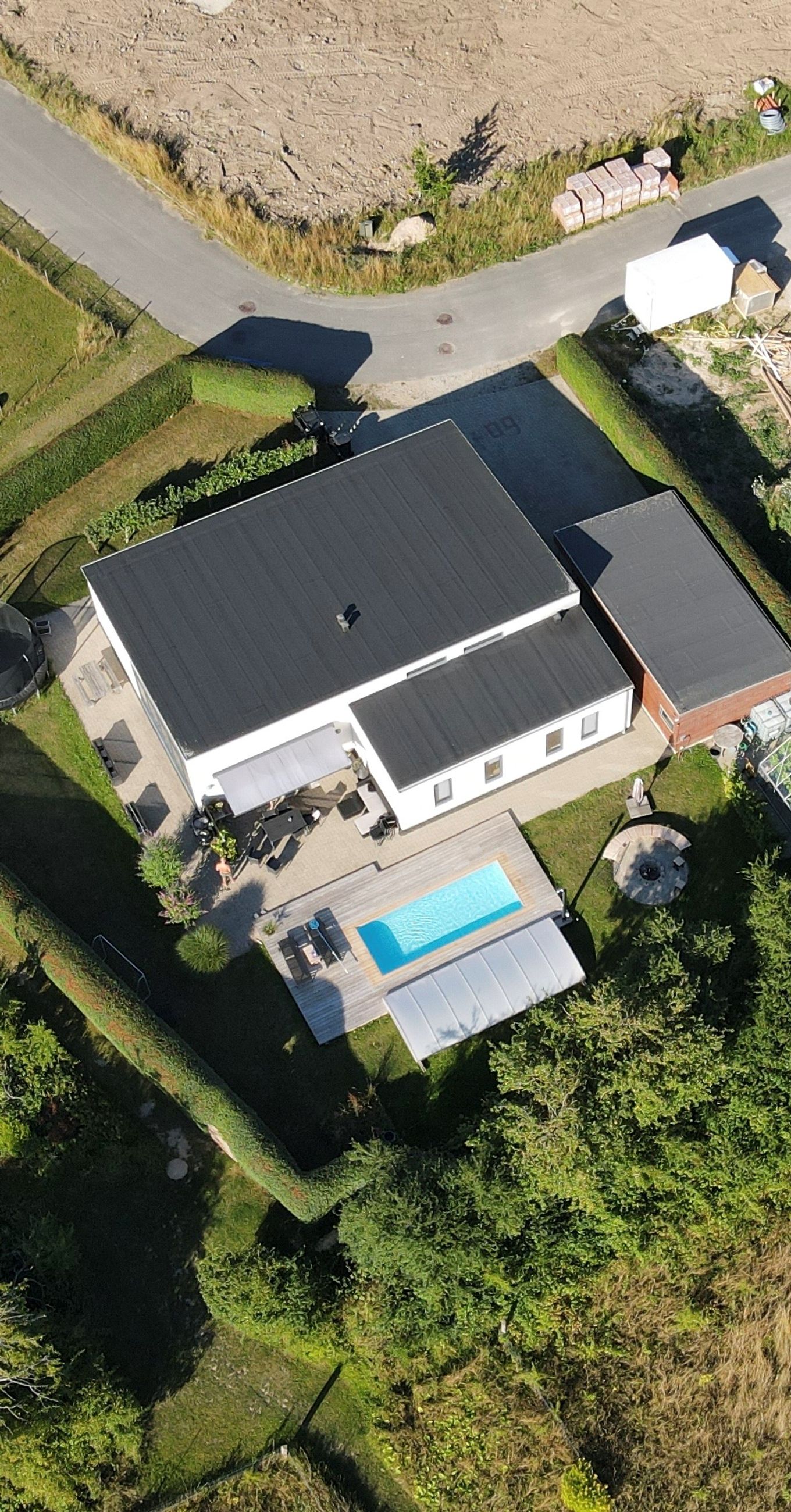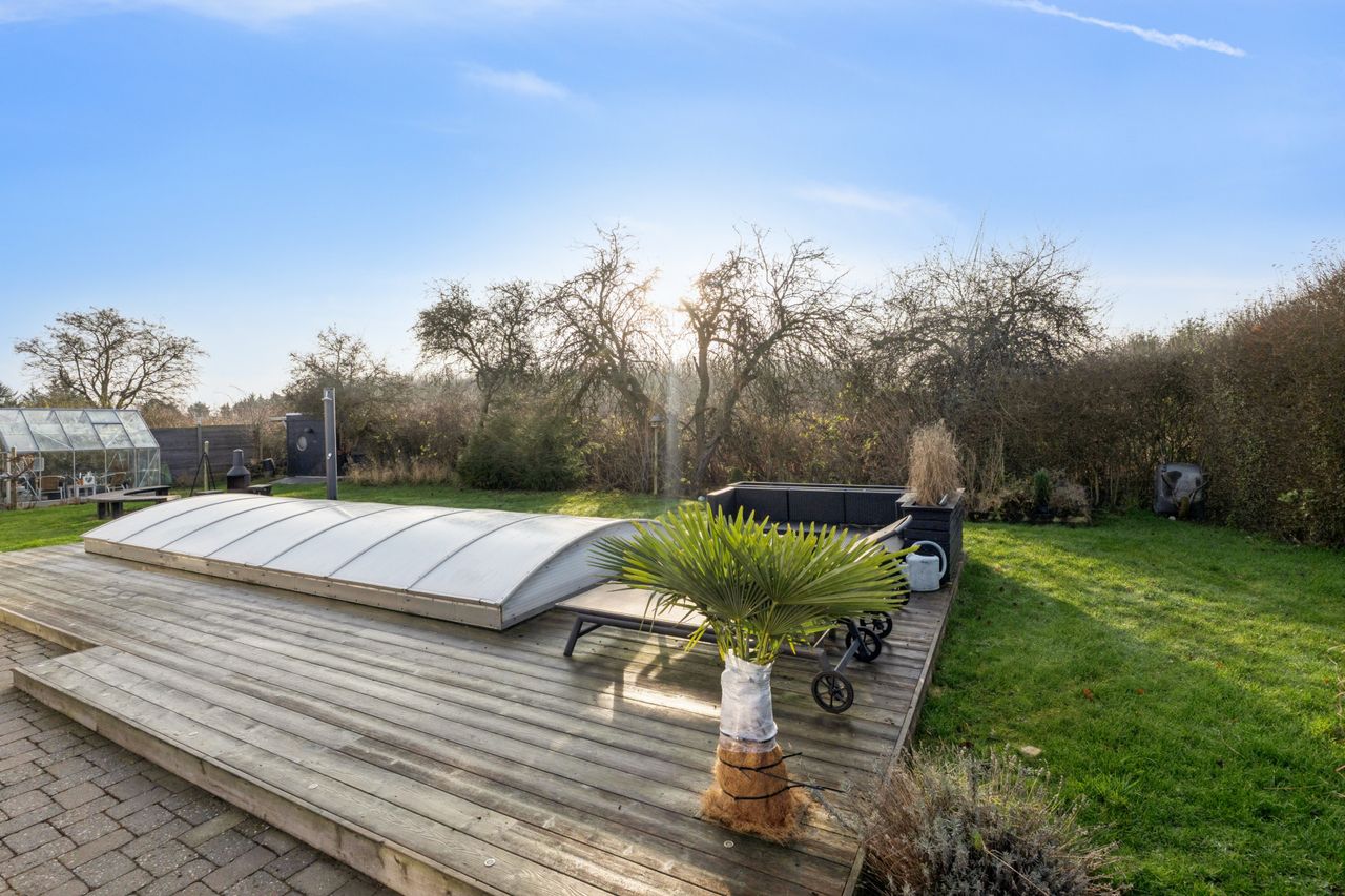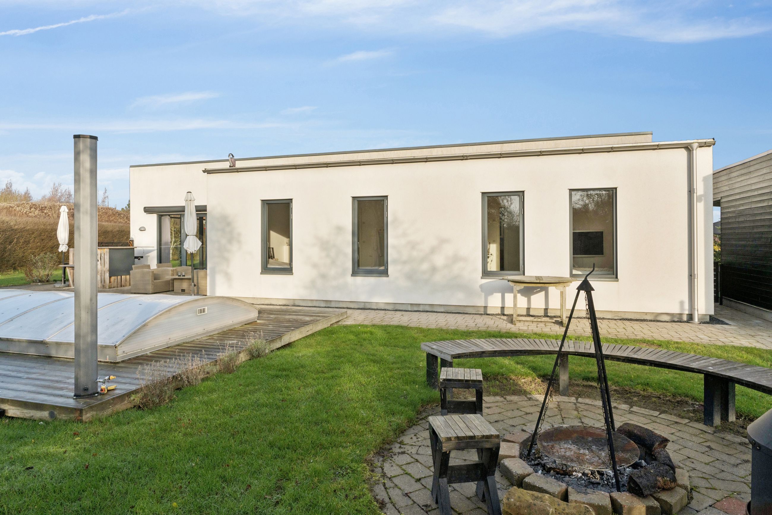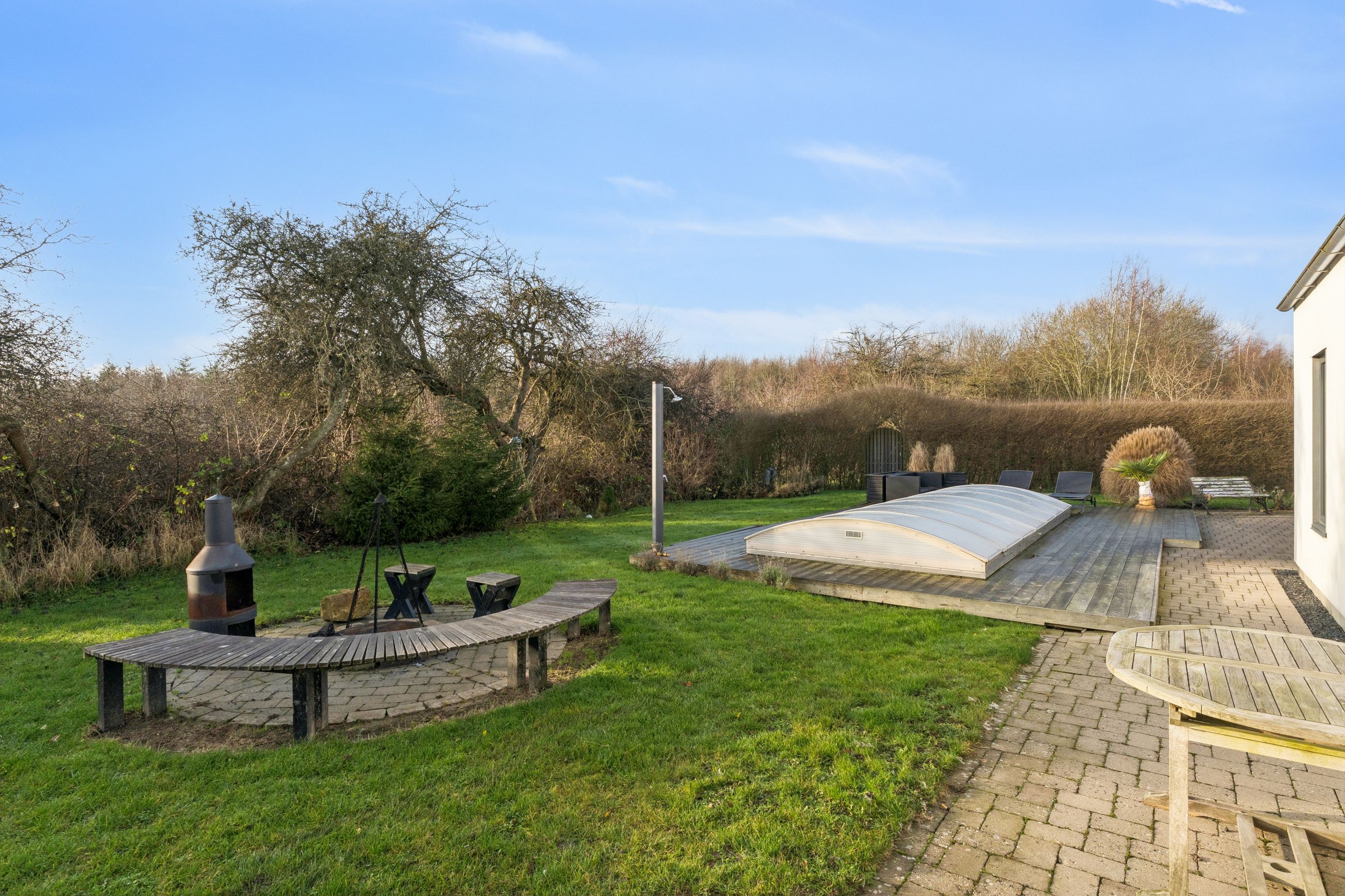 Udenfor venter flere terrasser, som ligger i naturlig forlængelse af huset og giver mulighed for at nyde udelivet dagen igennem. Haven er anlagt med græsplæne og enkelte træer og byder på god plads til både leg og afslapning. Som et ekstra plus rummer grunden et overdækket poolområde samt et hyggeligt bålsted, der tilfører ejendommen ekstra uderum og anvendelsesmuligheder.