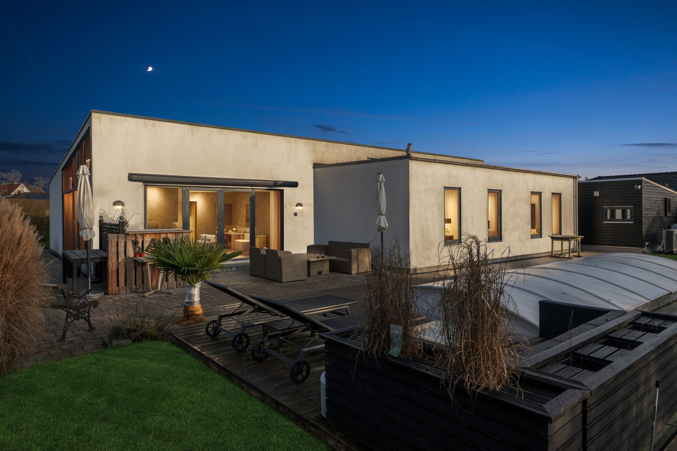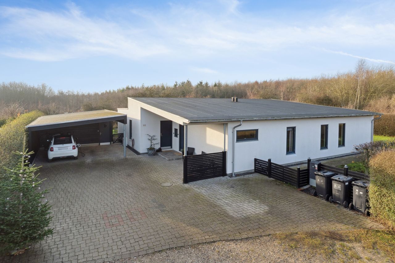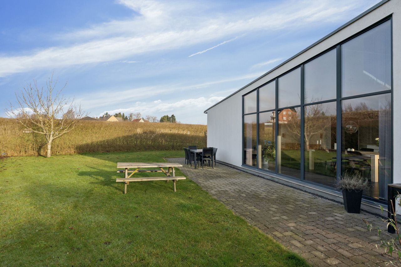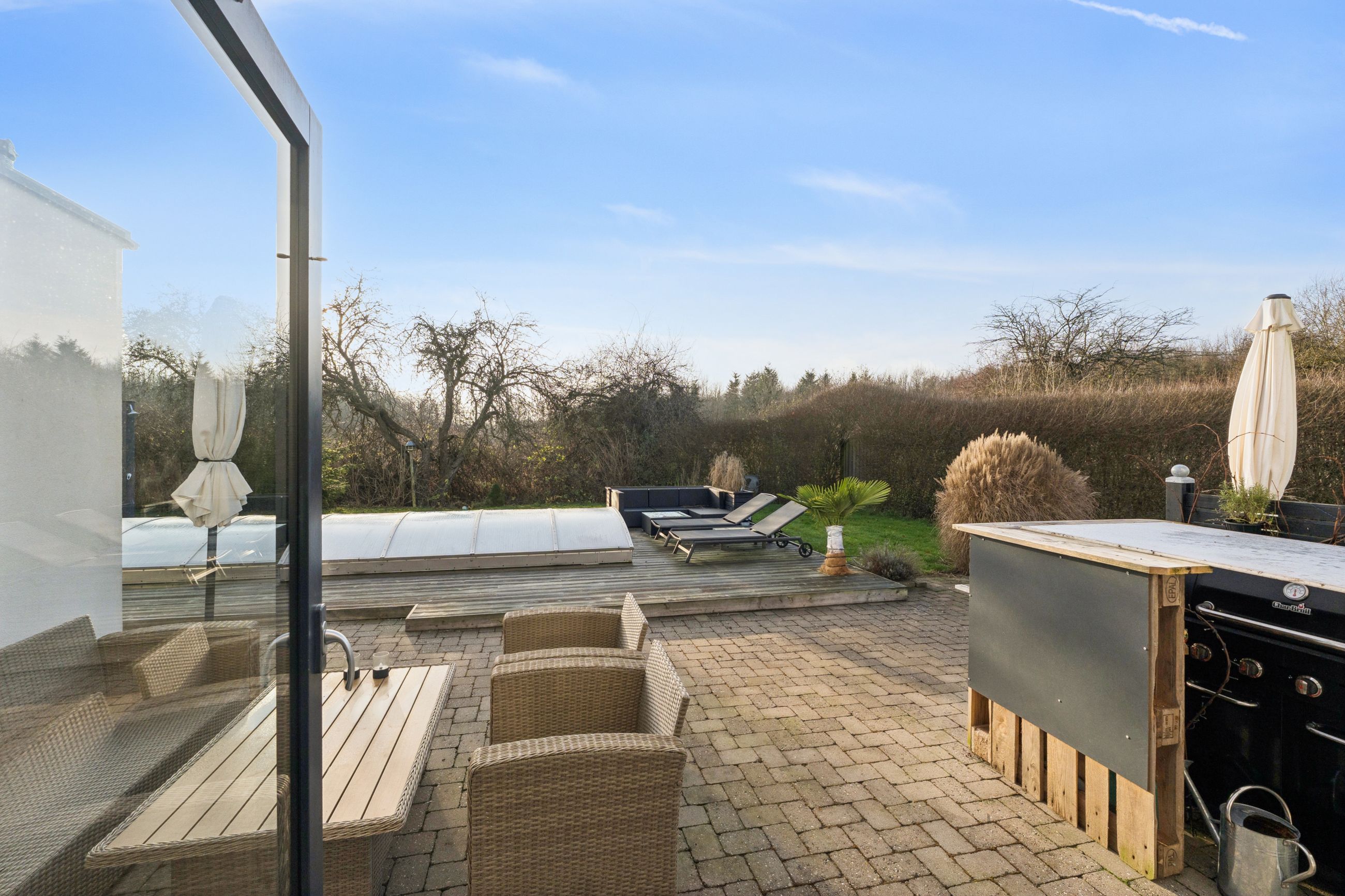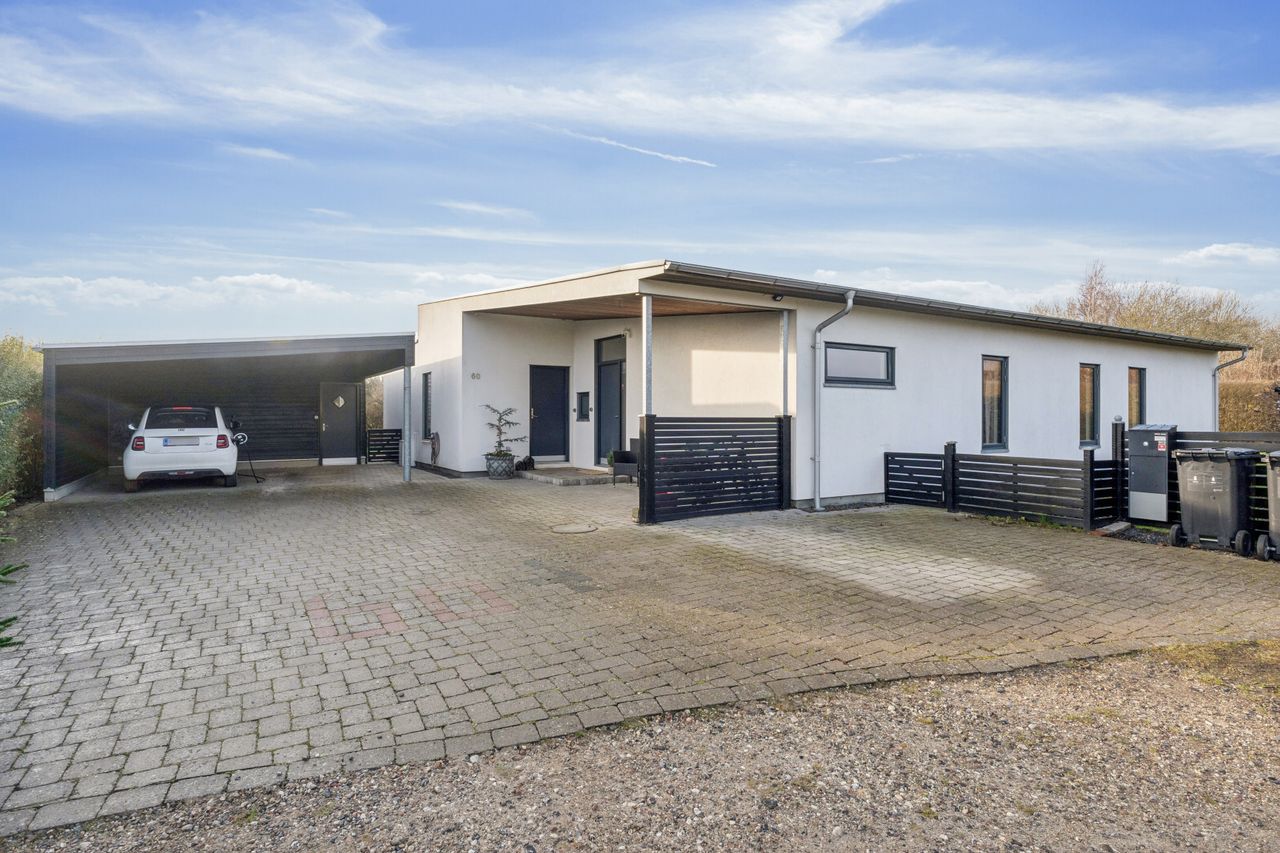Udenfor venter flere terrasser, som ligger i naturlig forlængelse af huset og giver mulighed for at nyde udelivet dagen igennem. Haven er anlagt med græsplæne og enkelte træer og byder på god plads til både leg og afslapning. Som et ekstra plus rummer grunden et overdækket poolområde samt et hyggeligt bålsted, der tilfører ejendommen ekstra uderum og anvendelsesmuligheder.