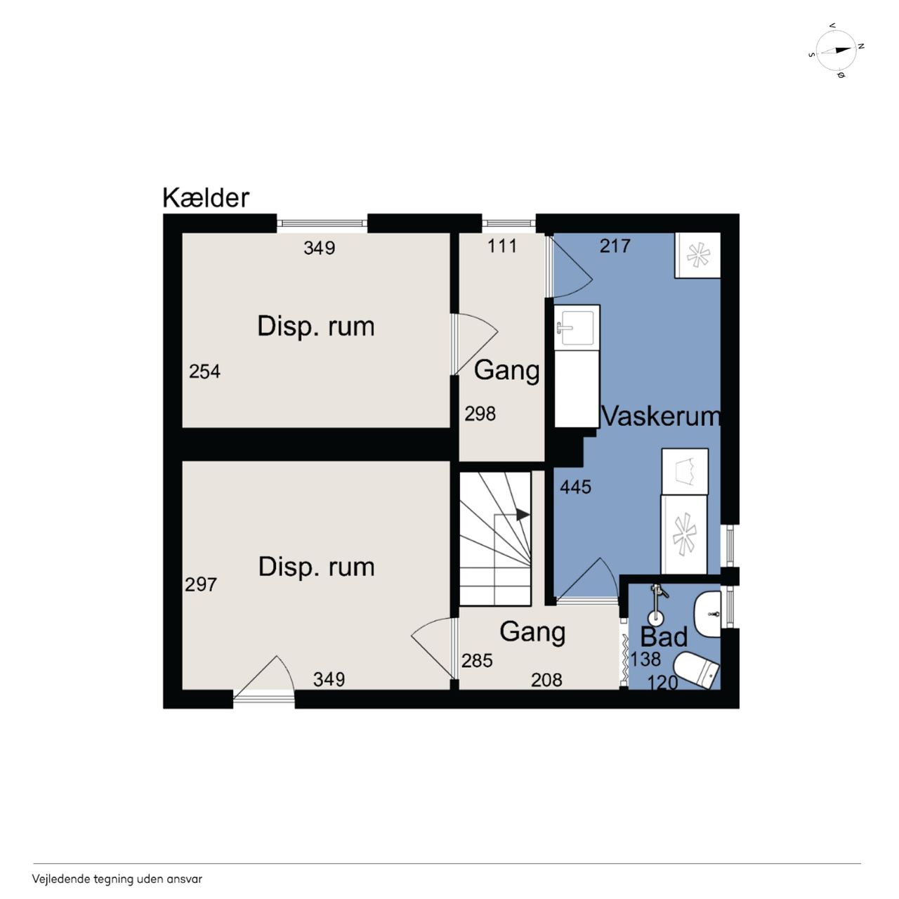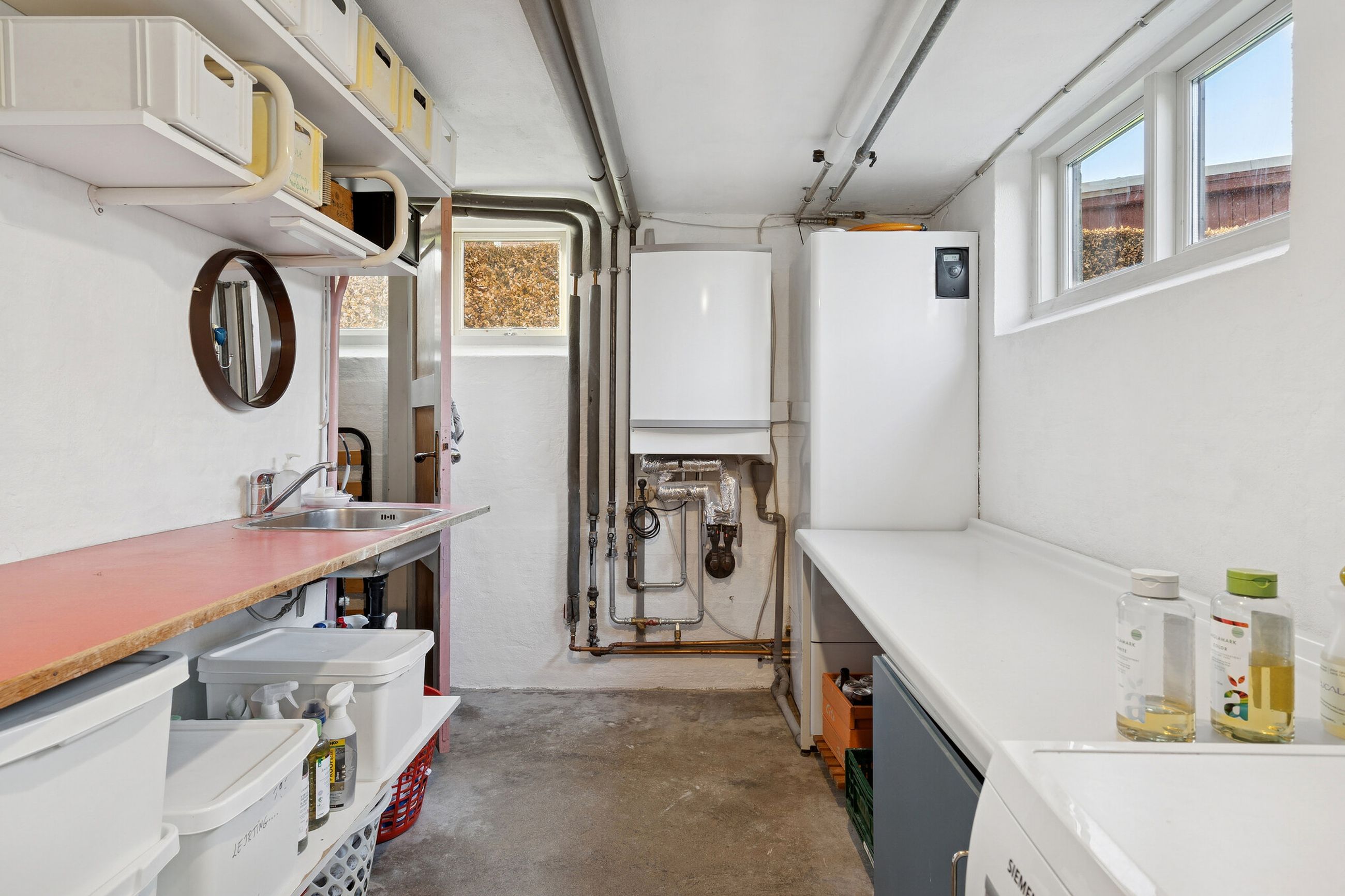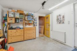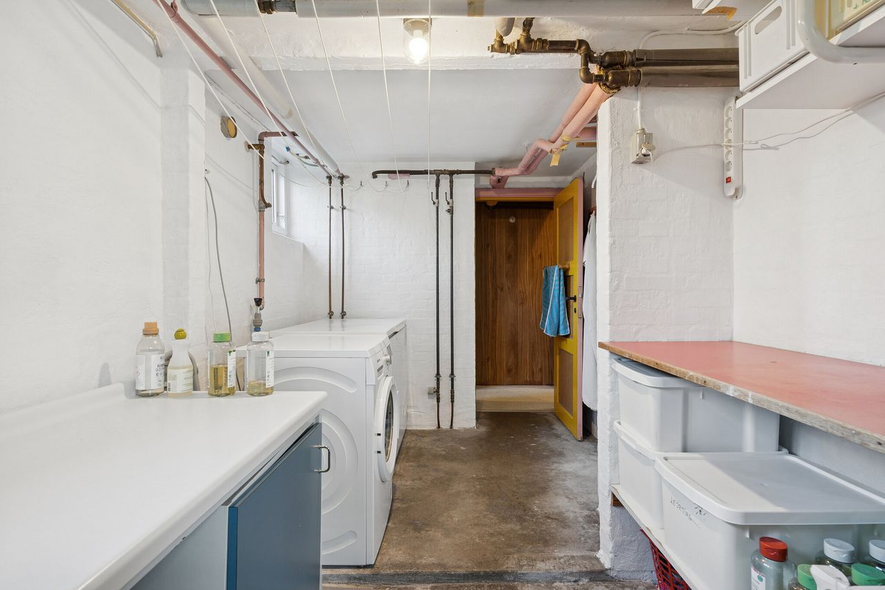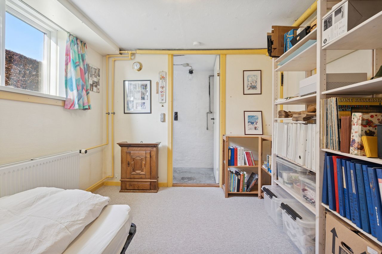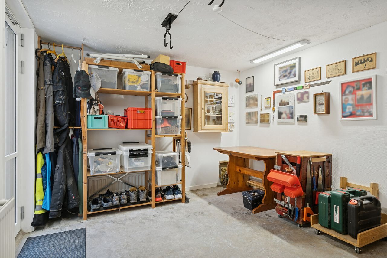 Kælderen indeholder et flisebadeværelse, et praktisk vaskerum og et værksted samt et godt disponibelt rum med mange anvendelsesmuligheder.