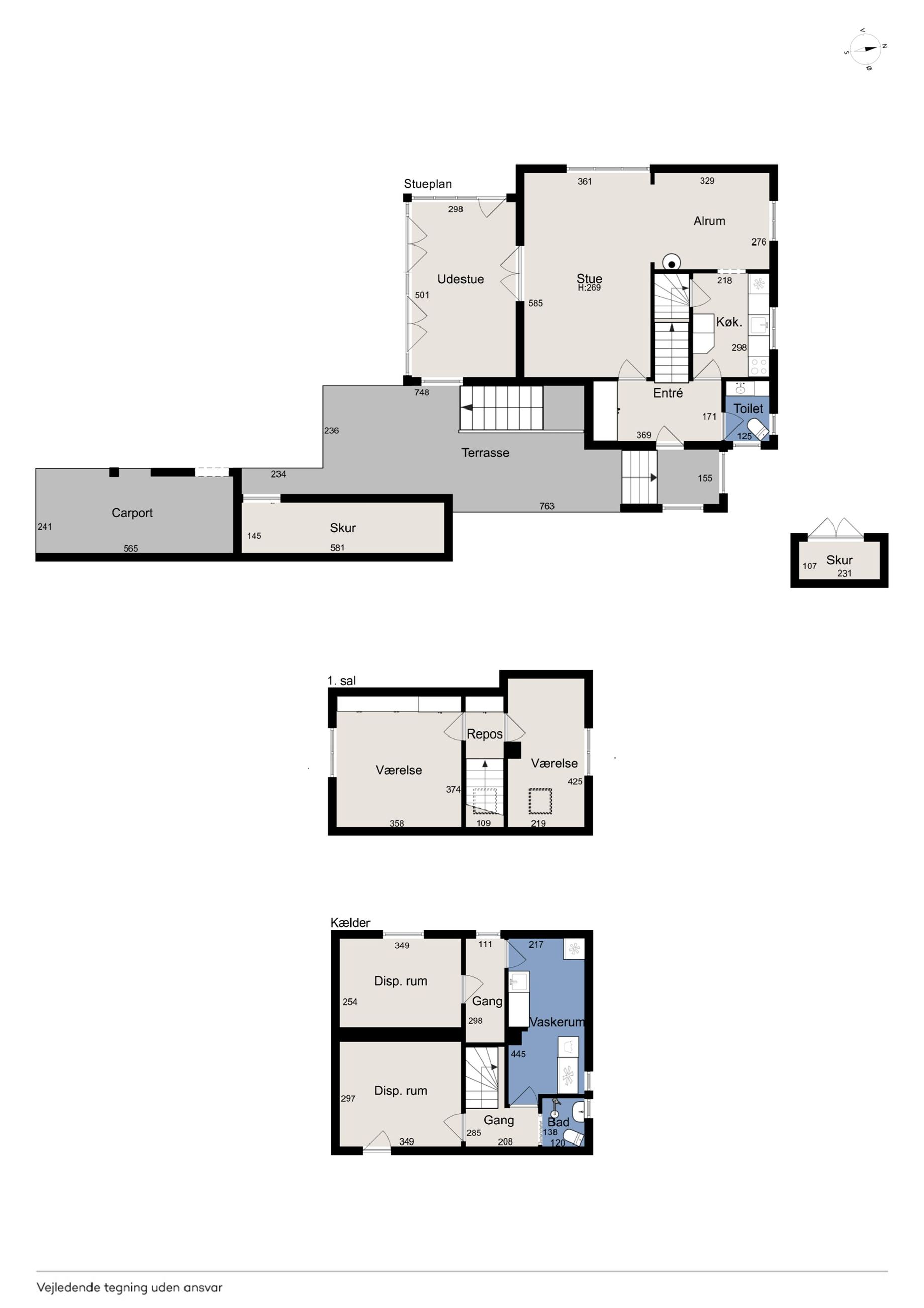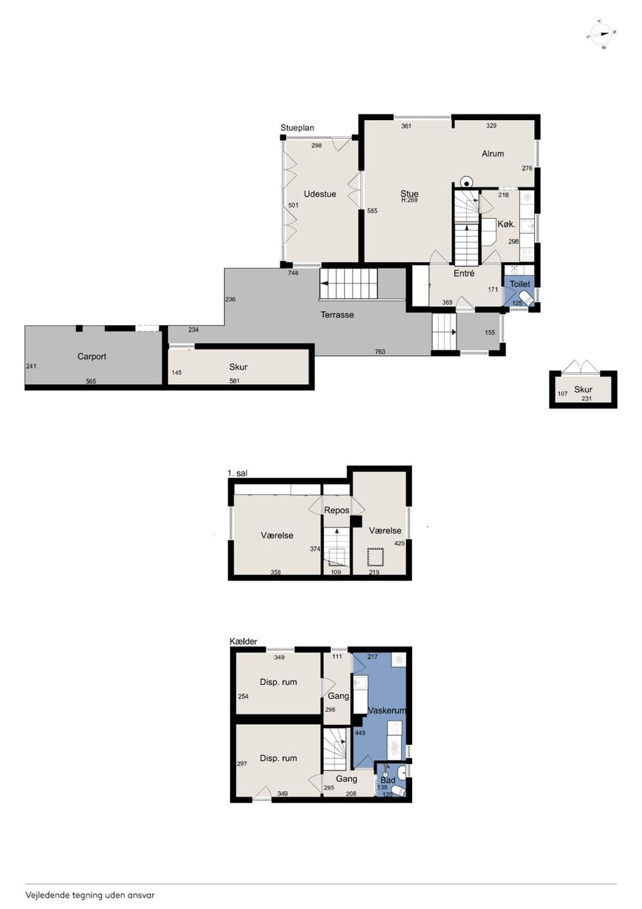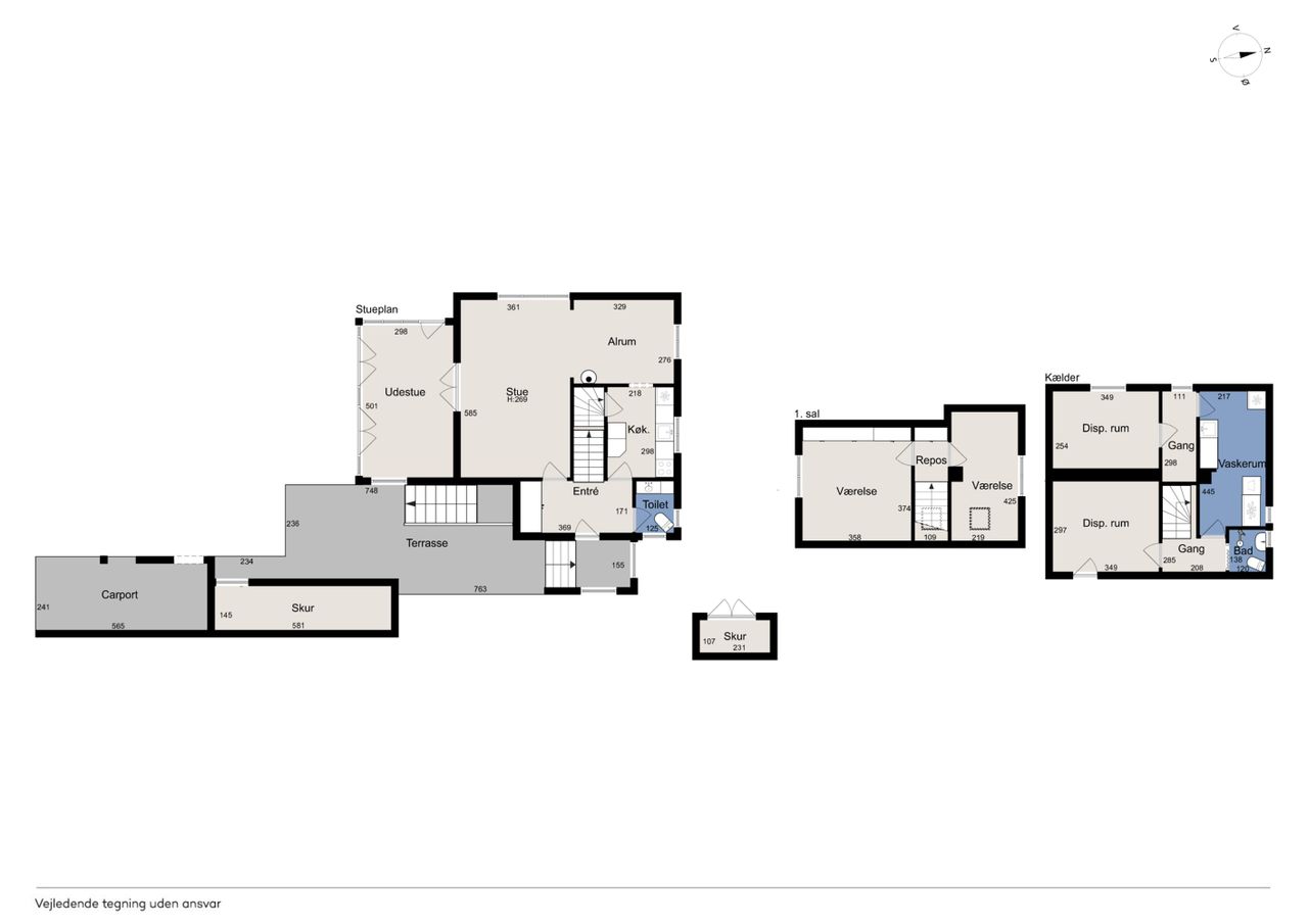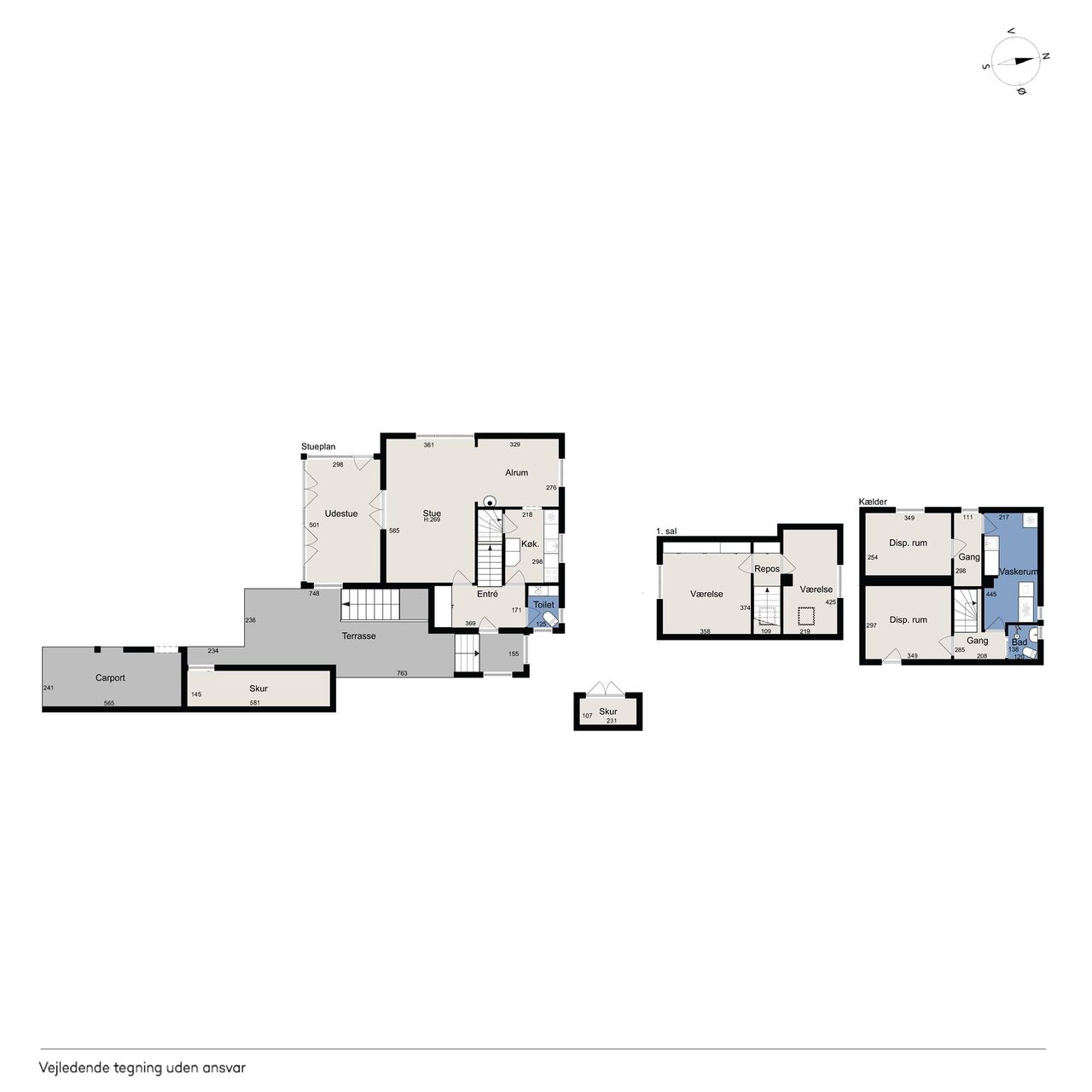 Kælderen indeholder et flisebadeværelse, et praktisk vaskerum og et værksted samt et godt disponibelt rum med mange anvendelsesmuligheder.