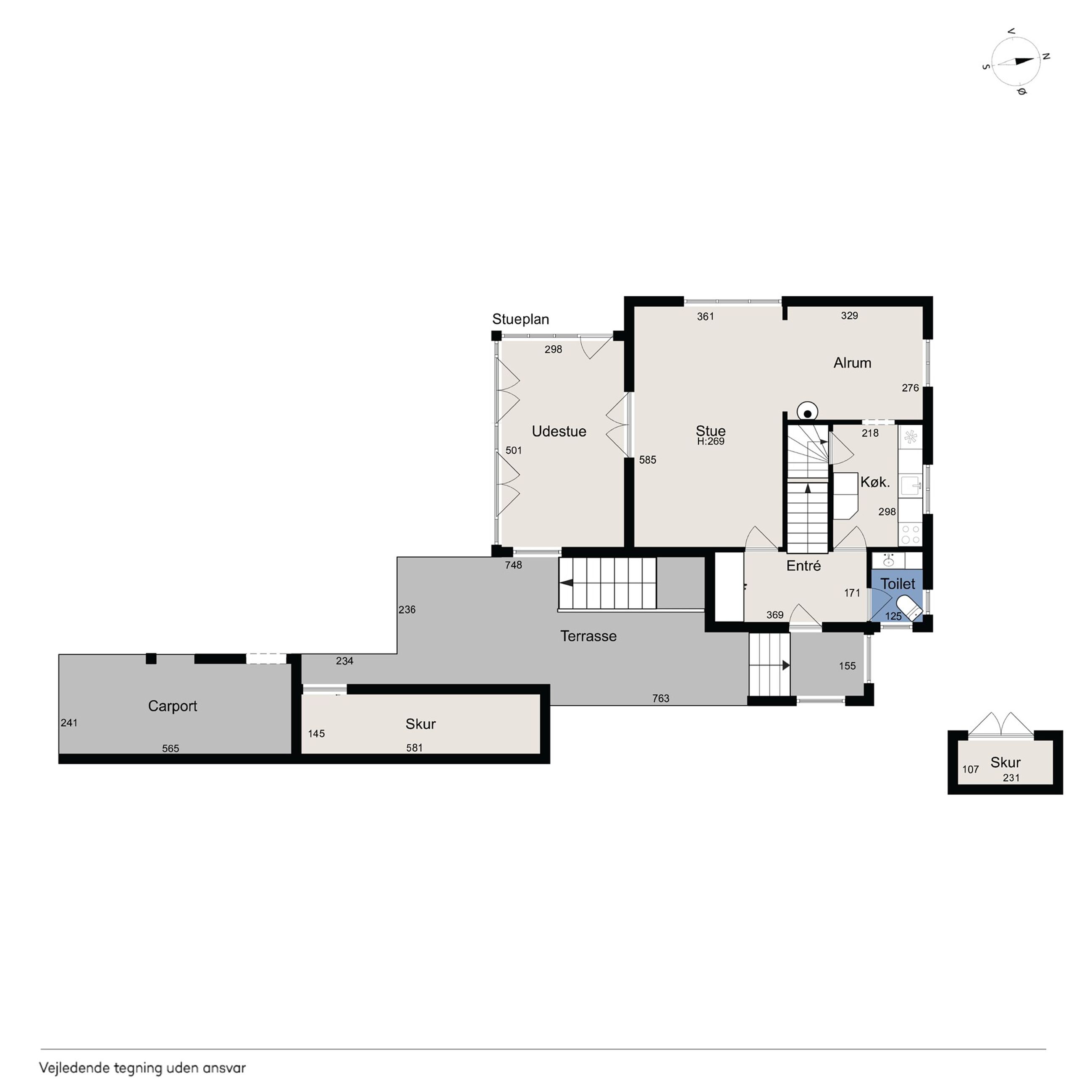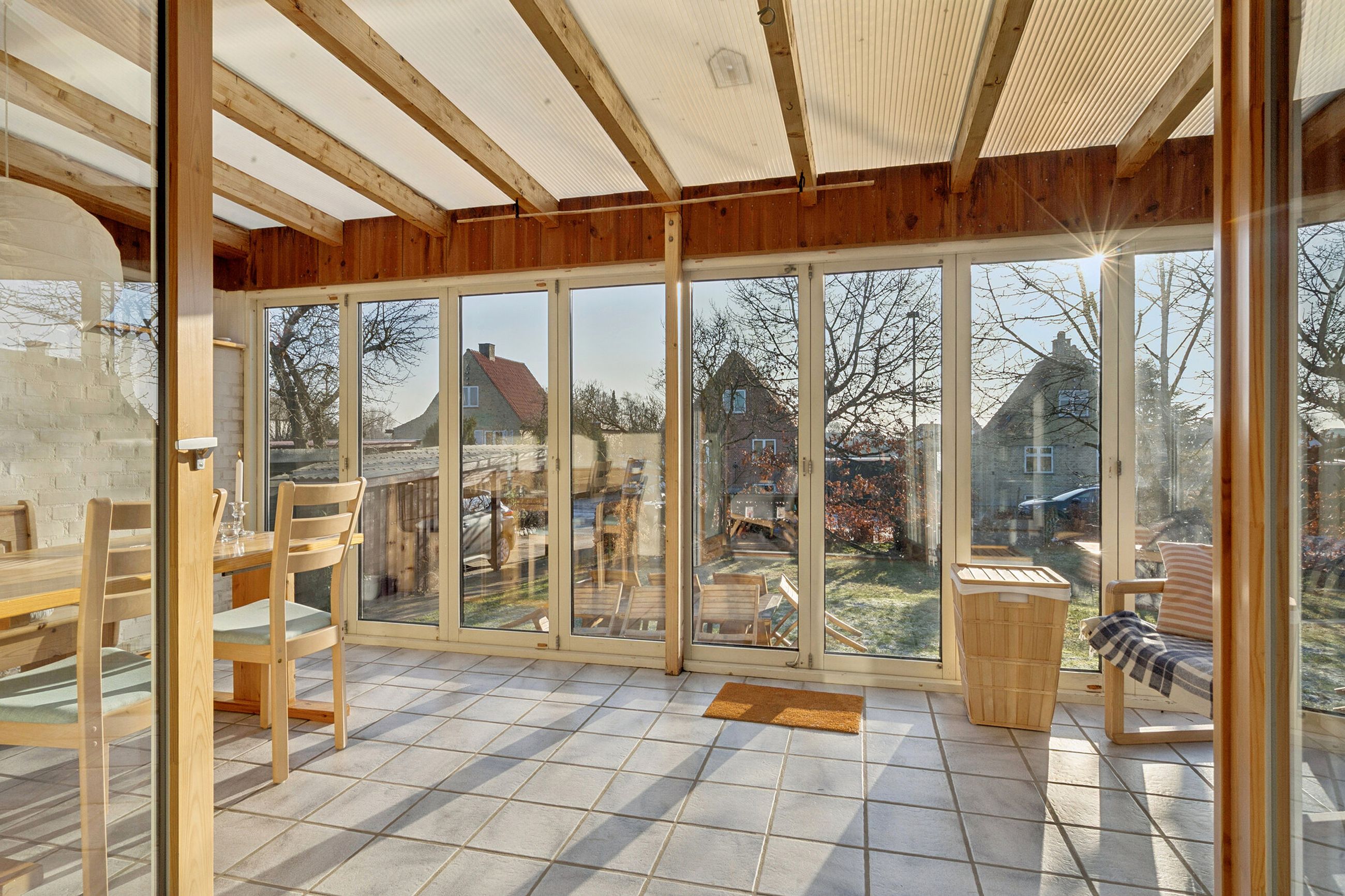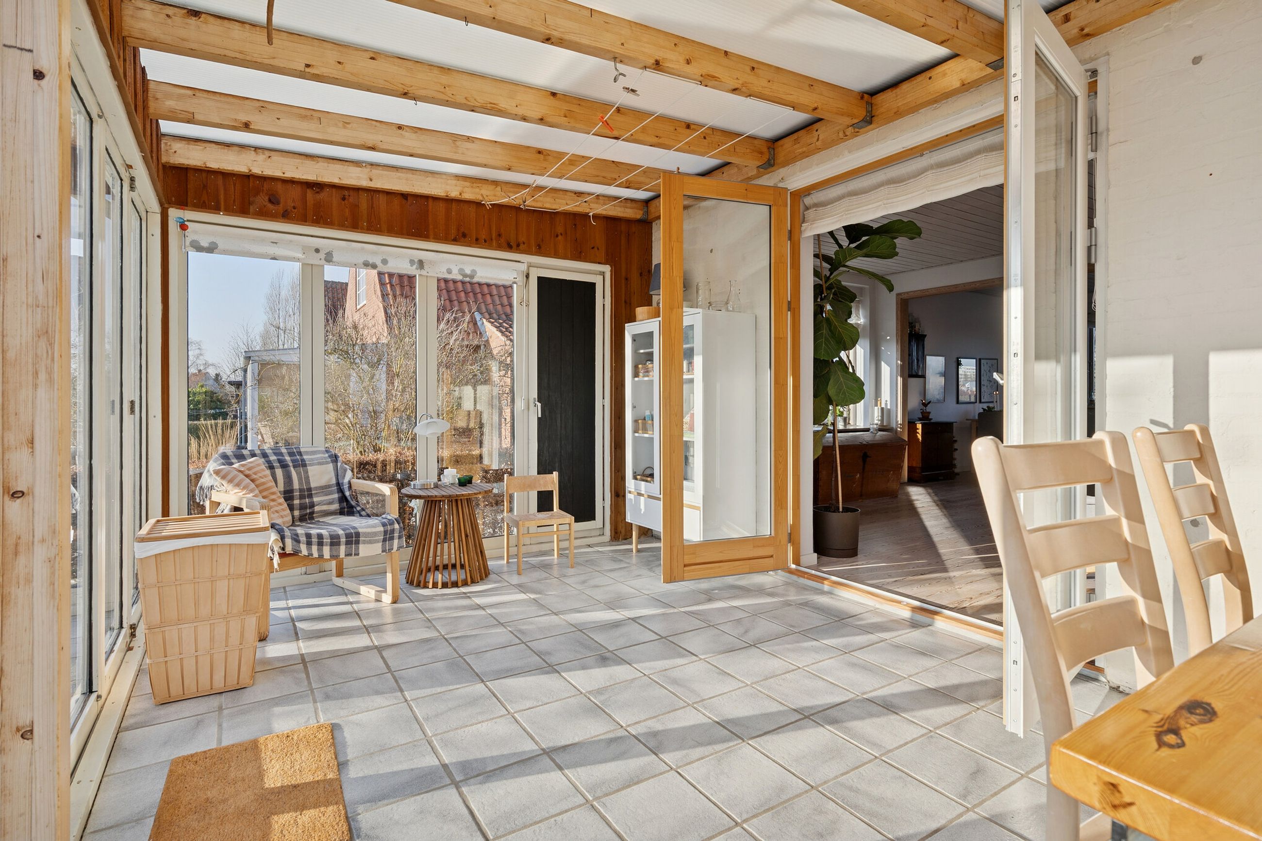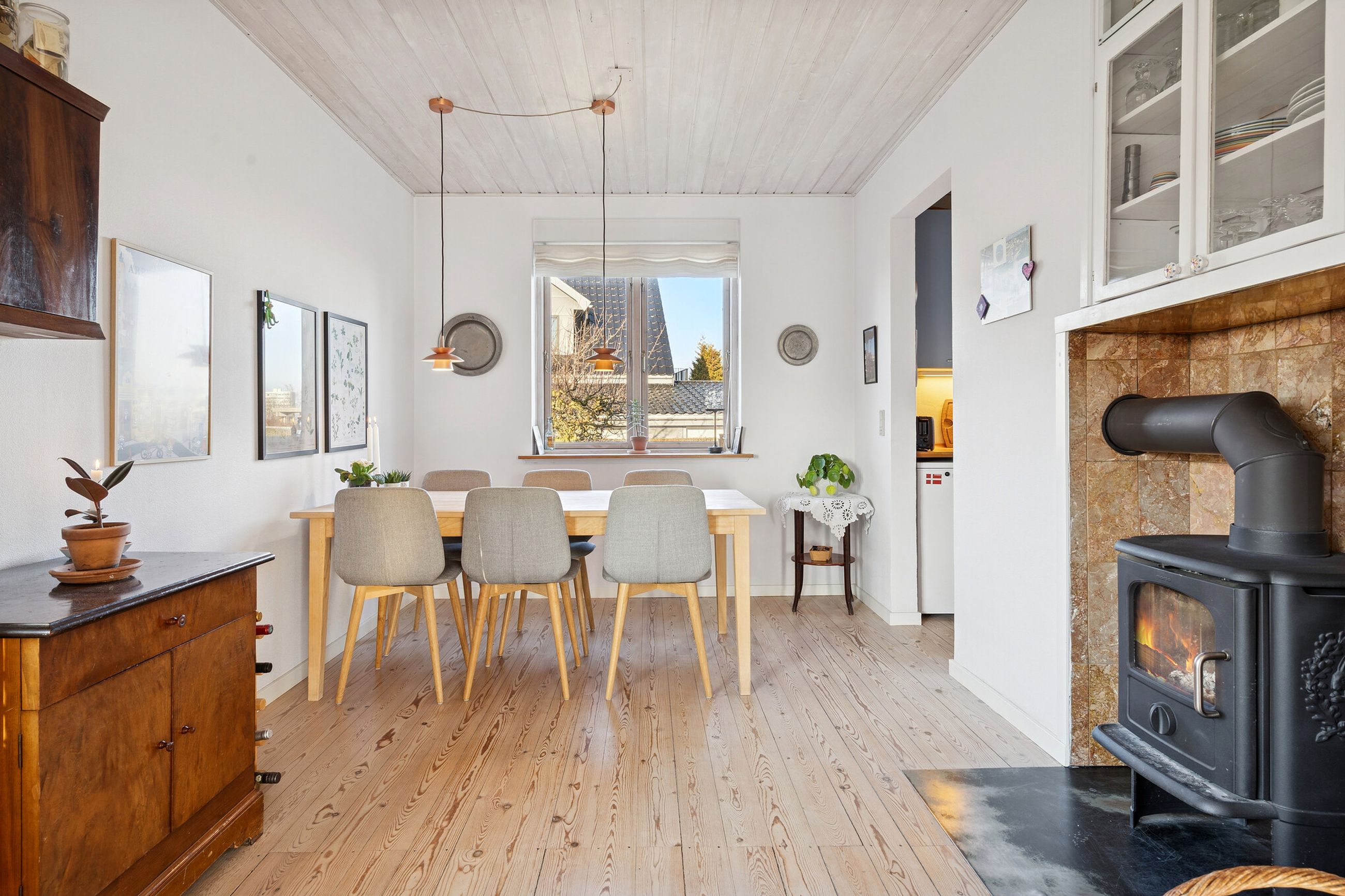Vi starter på den høje stueetage, hvoraf de fleste kvadratmeter er dedikeret til den stemningsfulde vinkelstue. Denne har brede vinduespartier, brændeovn og dobbeltdør ud til udestuen, der i de lune måneder fungerer som en naturlig forlængelse af stuemiljøet.