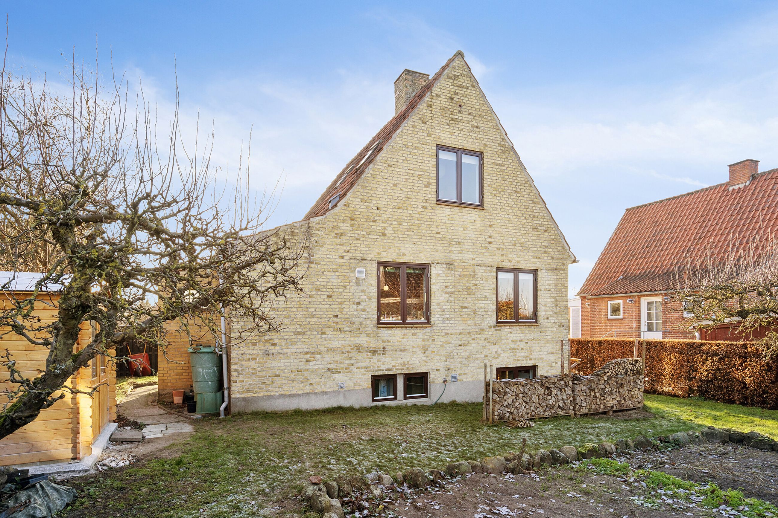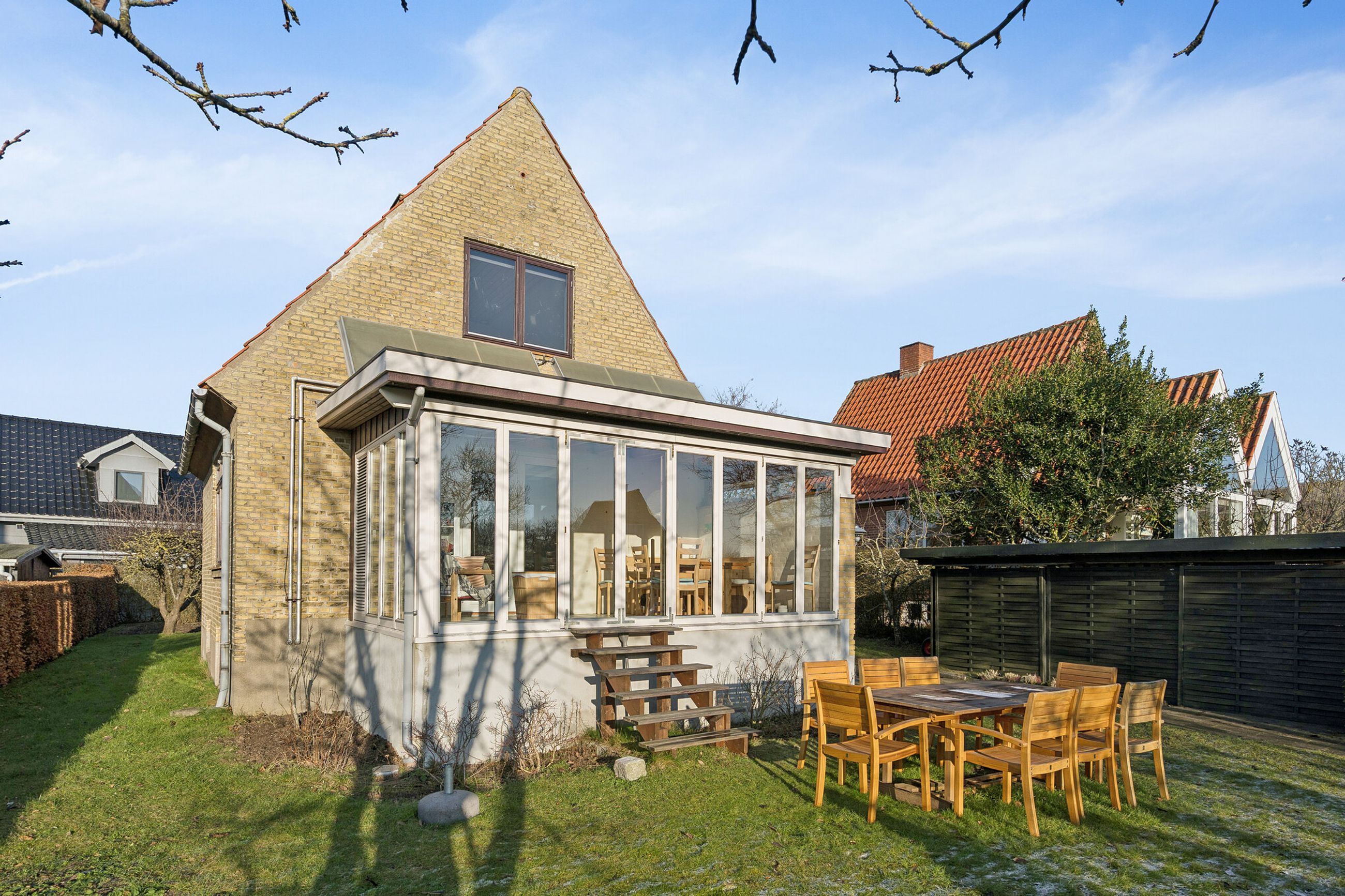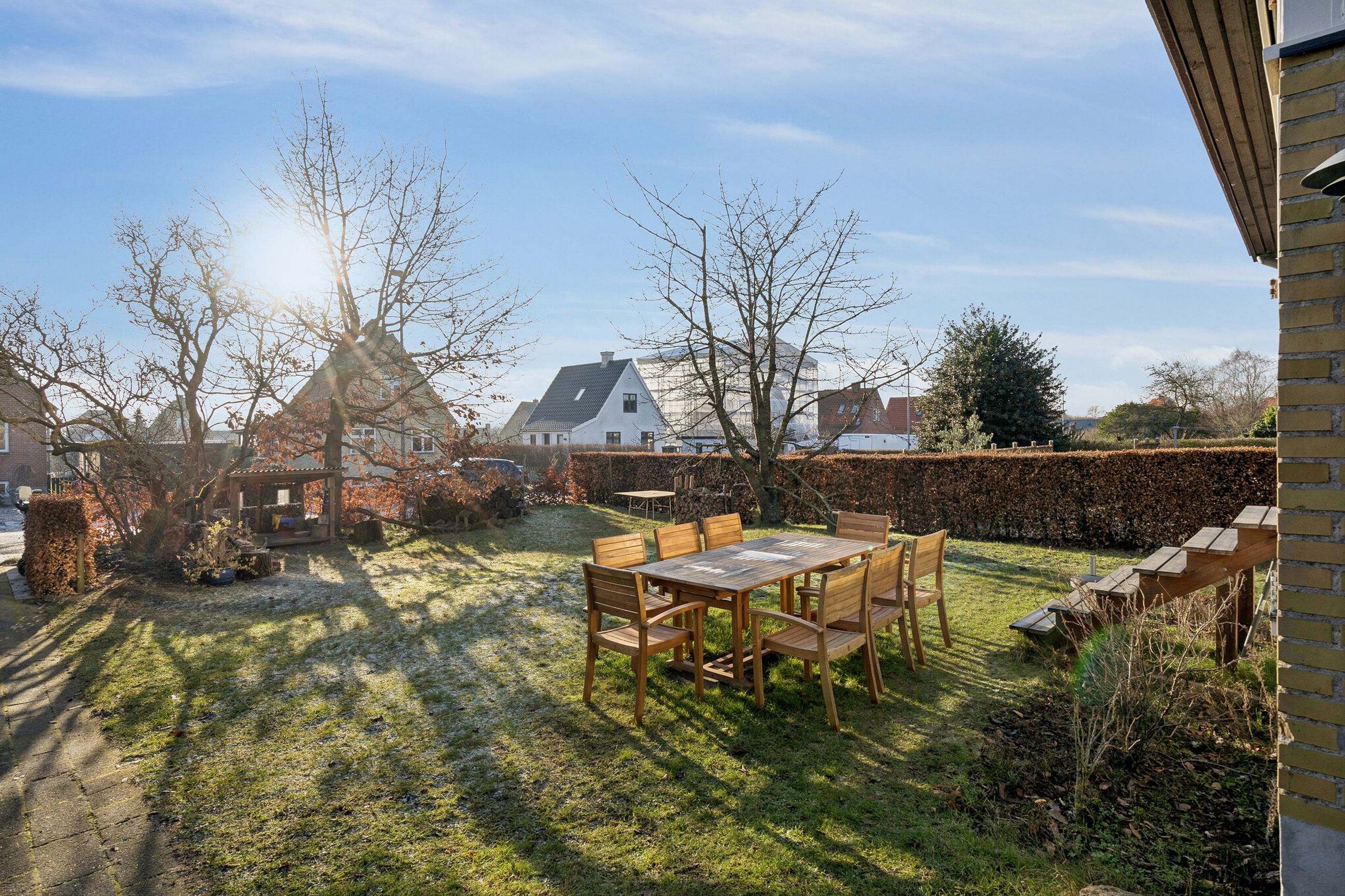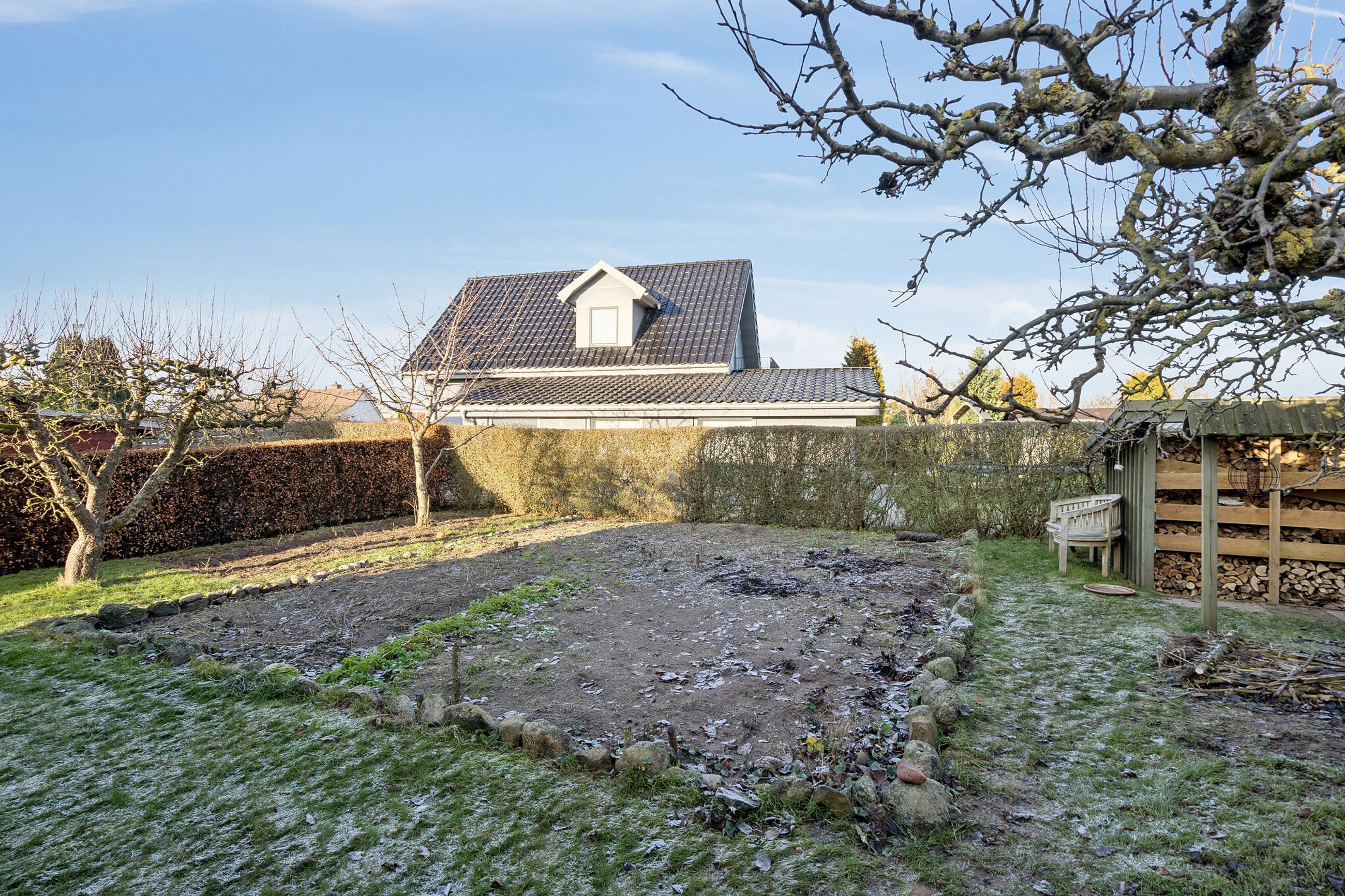 Boligen omgives af haven, der er anlagt med græsplæne, hække og gamle træer. I haven kan der etableres flere hyggekroge, og bagtil er der potentiale for at lave køkkenhave.