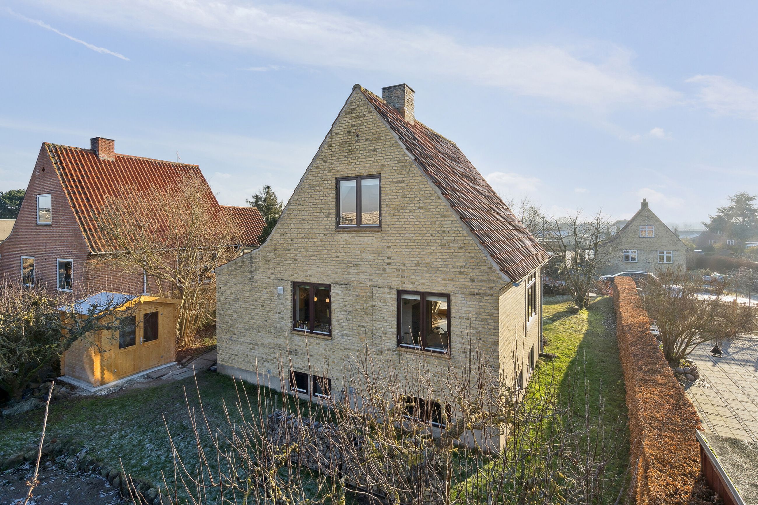 Der er tale om en villa fra 1953 – med rustik murstensfacade og tegltag. Indenfor venter der jer tre etager, inklusiv en brugbar kælder. En stor, solrig udestue er ligeledes en del af boligpakken, og ejendommen får følgeskab af en dejlig have, en carport og et par skure.