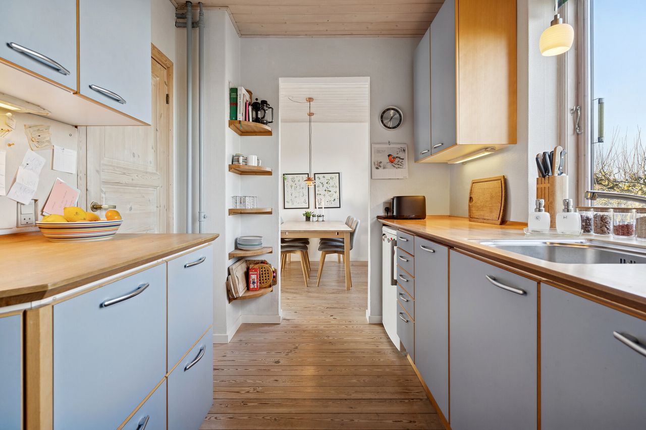 Side om side med stuen findes det fine køkken, som fremtræder i en tidssvarende nuance med gyldne trædetaljer.
