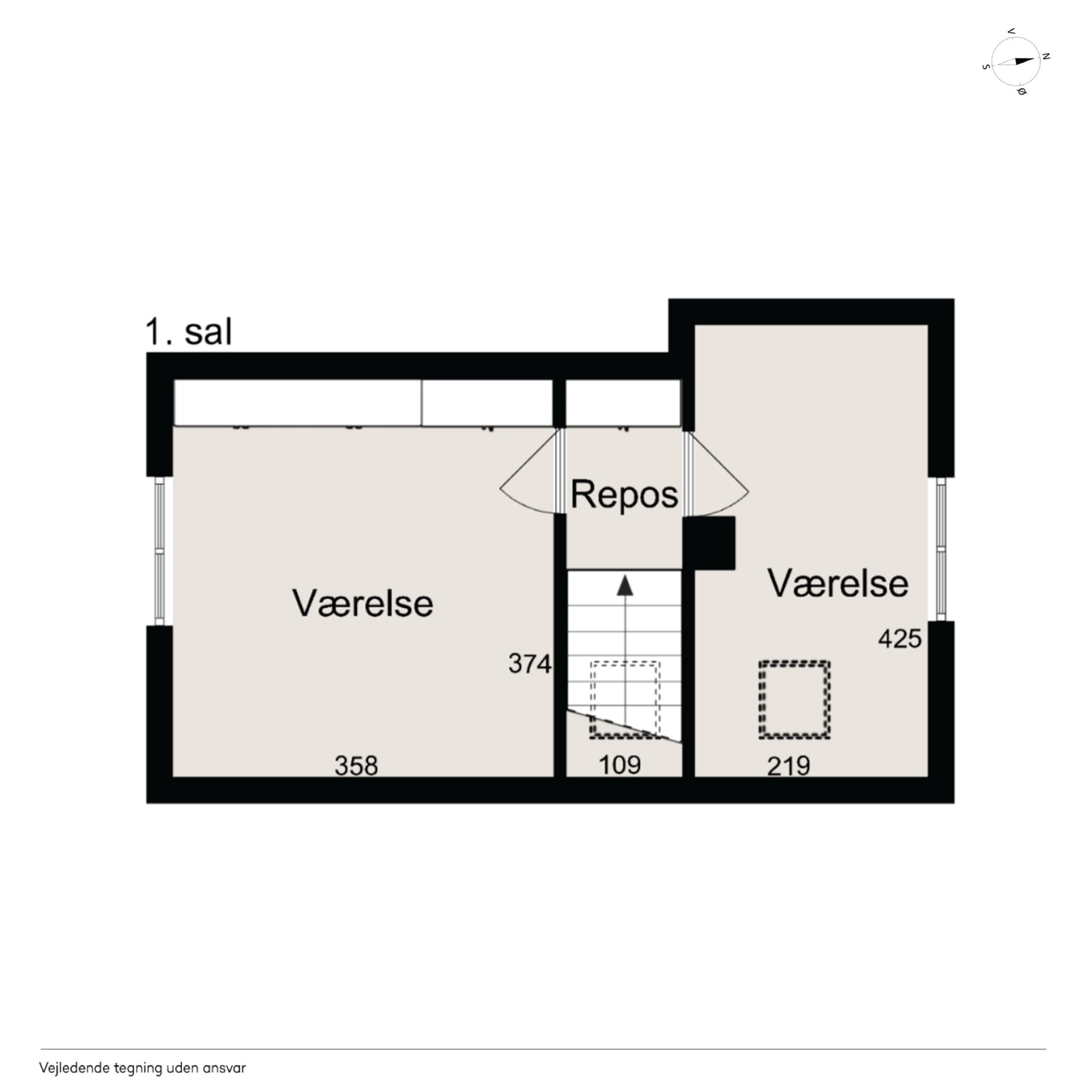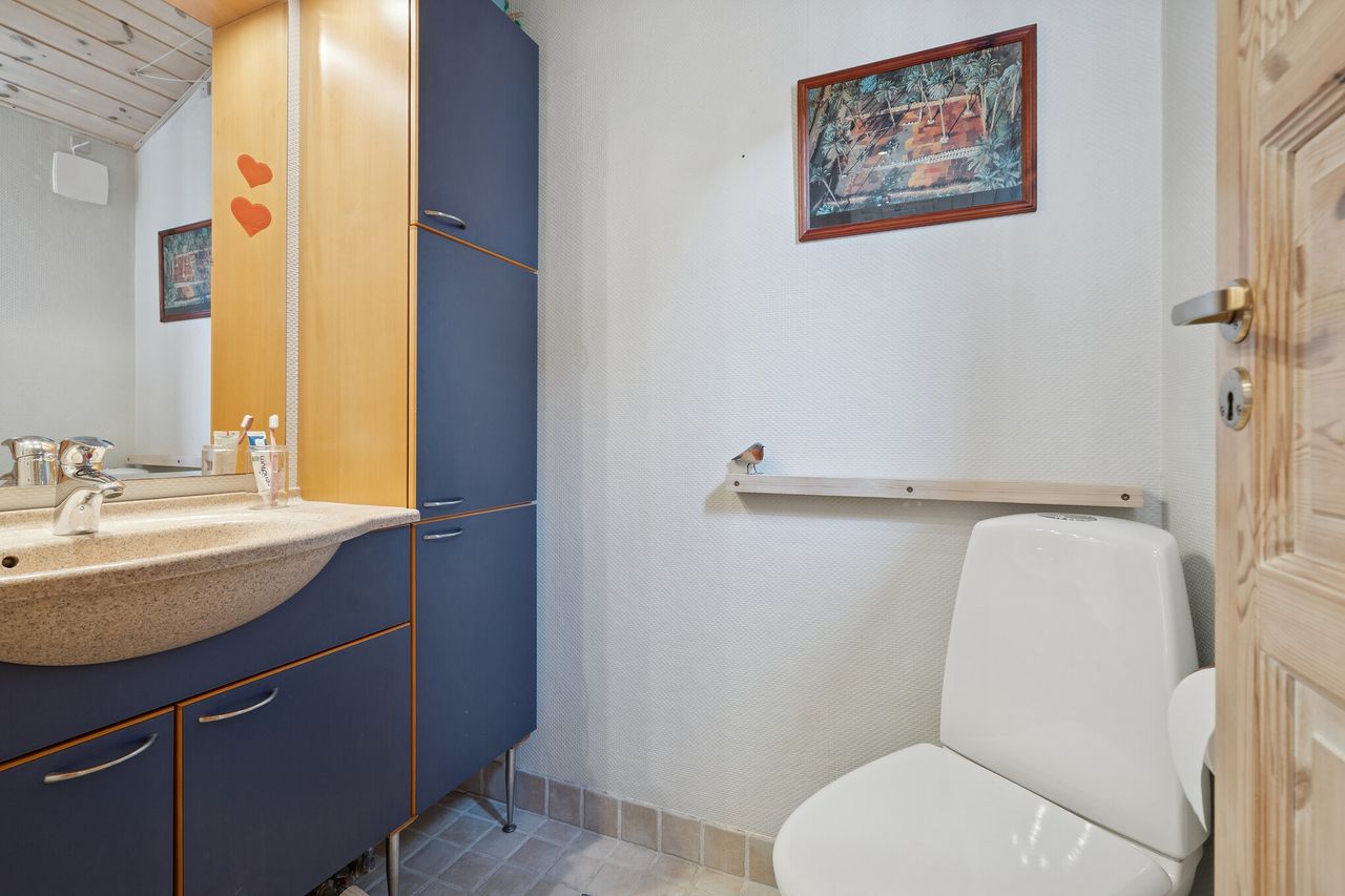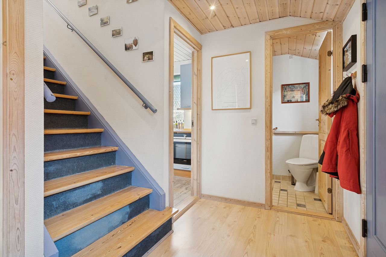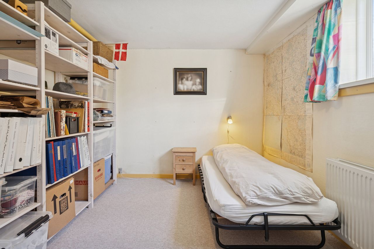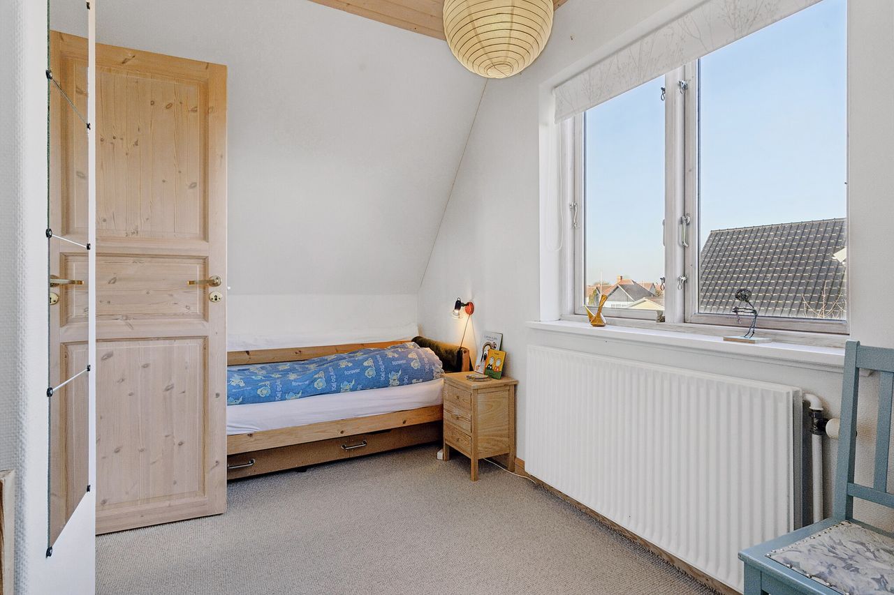 Et gæstetoilet og en entré afrunder stueplanet, mens førstesalen er indrettet med to velproportionerede værelser og en repos. Det største værelse har skabsvæg, og der er tillige faste skabe på reposen.