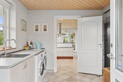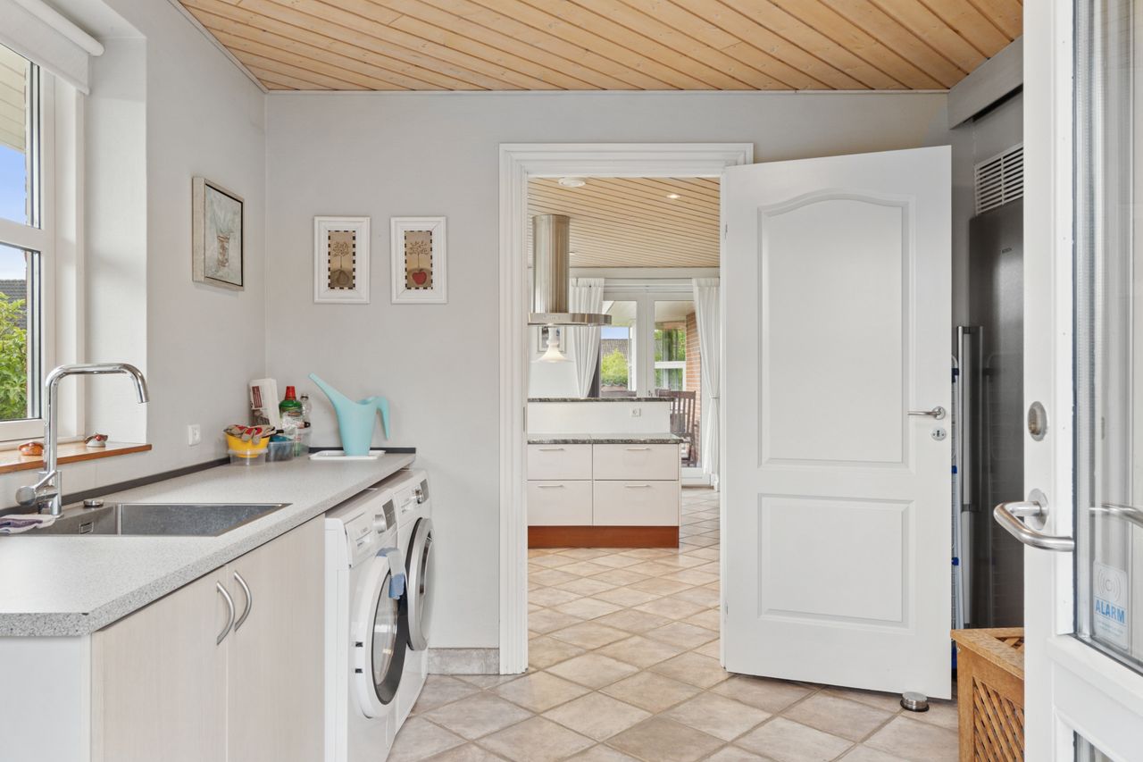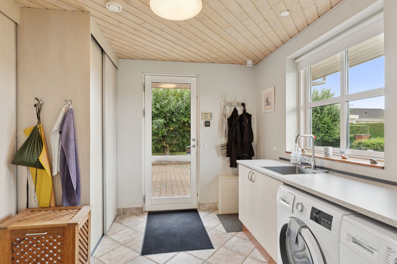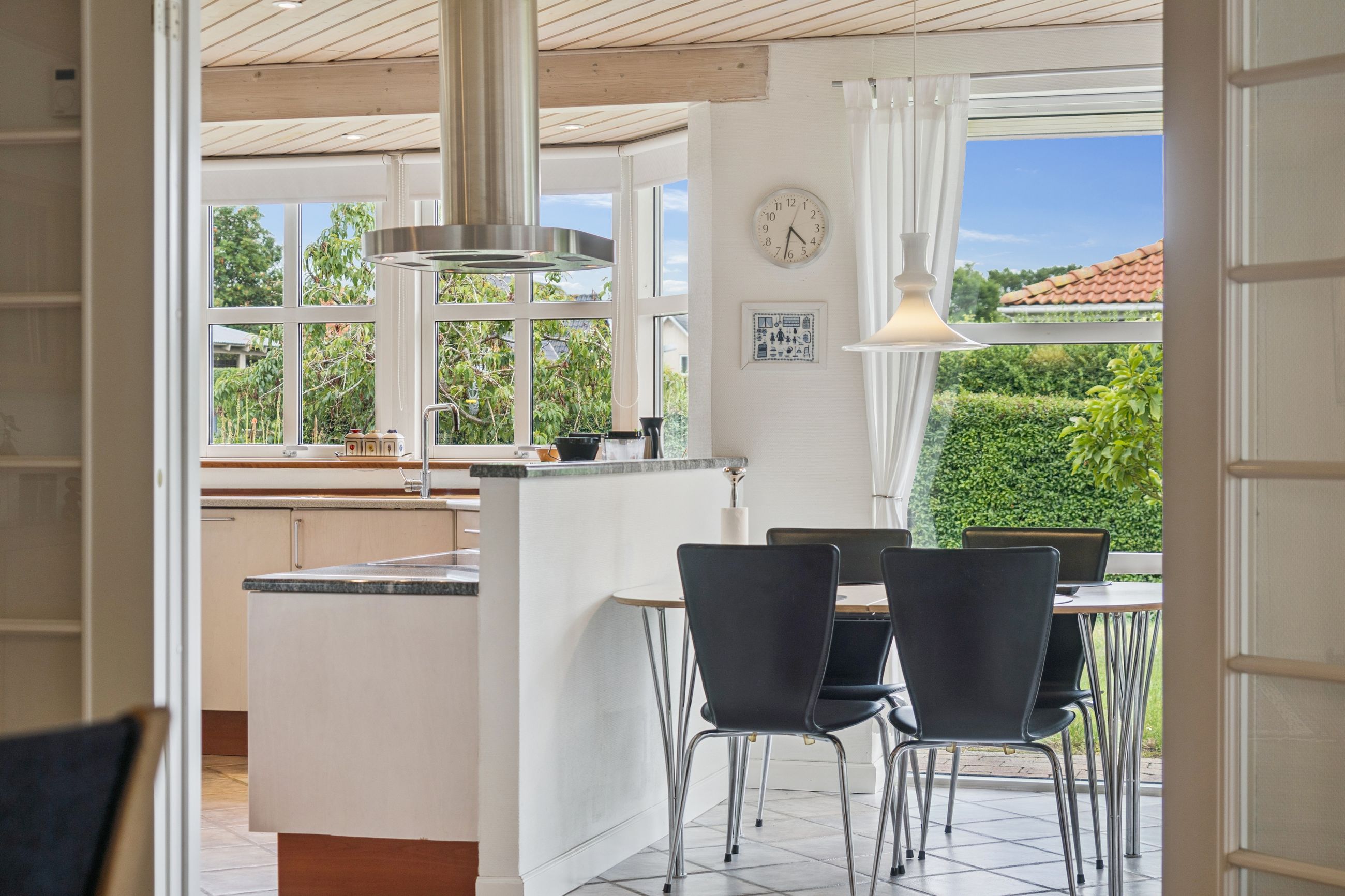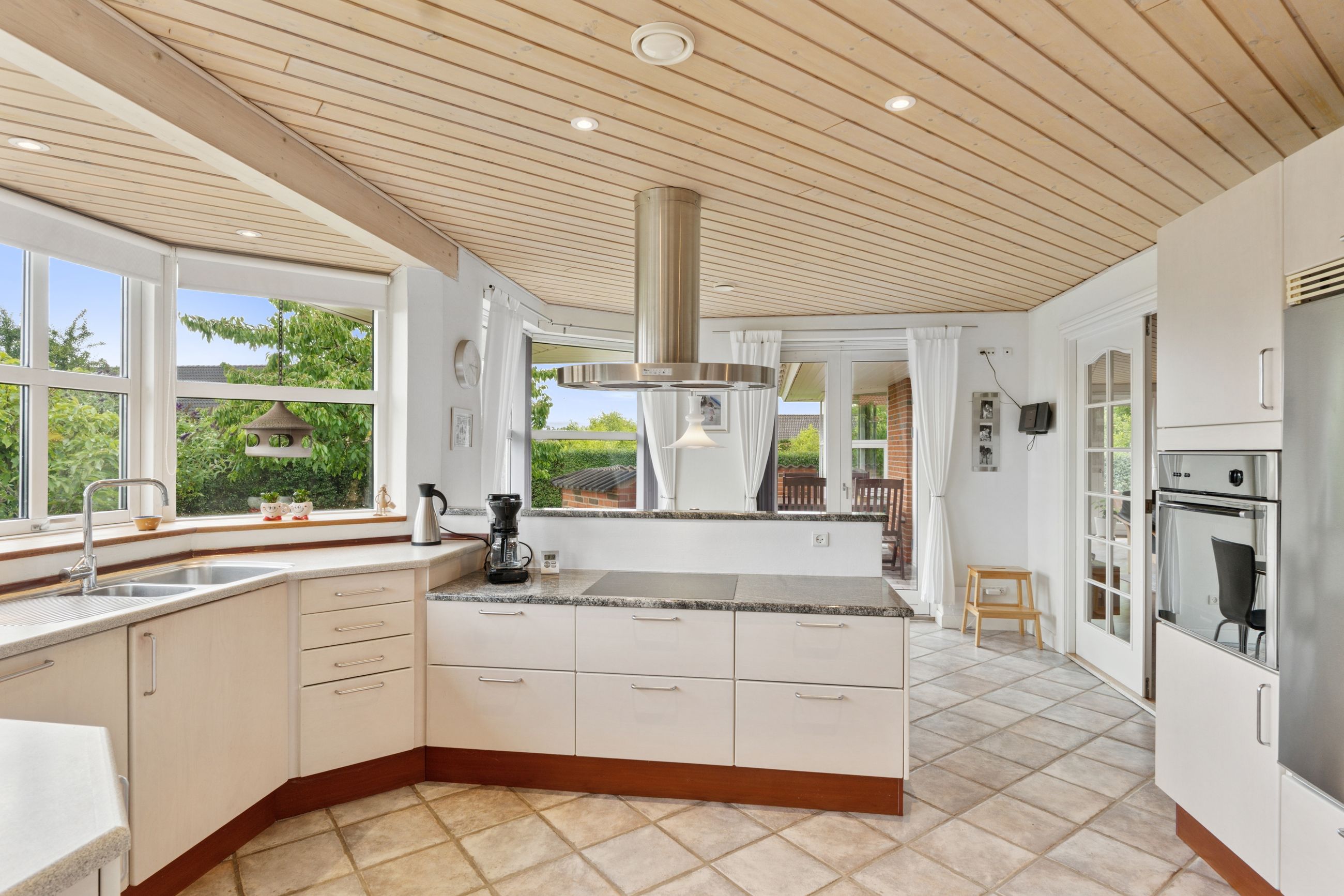 Via franske døre er der adgang til det velindrettede køkken med lyse elementer og plads til spisebord. I forlængelse af køkkenet findes et praktisk bryggers med plads til både vaskemaskine og tørretumbler.