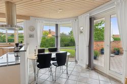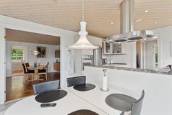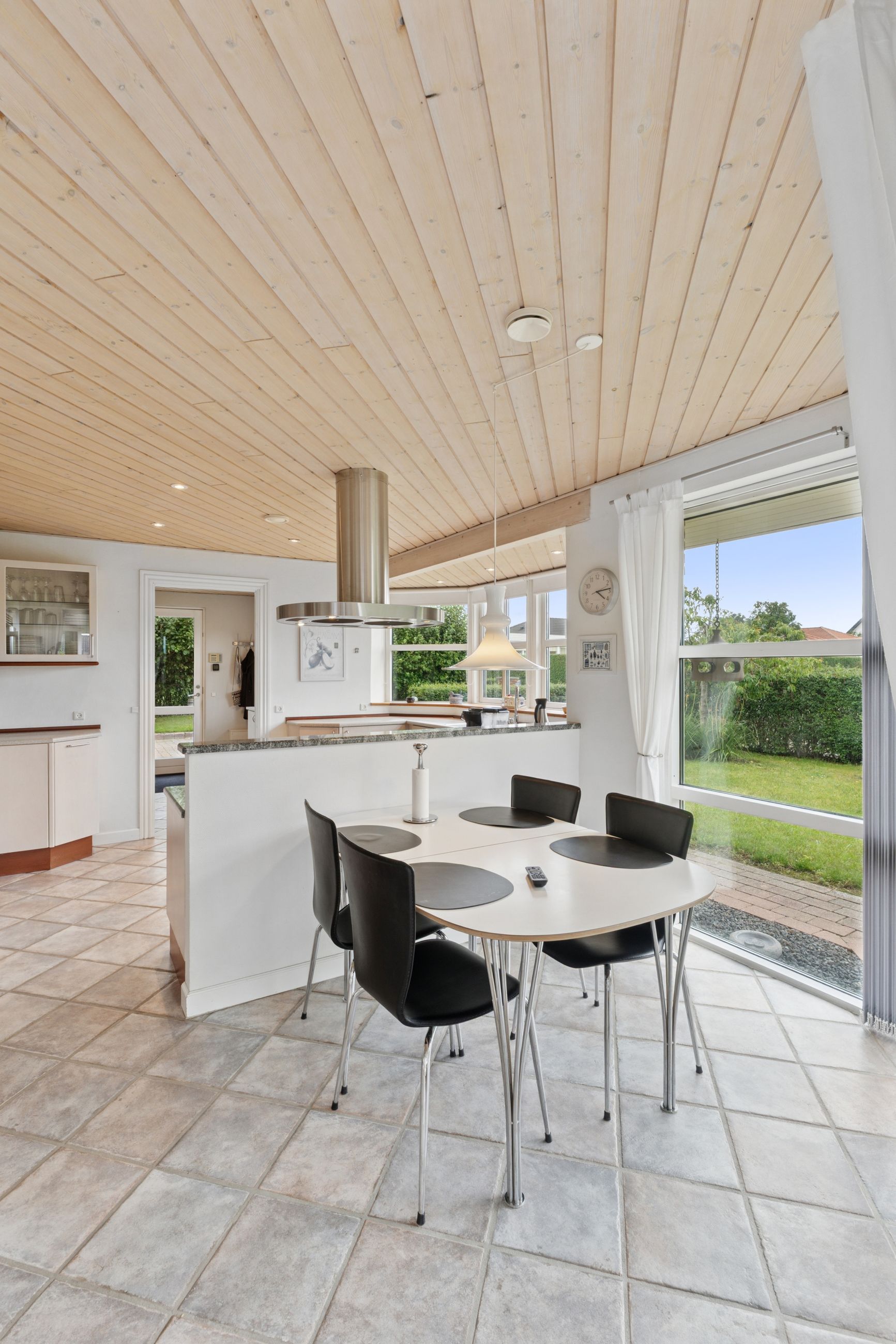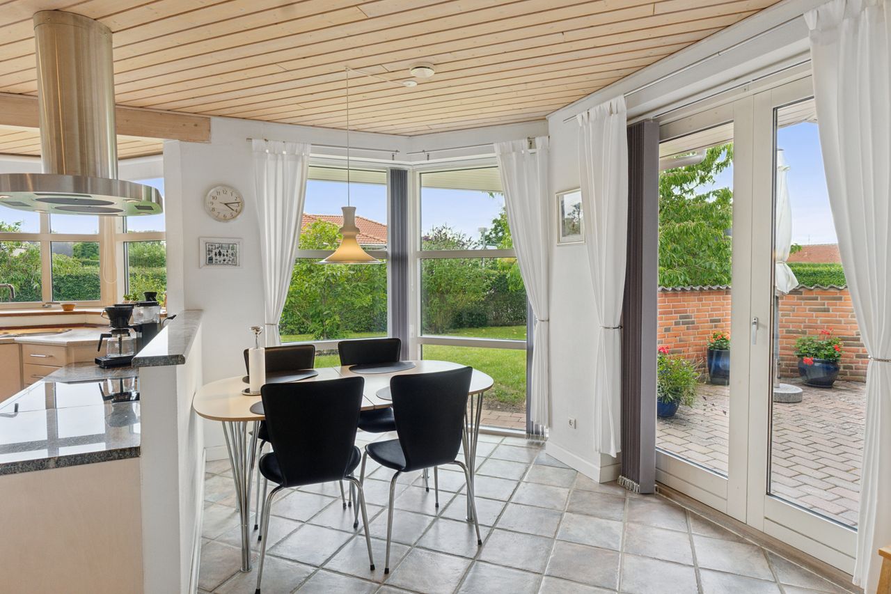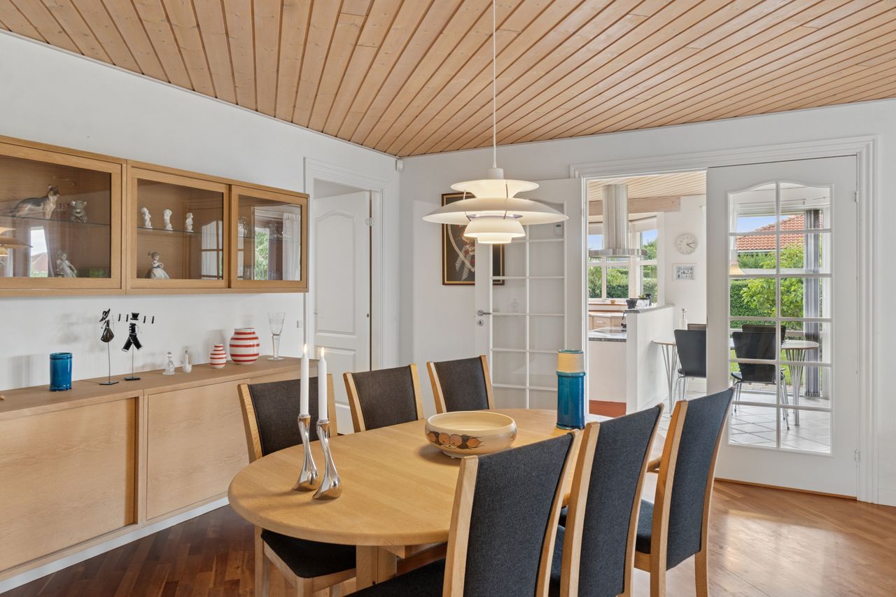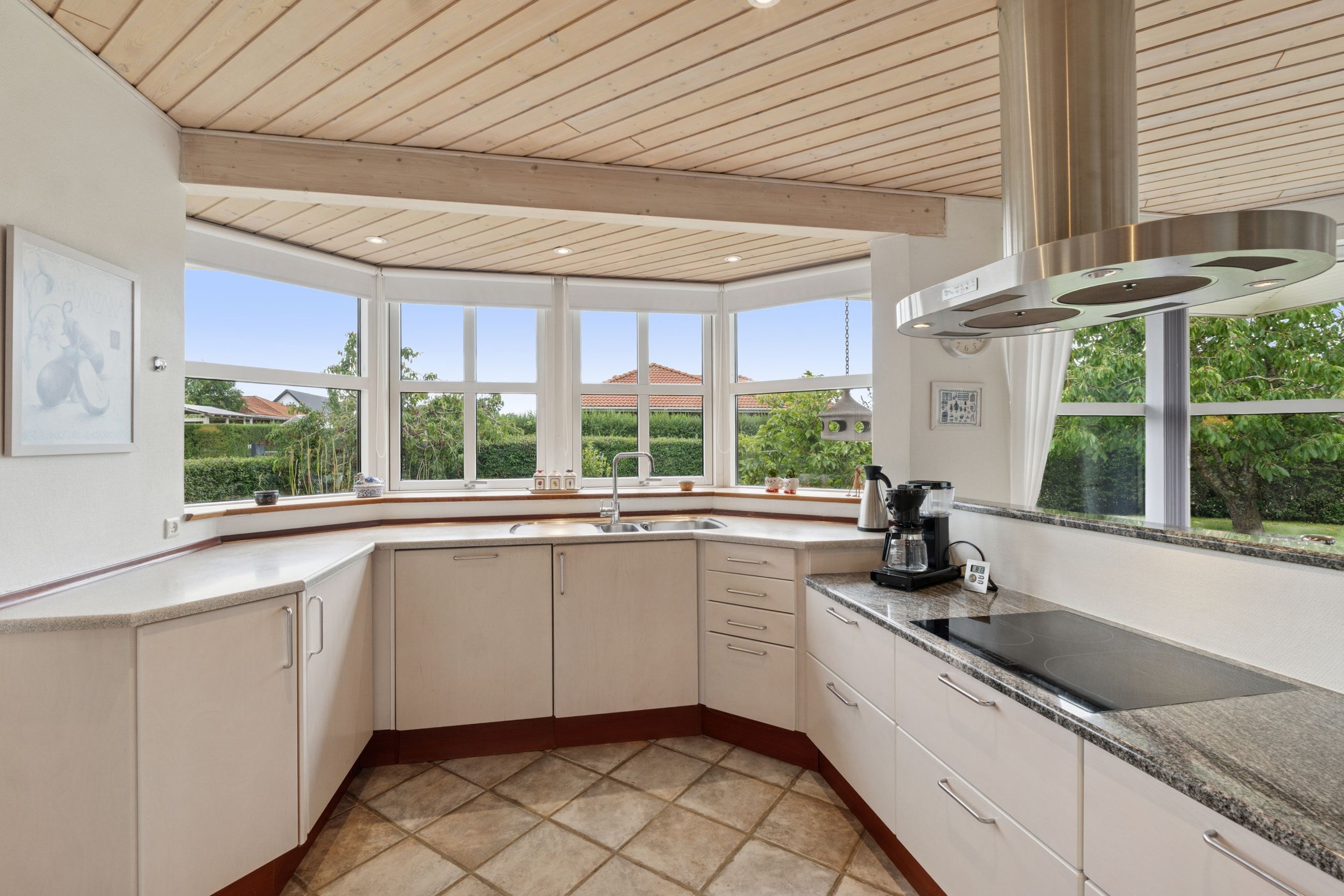 Via franske døre er der adgang til det velindrettede køkken med lyse elementer og plads til spisebord. I forlængelse af køkkenet findes et praktisk bryggers med plads til både vaskemaskine og tørretumbler.