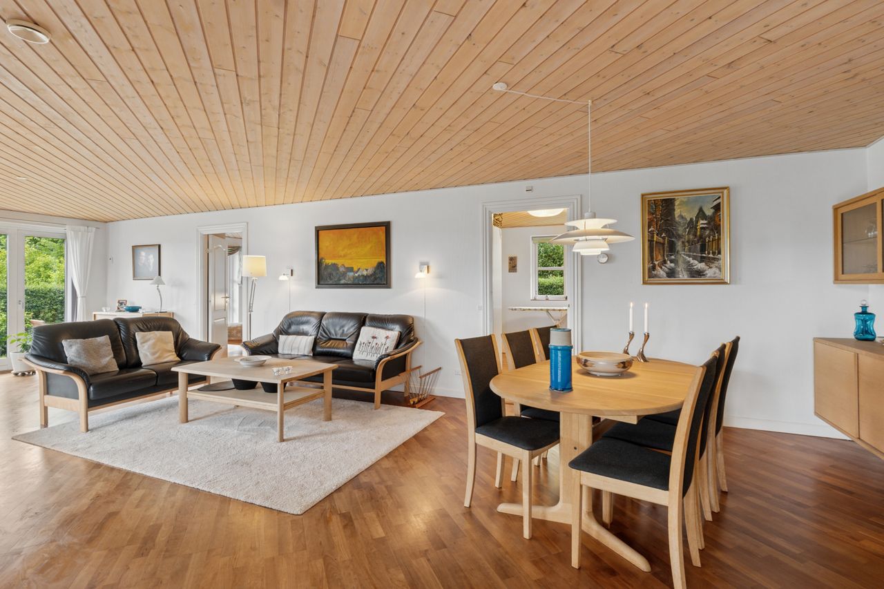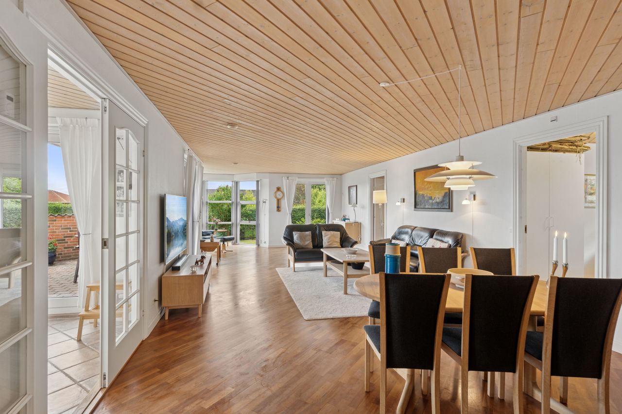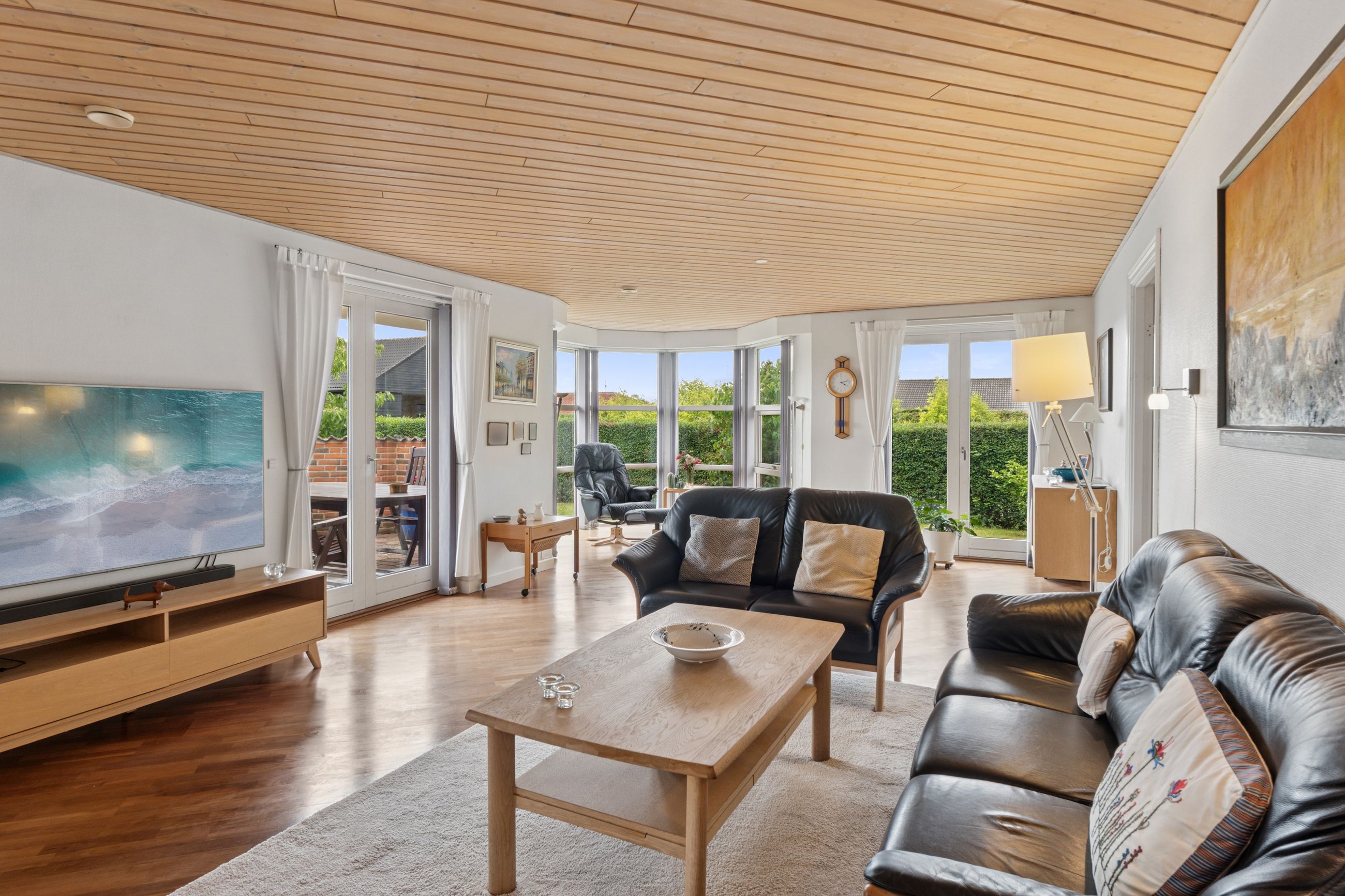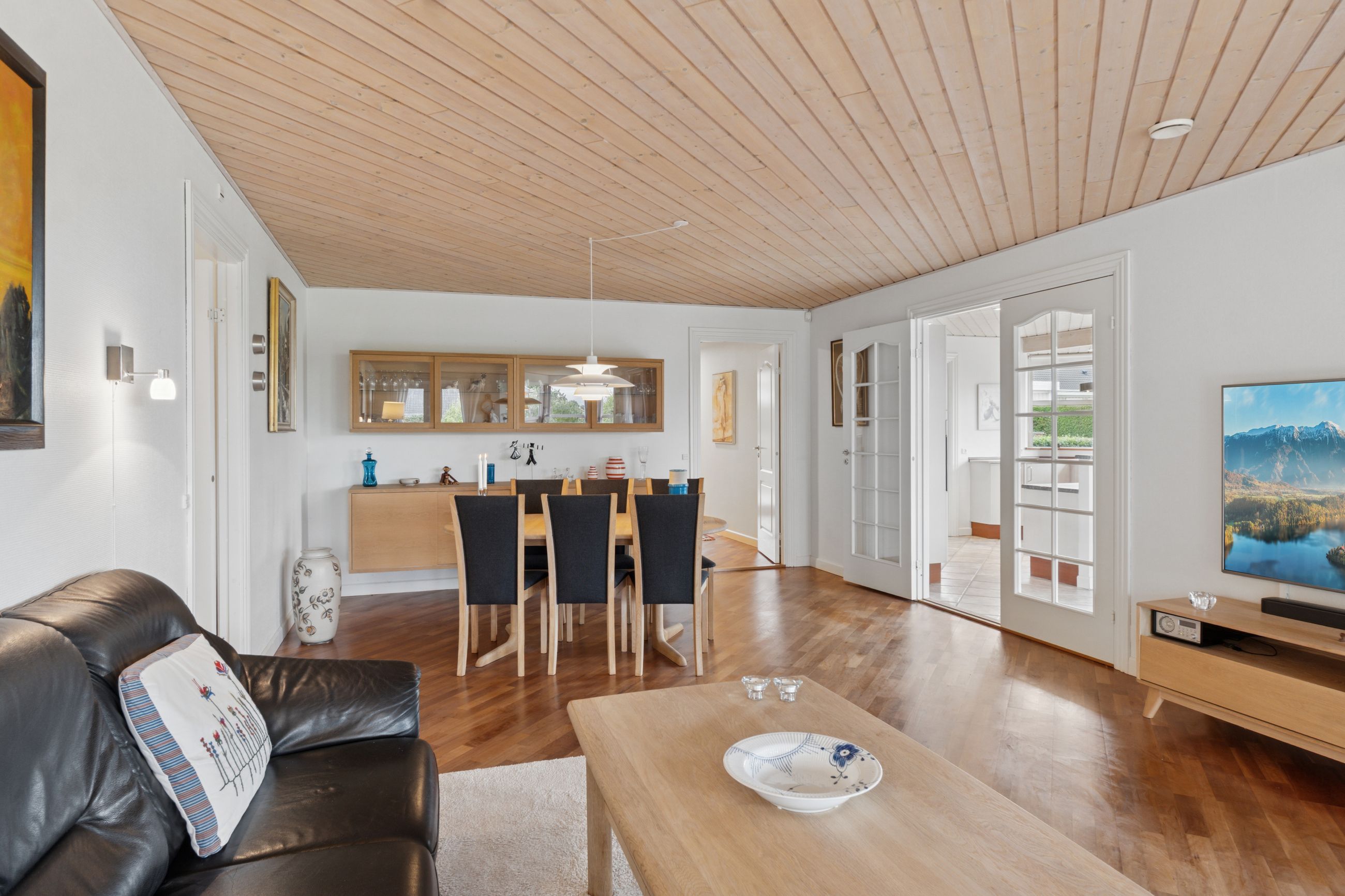 Boligen byder velkommen i en rummelig entré, der leder videre til den lyse og indbydende stue. Her får du et skønt lysindfald fra de store vinduespartier samt god plads til både sofaarrangement og spiseafdeling. Fra stuen er der direkte udgang til en hyggelig, sydvendt terrasse, hvor solen kan nydes det meste af dagen.