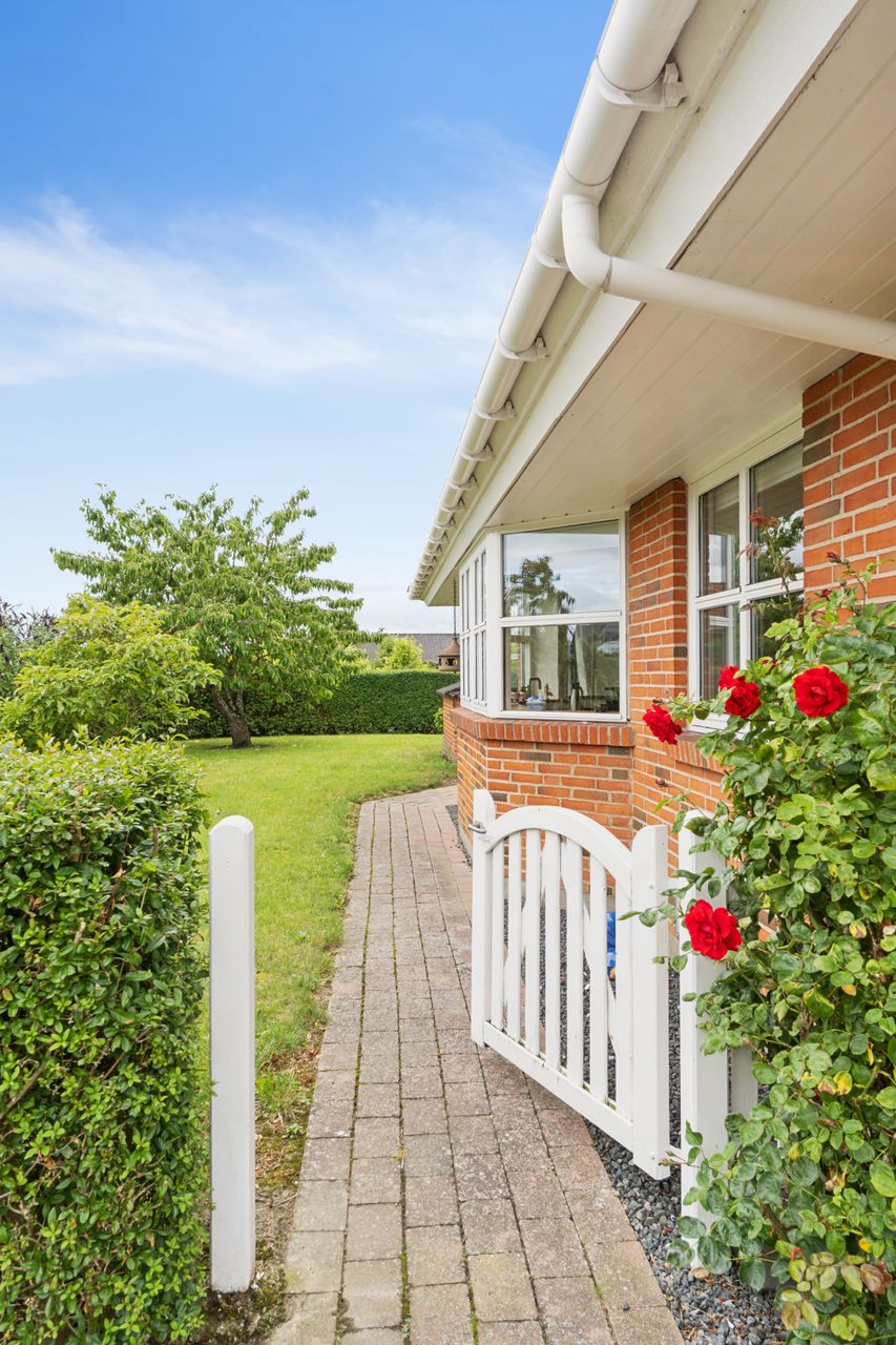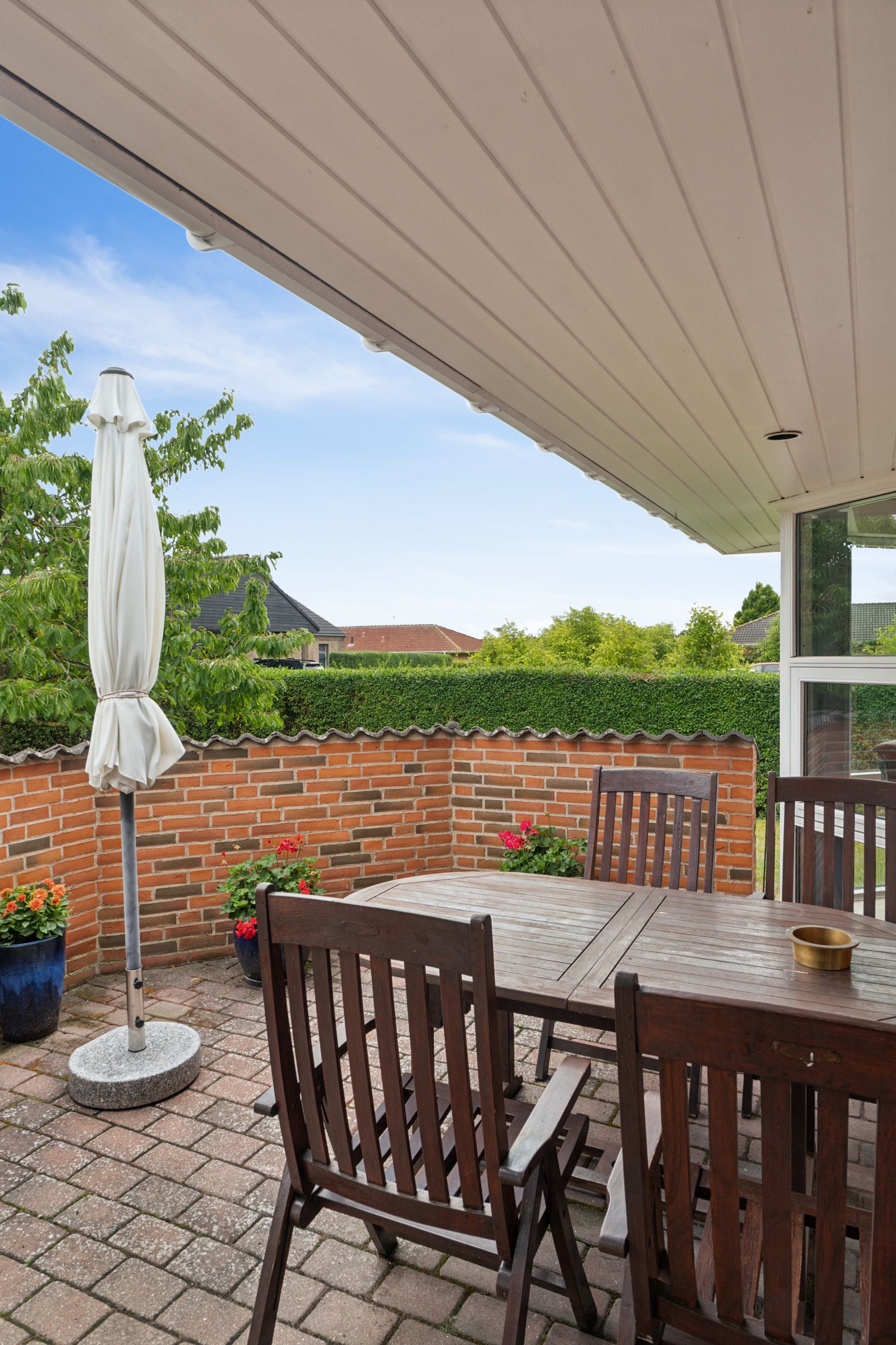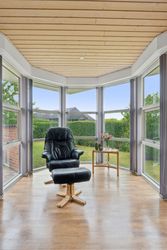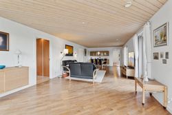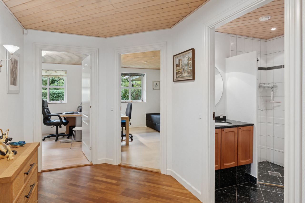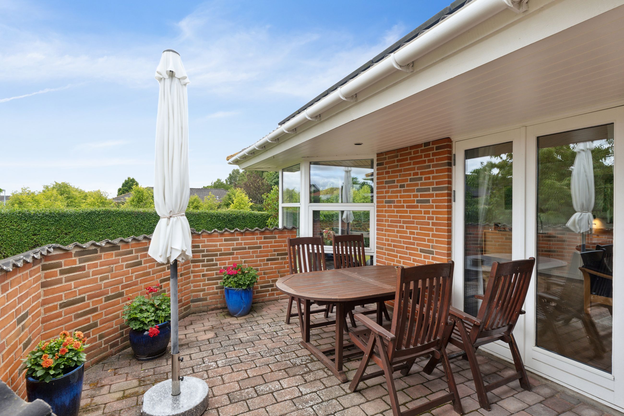 Boligen byder velkommen i en rummelig entré, der leder videre til den lyse og indbydende stue. Her får du et skønt lysindfald fra de store vinduespartier samt god plads til både sofaarrangement og spiseafdeling. Fra stuen er der direkte udgang til en hyggelig, sydvendt terrasse, hvor solen kan nydes det meste af dagen.