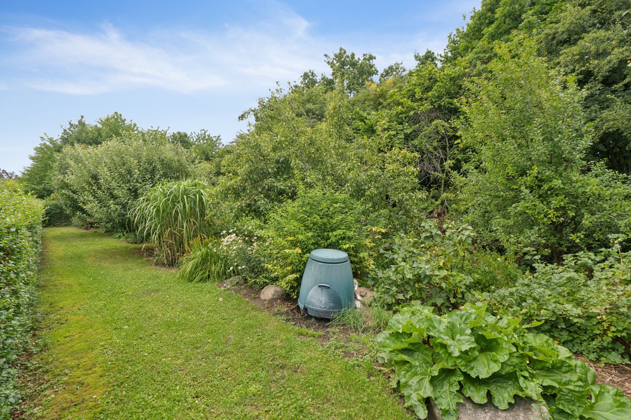 Ejendommen er beliggende på en 725 m2 stor grund, der er lukket og ugeneret med opvokset hæk. Haven er hyggeligt anlagt med træer og buske samt to terrasser – en sydvendt og en vestvendt.