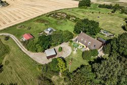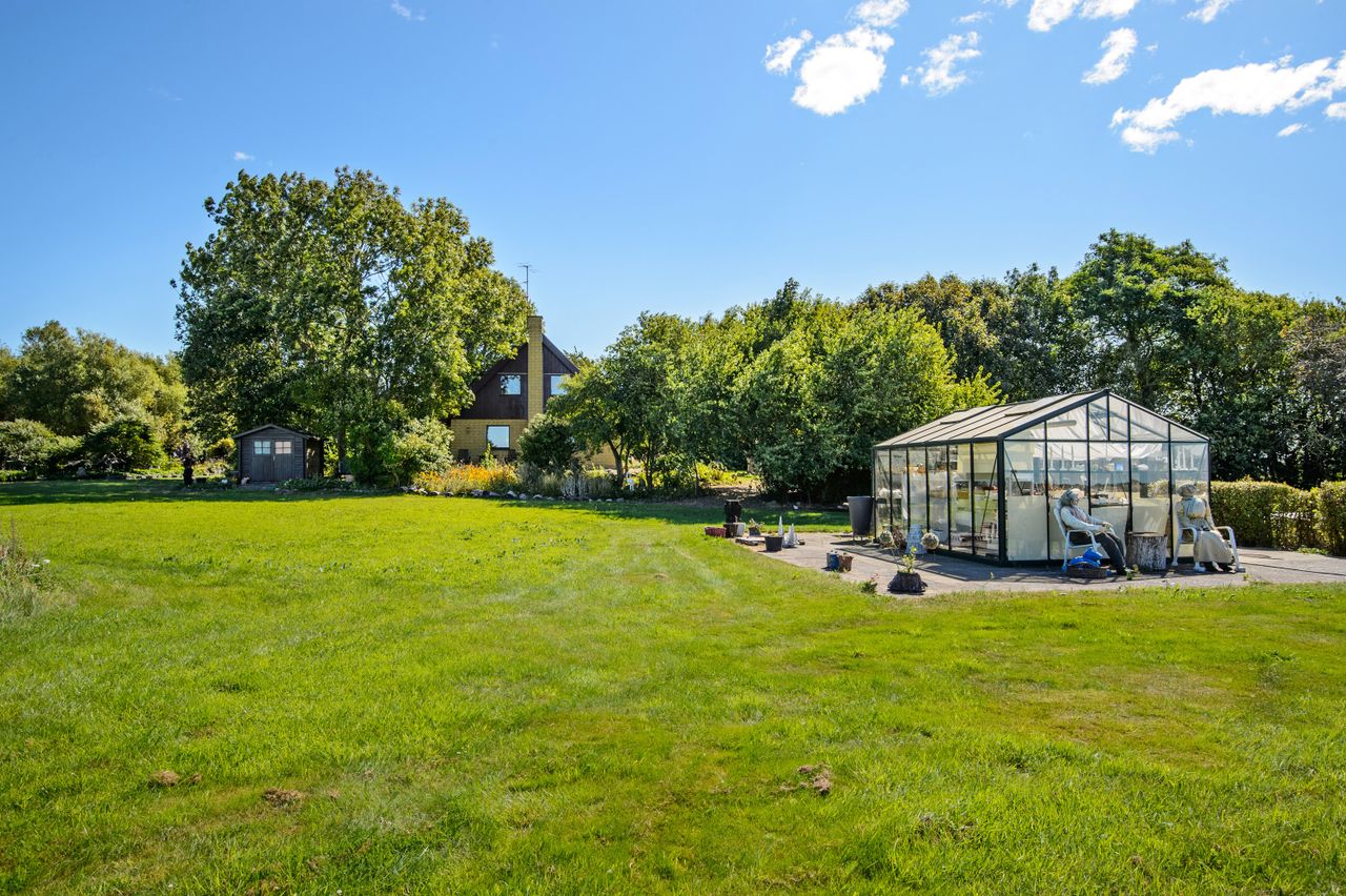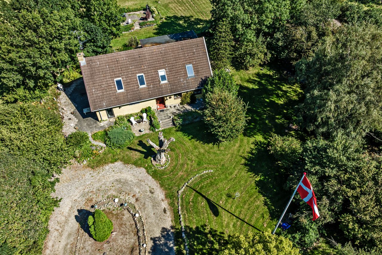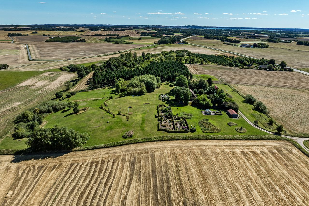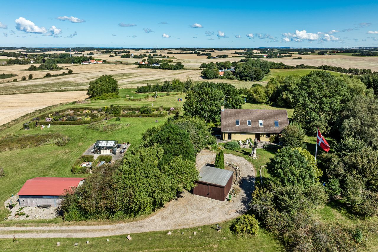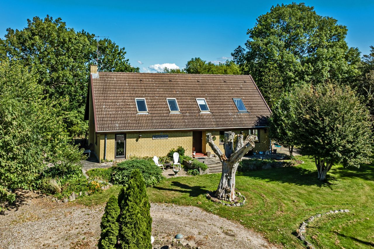 Midt på en bakketop ligger denne dejlige landvilla med skøn udsigt over landskabet til alle sider. Landvillaen er omgivet af en pragtfuld have med masser detaljer. I haven der finder man altid et sted med både læ og udsigt, da der er et væld af muligheder for at sætte sig og nyde naturen. Haven er kuperet og anlagt med store græsarealer, flotte gamle træer, helt egen gamle stendysse, 3 pilehaver, pergola, solgryde, sø og meget mere. Der er flere steder terrasser i forskellige størrelser, og i det store orangeri/drivhus er der plads til både nydelse og dyrkning af grøntsager. Der er garage med plads til 2 biler, lille maskinhus eller plads til dyrehold samt 2 udhuse. Ved udhusene er der også flere læfyldte pladser. Udhuse og garage er alle nymalede. Mange muligheder for mange forskellige hobbyaktiviteter. Selve boligen har nymalede gavle og udhæng. Her er der indrettet med køkken/alrum/spisestue med egetræselementer og udgang til terrasse, meget stor opholdsstue med lysindfald fra 3 sider, værelse/kontor, bryggers, vindfang og entre/hall med trappe til 1.sal, hvor der er etableret en smart "vare"-elevator til 1.sal. Der er parketgulve i alle opholdsrum. På 1.sal er der en ekstra stue, stort værelse med skabe, meget stort gavlværelse med flot udsigt - fra værelset er der adgang til kontor/walk-in closet, og så er der endnu et badeværelse med bruseniche. Kælder på 14 m2, som er tør, og velegnet til viktualierum eller måske vinkælder. Næsten overalt både ude og inde er der den smukkeste udsigt over landskabet. Der er kun få km til Ubby - både ad vej og ad nyanlagt cykelsti - med skole, indkøb m.m. BO UGENERET MIDT I NATUREN MED GOD AFSTAND TIL NABOERNE - MASSER AF PLADS.