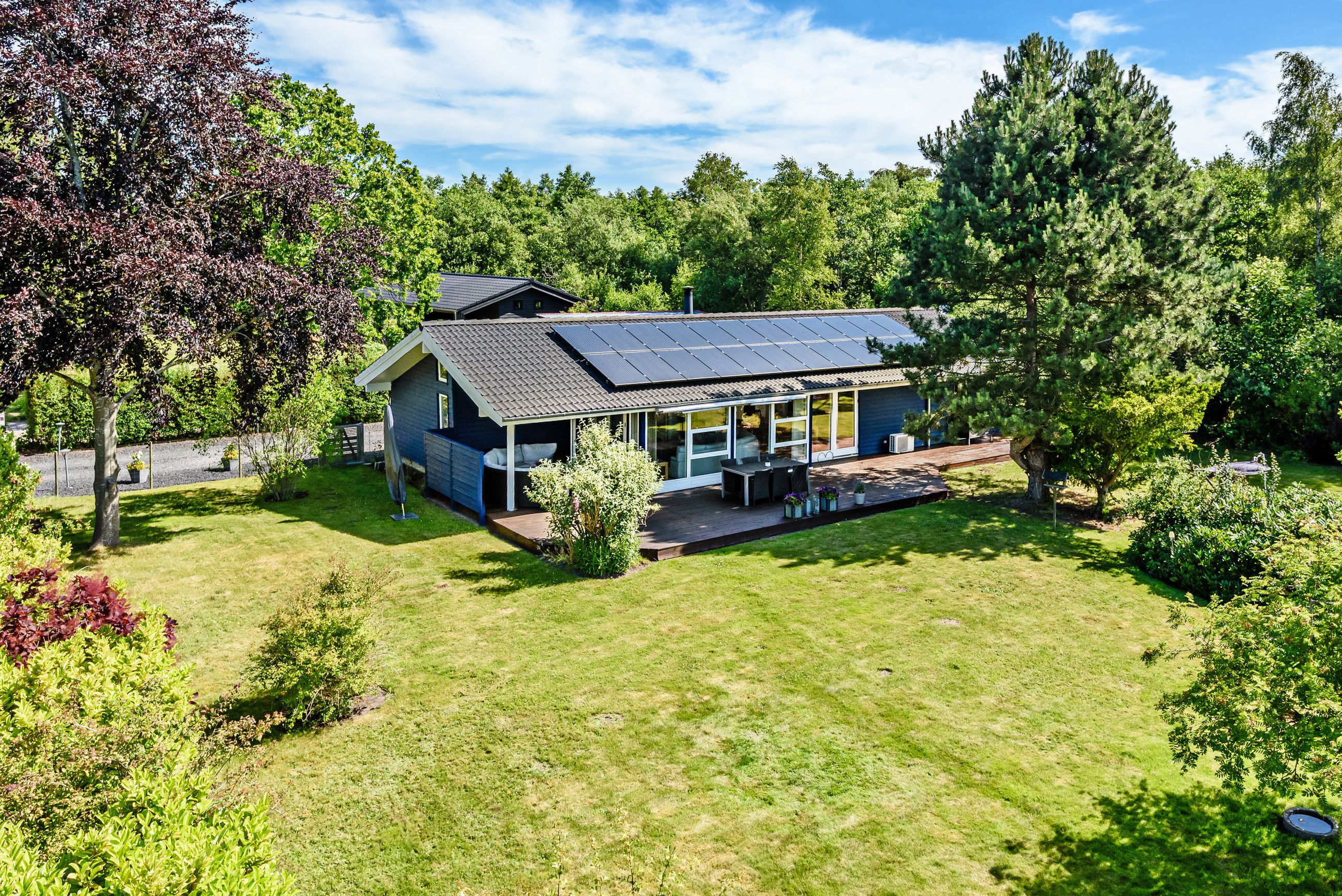 Indhegnet have med græs, buske, frugttræer m.m., og ved huset ligger den store nymalede terrasse, som er delvist overdækket. Her kan de lange lyse sommeraftener virkelig nydes.