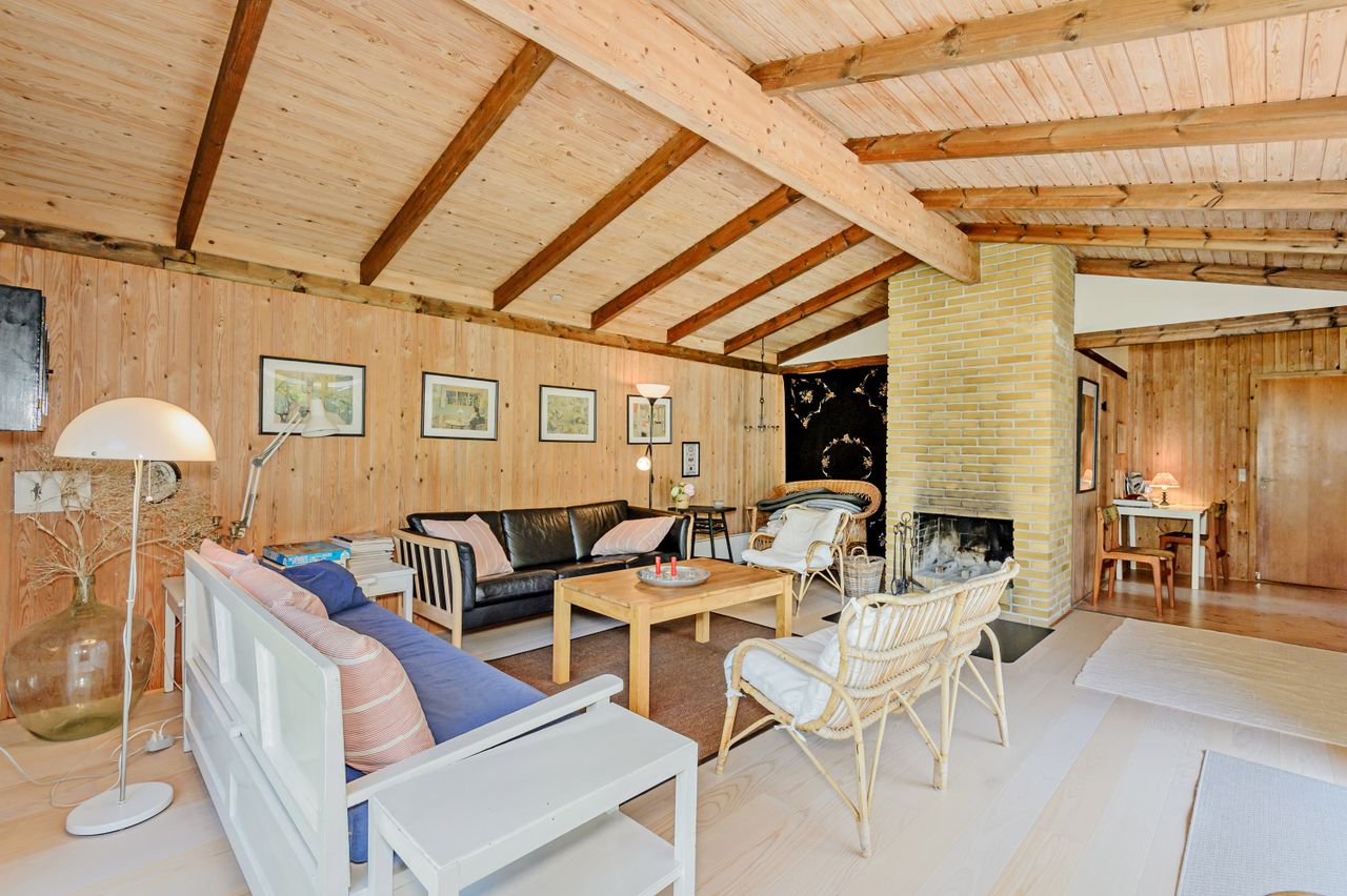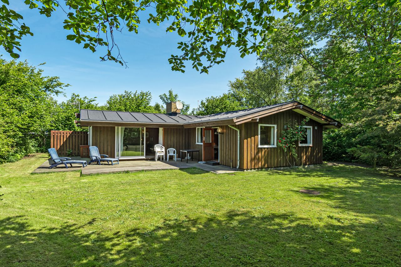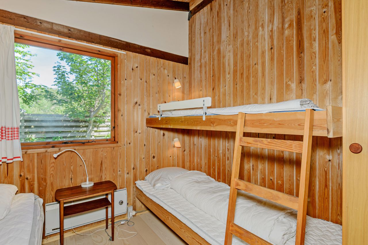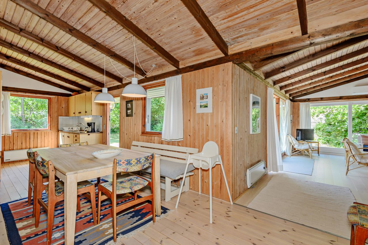 LÆKKERT FRITIDSHUS MED LOFTER TIL KIP - 3 VÆRELSER - NYT LISTETÆKKET TAGPAPTAG - SKØNNE UDEAREALER OG 5 MIN. TIL LÆKKER SANDSTRAND Her sælges et rummeligt fritidshus i rigtig god kvalitet, bygget af den lokale tømrermester Palm. Fritidshuset er opført på støbt sokkel med facader med lodret træbeklædning, helt nyt listetækket tagpaptag (udført af tømrermester), termovinduer med hvide rammer.God indretning: Entre, badeværelse med Höganäs fliser, bruseniche og god skabsplads med nedfældet vask, 2 gode værelser med faste skabe, dejligt stort køkken/alrum med fin skabs- og bordplads, stort spiseområde med masser af lysindfald og dør ud til haven, soveværelse med plads til dobbeltseng samt en skabsvæg. Fantastisk stue , åben pejs til en hyggeaften og skydedørsparti til haven. Fyrretræsgulve i alrum og superflotte nye gulve i de øvrige rum. Fritidshuset er utroligt lyst og venligt, rigtig god rumfornemmelse med lofter til kip. Primær opvarmning ved luft til luft varmepumpe placeret i stuen. Fra både stue og alrum er der udgang til en stor træterrasse, hvor solen kan nydes i fulde drag. Haven er letholdelig og primært med græsplæne og lidt beplantning, hvor der kan findes skygge i den varmeste sommer. Der er et udhus til opbevaring af havemøbler og redskaber. I løbet af 5 min. kan du gå til den skønneste børnevenlige sandstrand. Fremvisning kun ifølge aftale med ejendomsmægler, da huset i perioder er udlejet. ET LÆKKERT FRITIDSHUS TÆT PÅ STRANDEN - 3 VÆRELSER OG LOFTER TIL KIP - STOR TRÆTERRASSE OG LUKKET HAVE !
