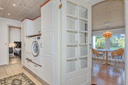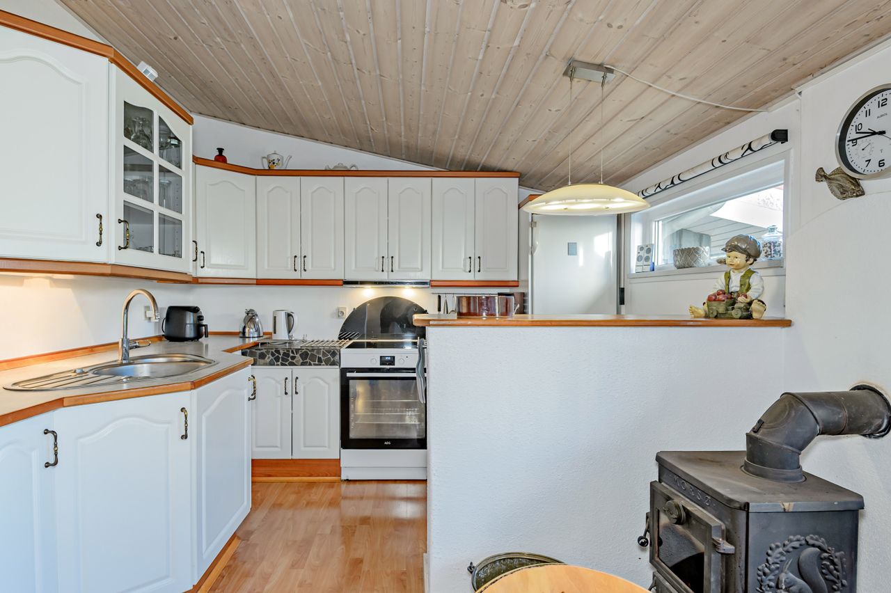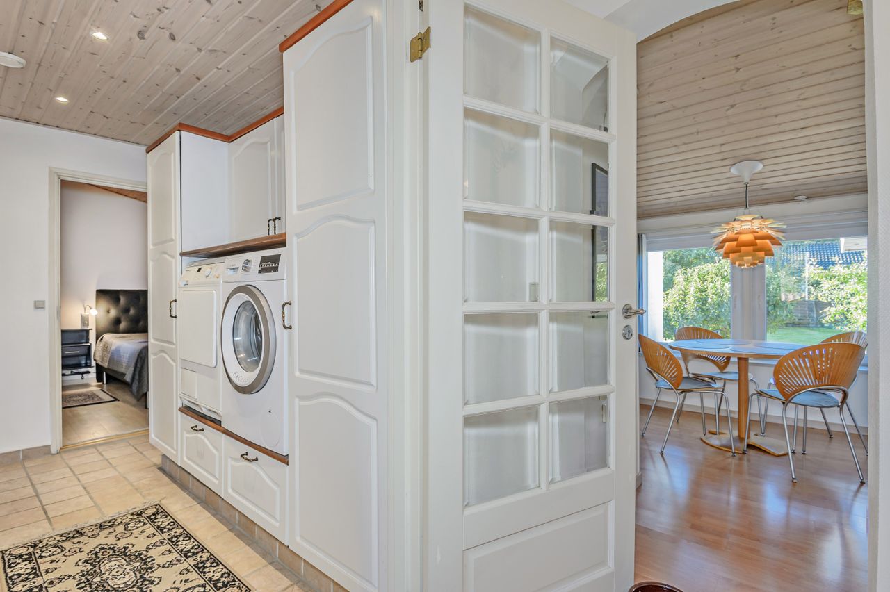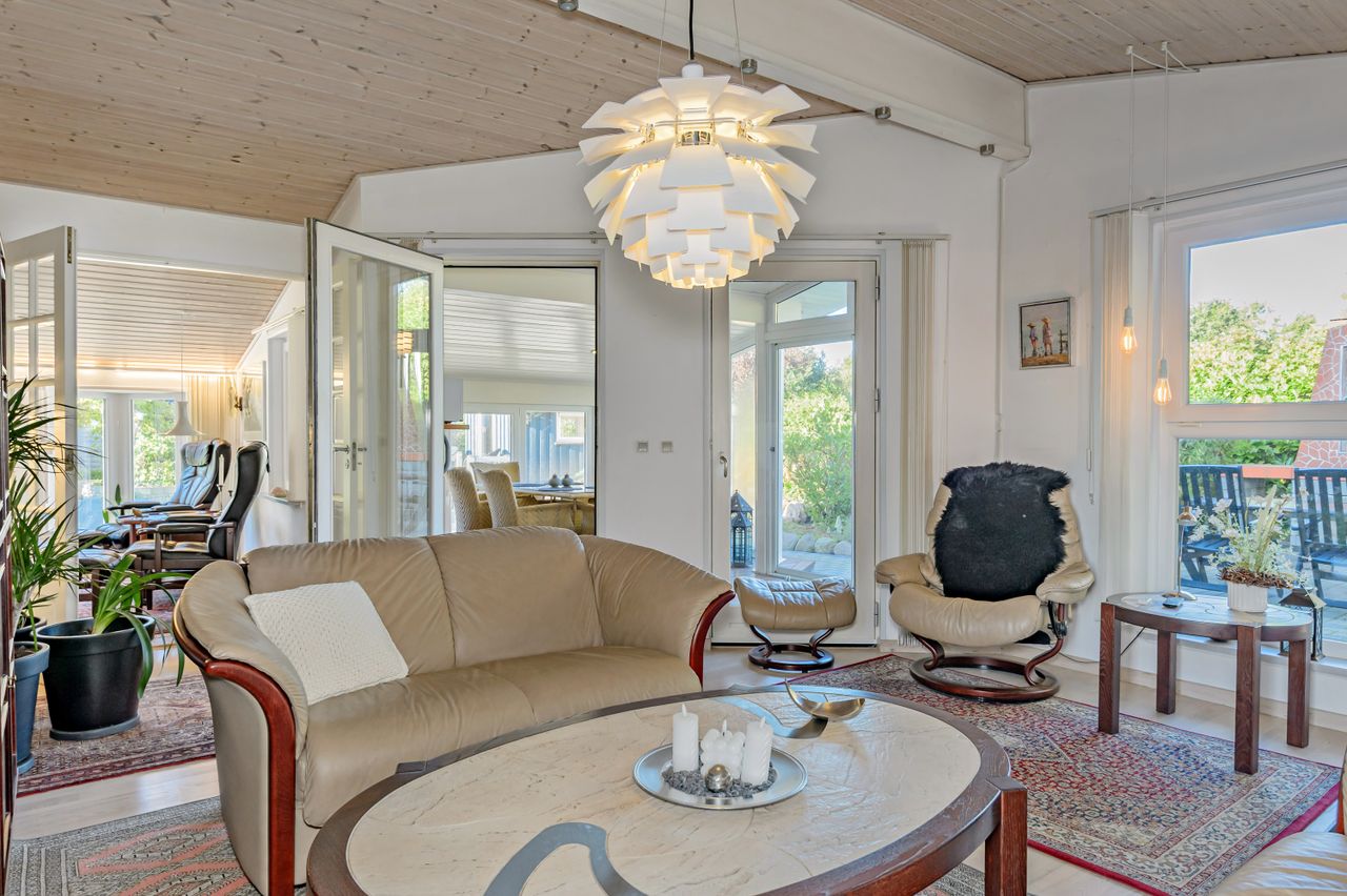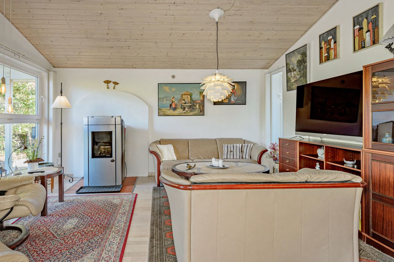 Boligen byder på et dejligt lyst køkken med spiseplads og brændeovn, hvorfra der er adgang til en stor og indbydende spisestue. Herfra er der videre adgang til en hyggelig tv-stue med en stor pilleovn, som sikrer varme og stemning året rundt. Begge stuer har udgang til en flot og lys udestue, der fungerer som et ekstra opholdsrum med direkte adgang til terrasserne i haven. Boligen rummer også to soveværelser, hvoraf det ene har eget stort badeværelse med bruseniche. Derudover findes et ekstra badeværelse, som både har bruseniche og spabad, så der er god plads til afslapning og velvære. I bryggers er der indrettet praktisk vaskesektion med vaskemaskine og tørretumbler.