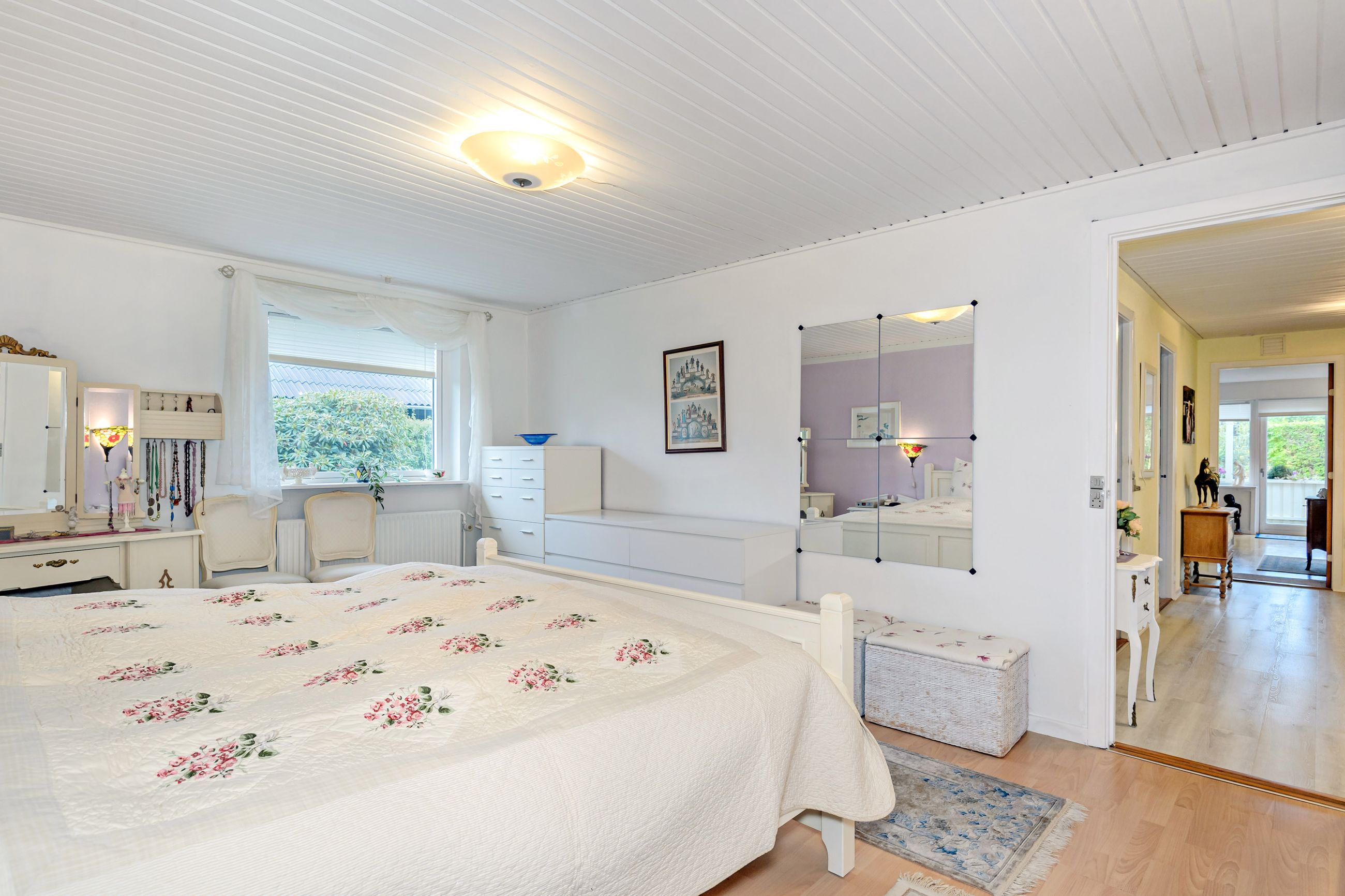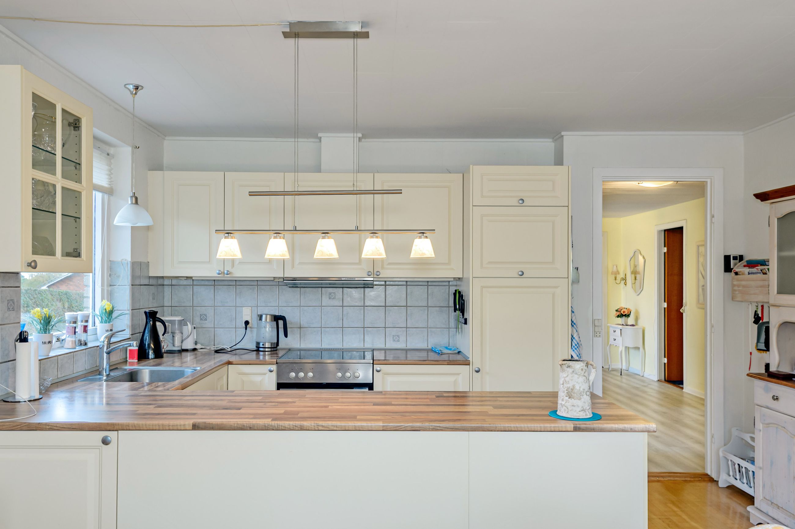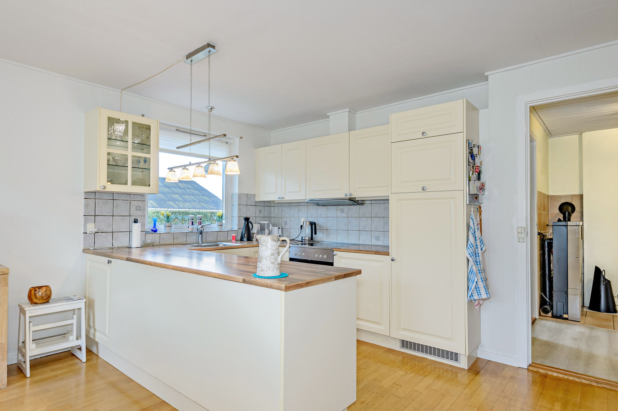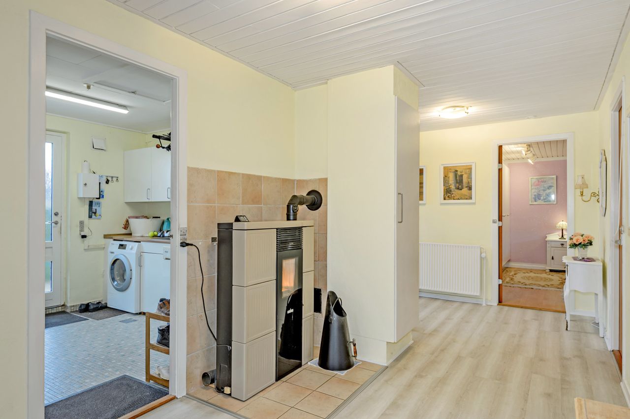 Villaen er opført med murede facader, malet eternittag og vinduer primært med energiglas. God og lys indretning: Entre/fordeling med garderobeplads og en træpilleovn, som kan reducere varmeregningen, bryggers med fjernvarme, vaskemaskine/tørretumbler og praktisk bordplads med vask, stort soveværelse med skabsvæg, 2 gode værelser - det ene med fast skab, flisebadeværelse med badekar, bruseniche, gulvvarme og 2 håndvaske, hvidt køkken med rigtig god skabs- og bordplads, stor spiseplads, delvis åben stue mod køkkenet. Der er et fantastisk godt lysindfald i køkken og stue. Udgang til den dejligste vestvendt terrasse som er delvist overdækket. Flotte trægulve i opholdsrum og værelser, lyse lofter.