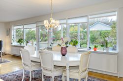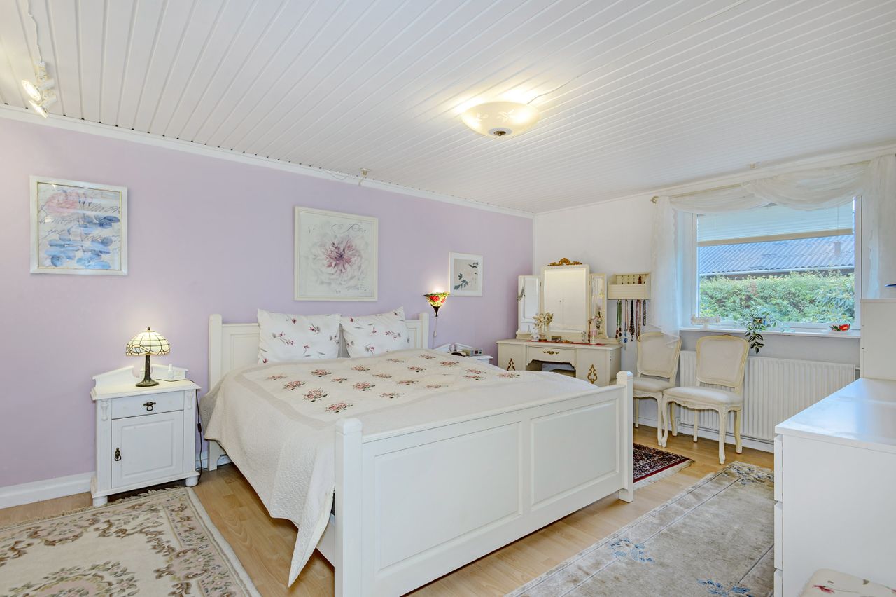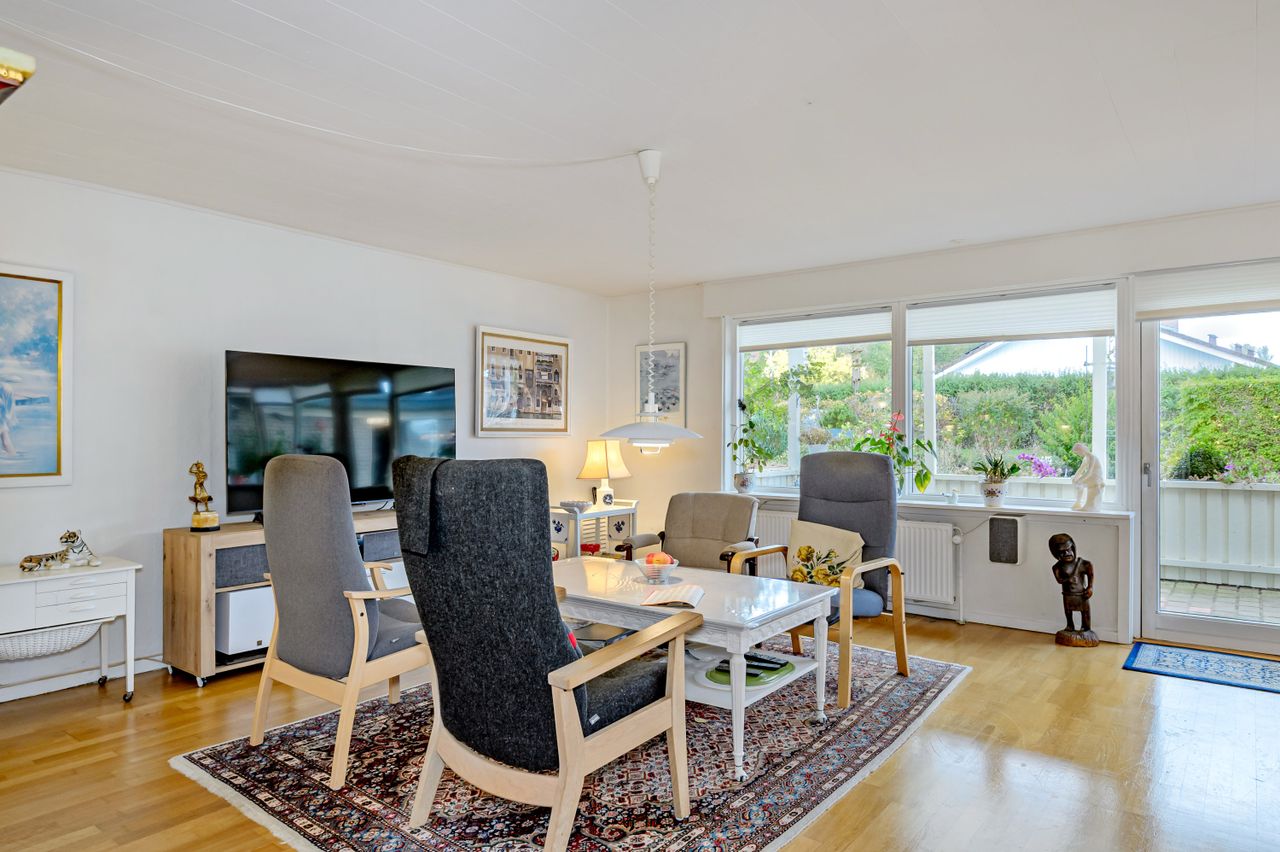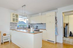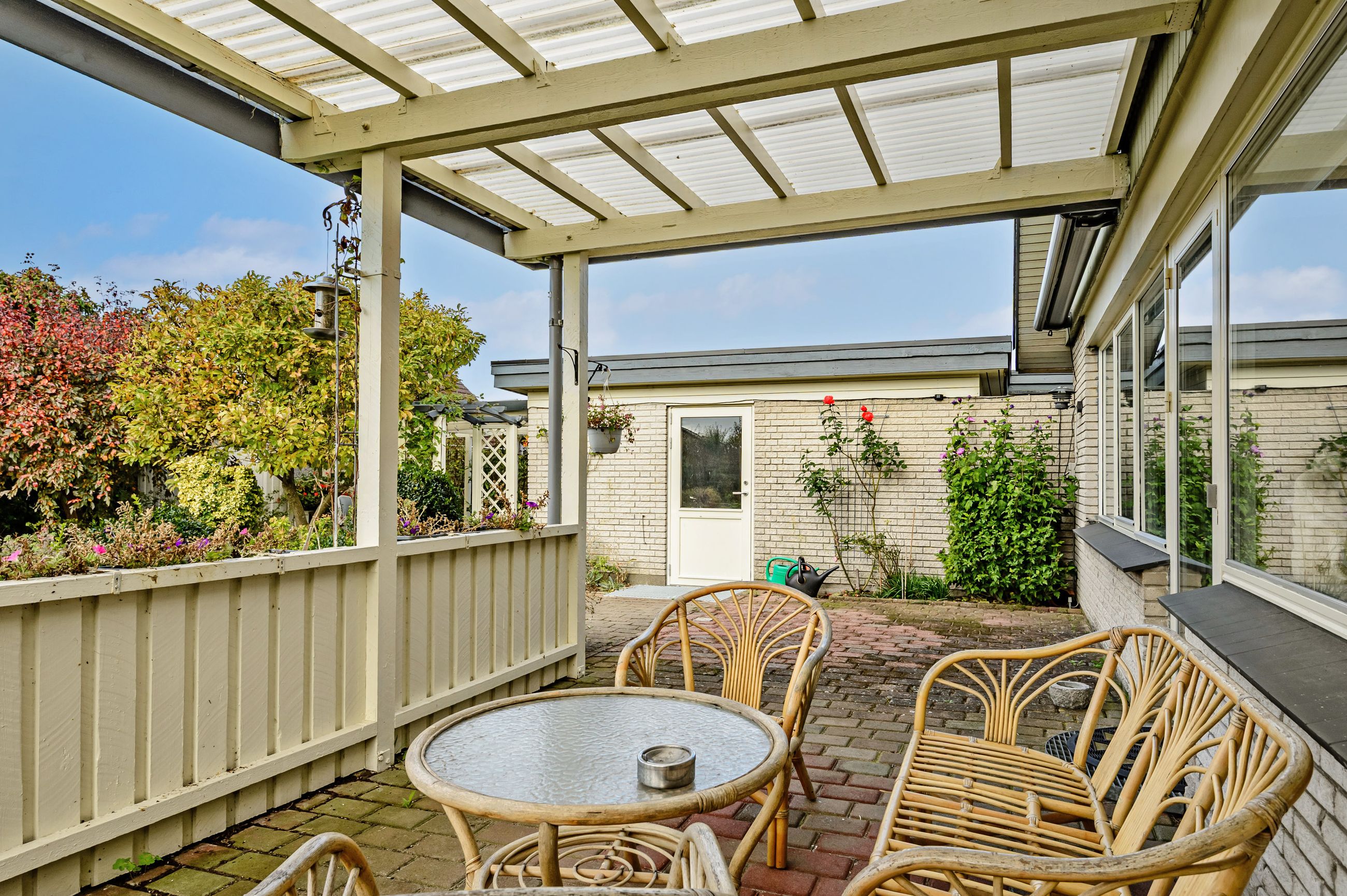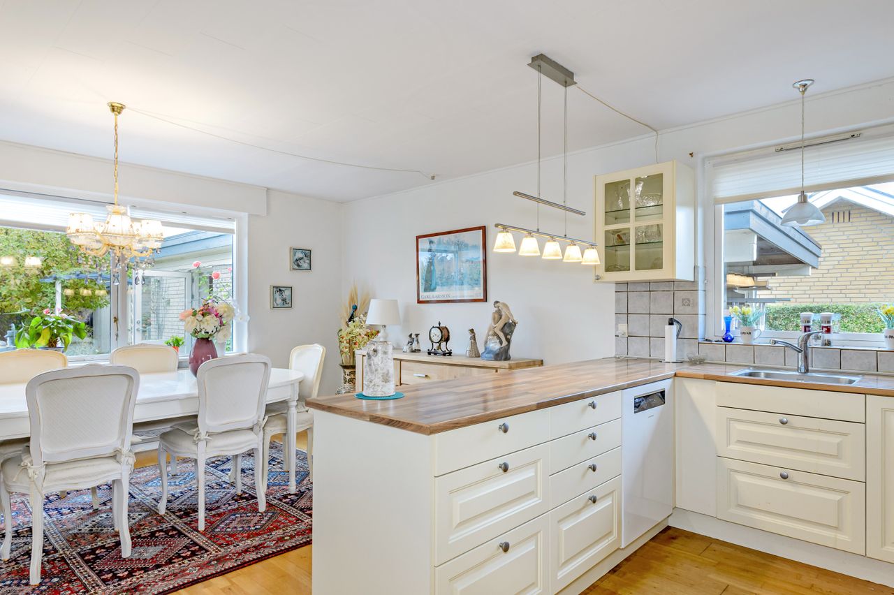 Villaen er opført med murede facader, malet eternittag og vinduer primært med energiglas. God og lys indretning: Entre/fordeling med garderobeplads og en træpilleovn, som kan reducere varmeregningen, bryggers med fjernvarme, vaskemaskine/tørretumbler og praktisk bordplads med vask, stort soveværelse med skabsvæg, 2 gode værelser - det ene med fast skab, flisebadeværelse med badekar, bruseniche, gulvvarme og 2 håndvaske, hvidt køkken med rigtig god skabs- og bordplads, stor spiseplads, delvis åben stue mod køkkenet. Der er et fantastisk godt lysindfald i køkken og stue. Udgang til den dejligste vestvendt terrasse som er delvist overdækket. Flotte trægulve i opholdsrum og værelser, lyse lofter.
