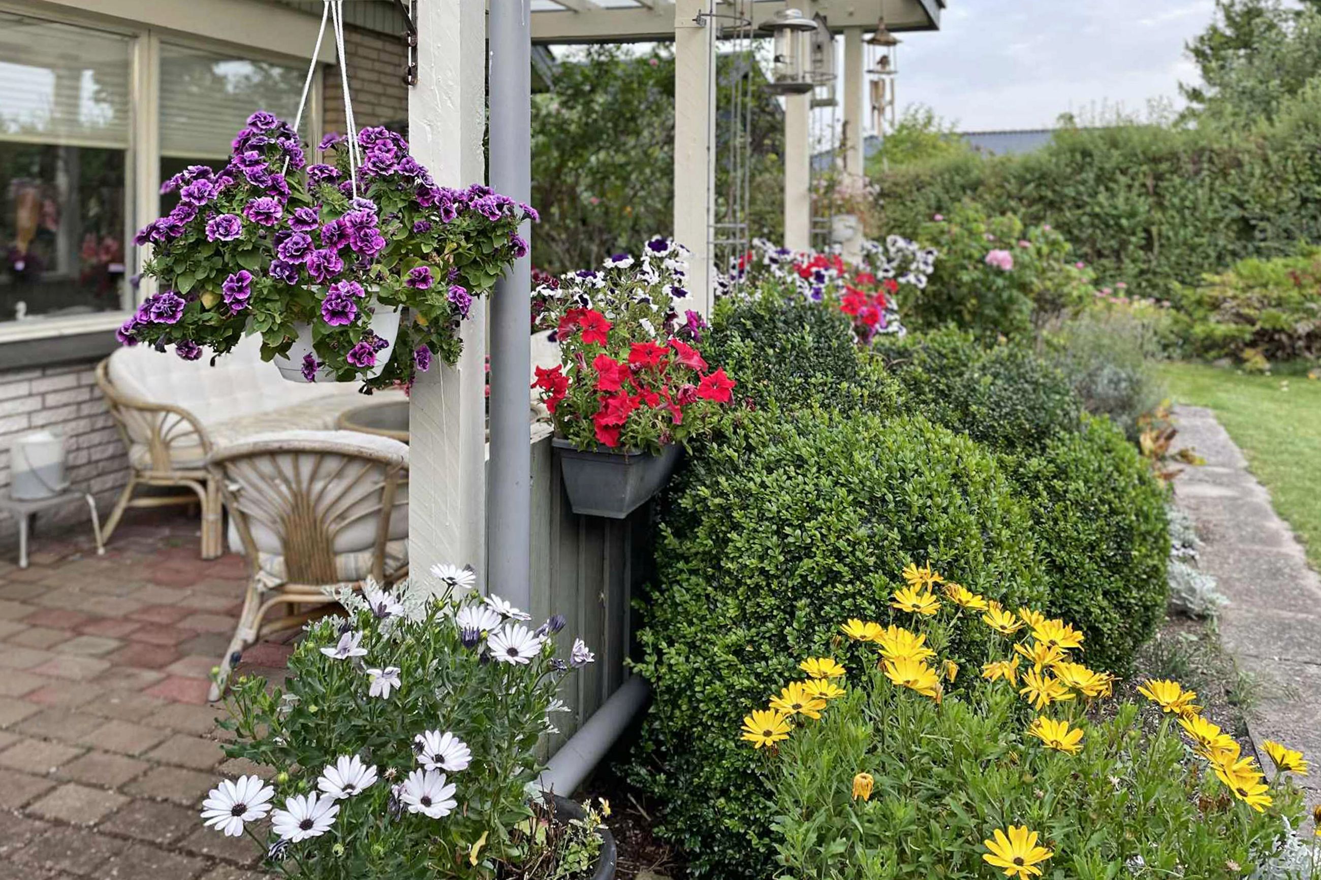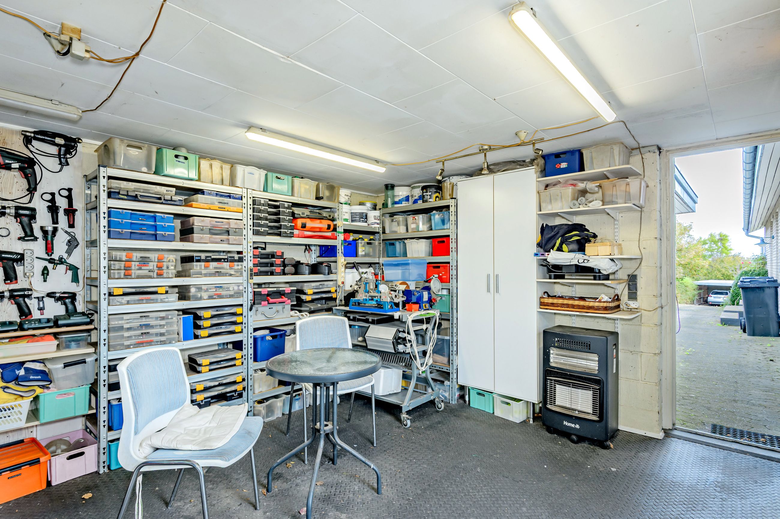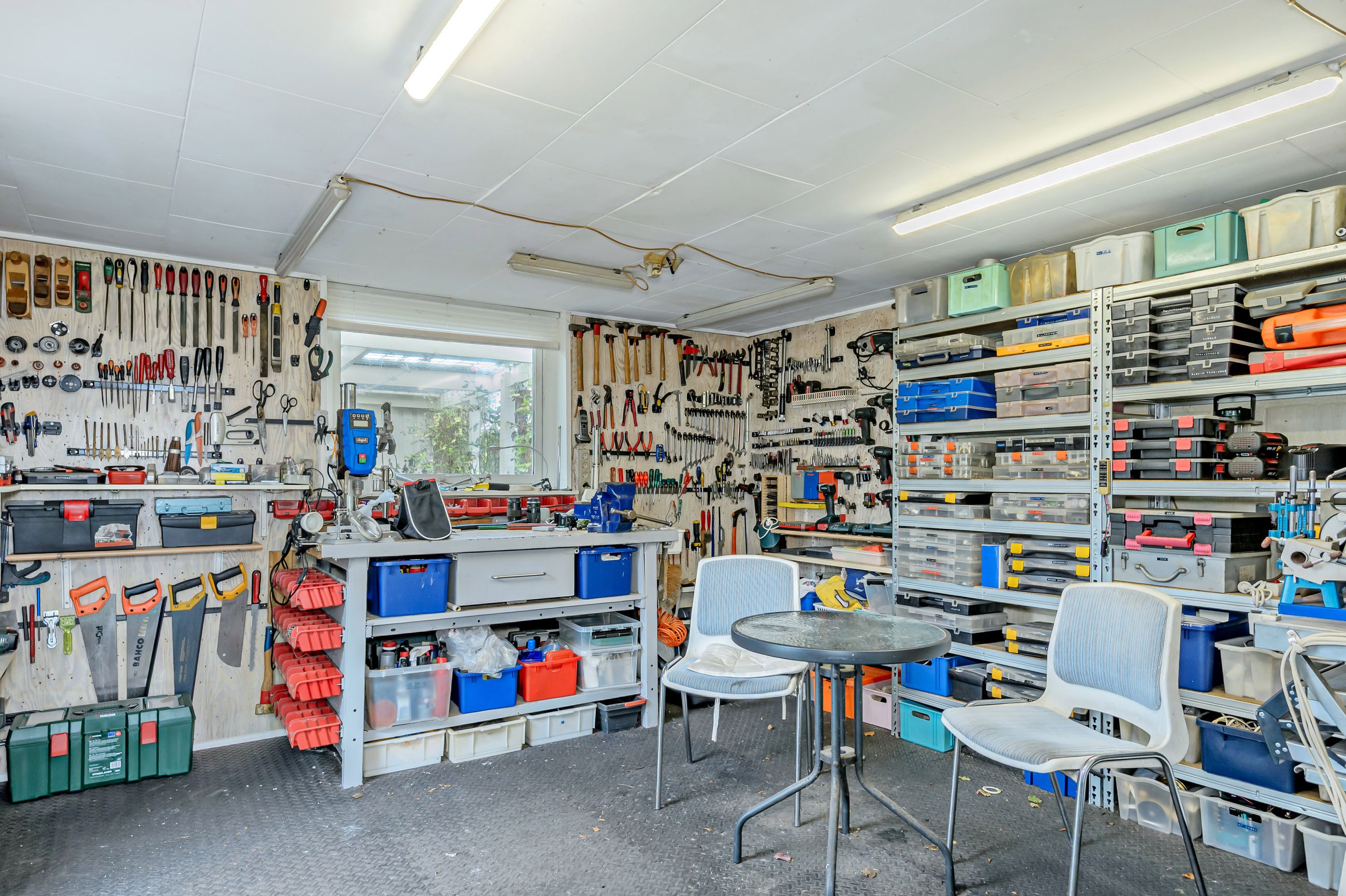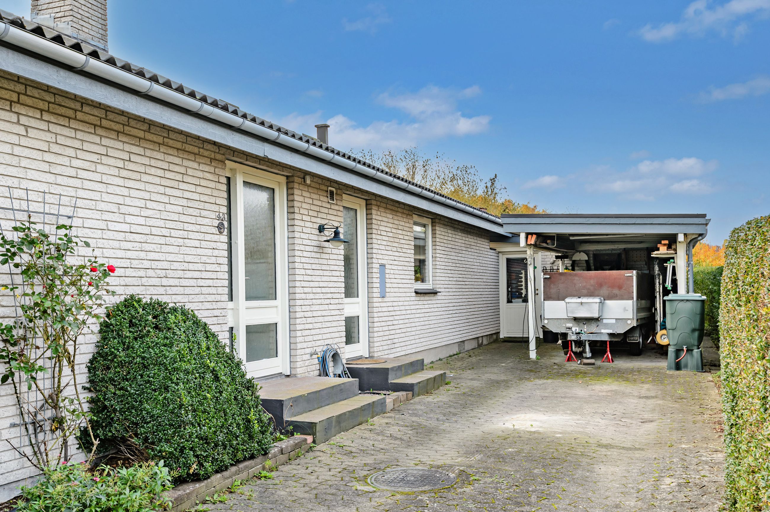 Carport og et godt udhus/hobbyværksted. Yderligere et udhus til haveredskaber mv. Haven har været sælgers store passion og er meget velholdt og varieret i beplantningen, flot stensætning mod villavejen.
