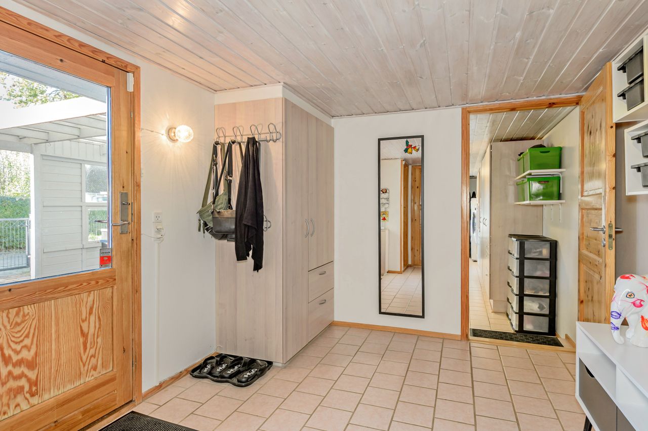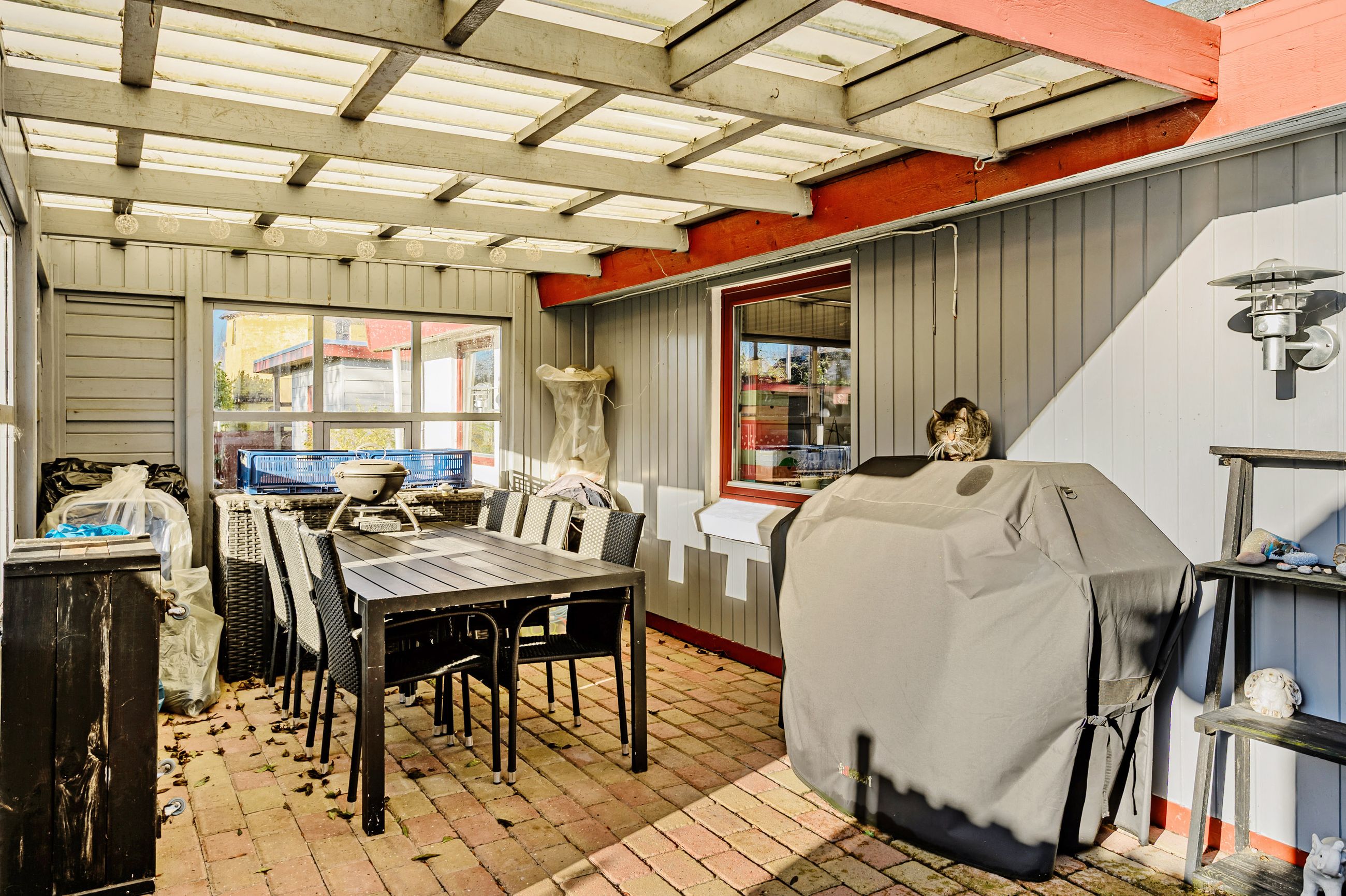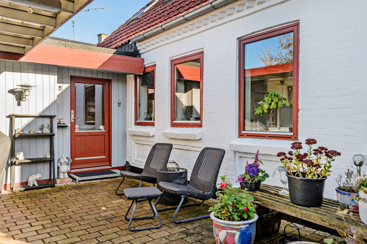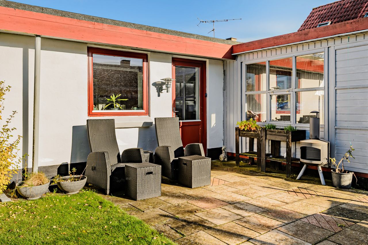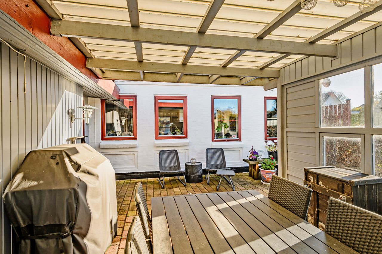 Og så ligger der ved indgangen til boligen en sydvendt hyggelig, overdækket og næsten helt lukket terrasse, hvor der kan nydes mange gode timer - både forår, sommer og efterår.
