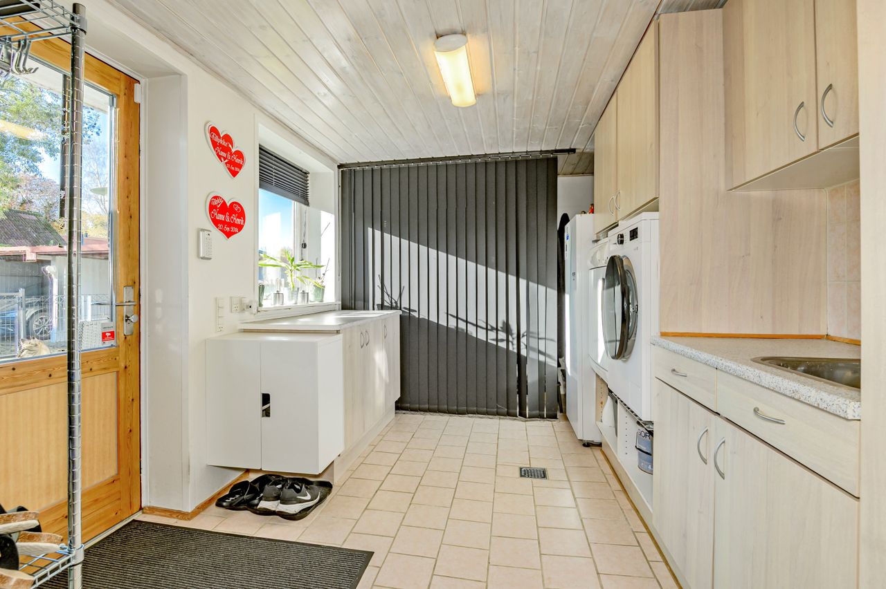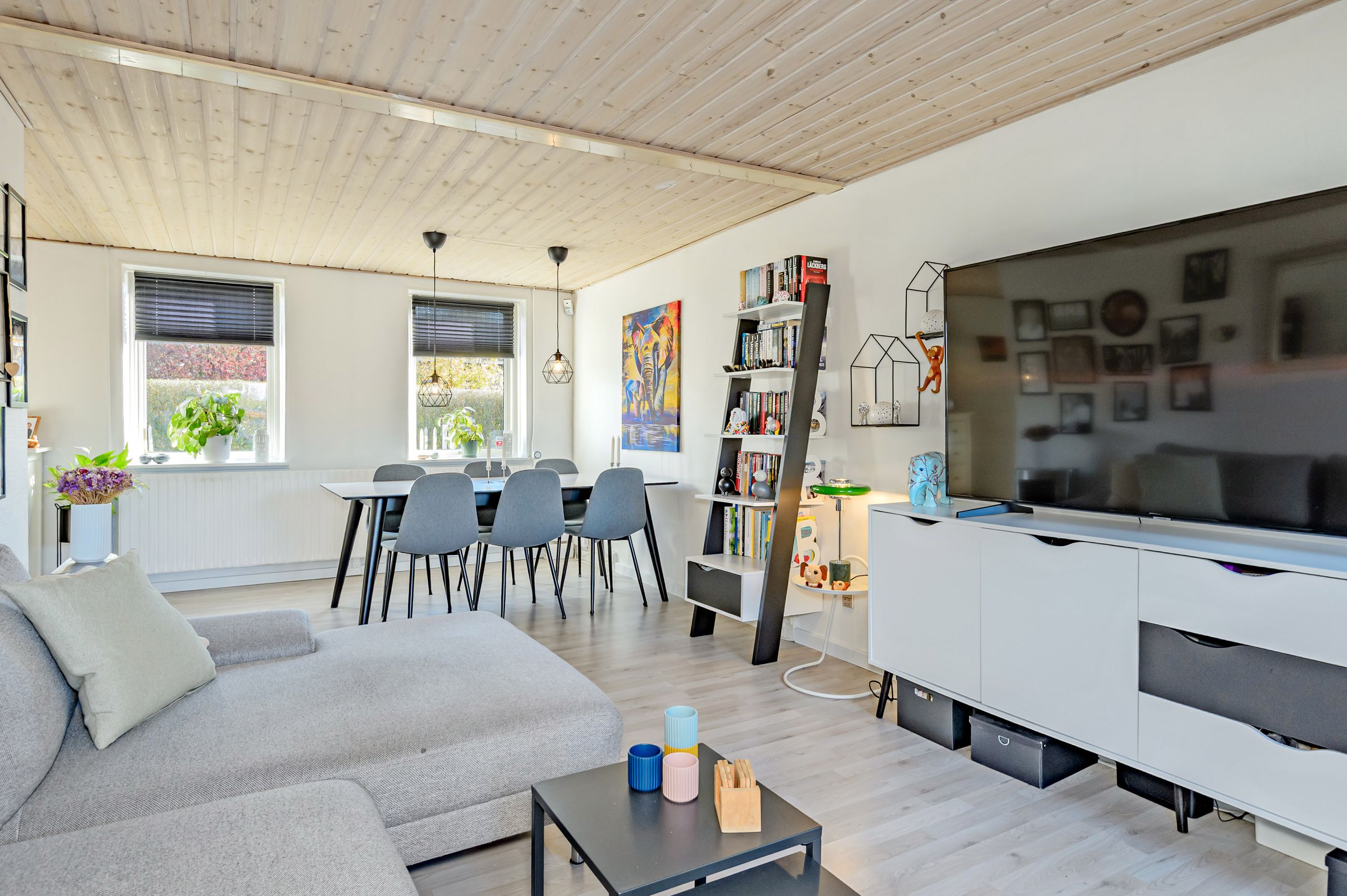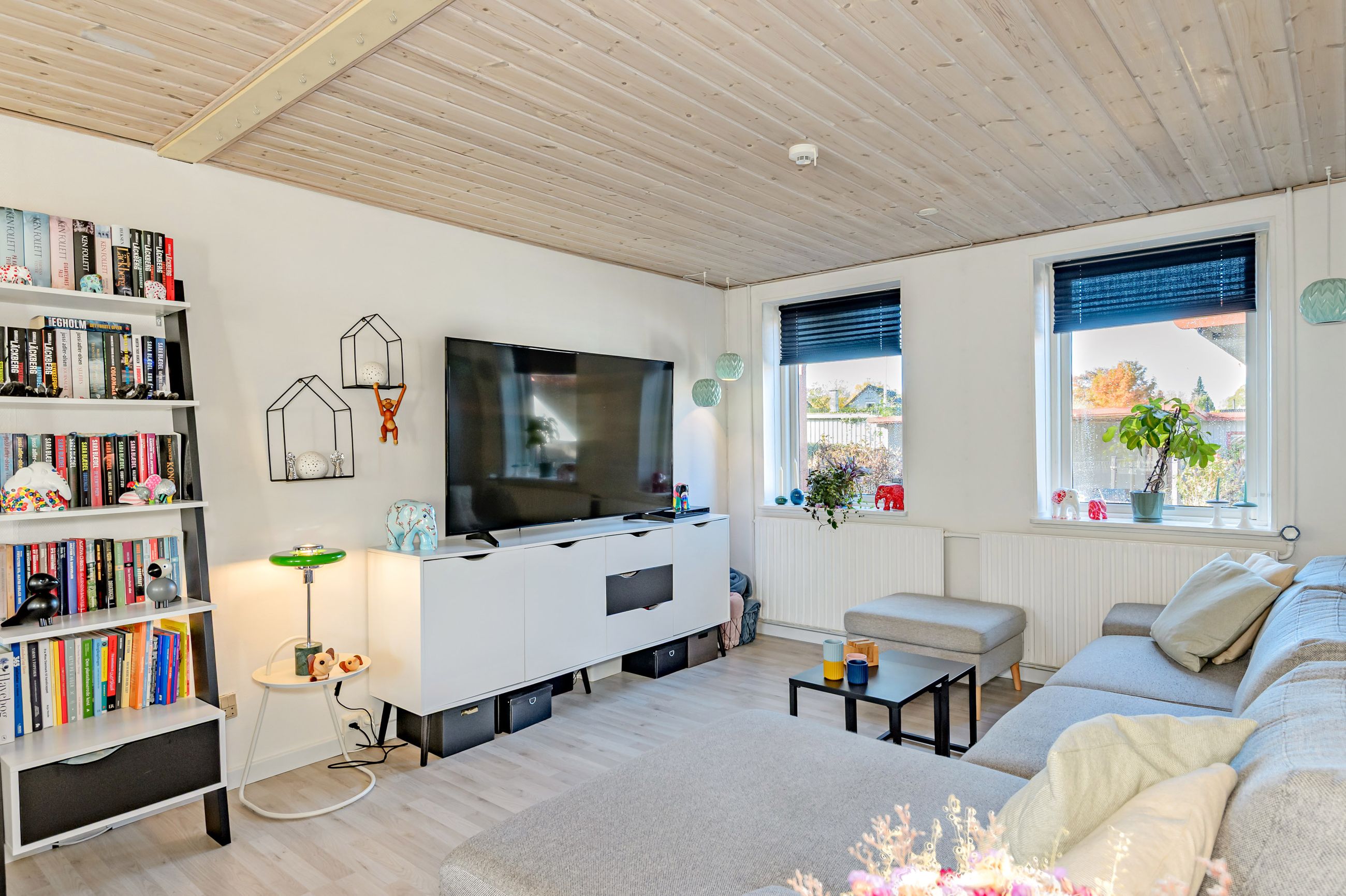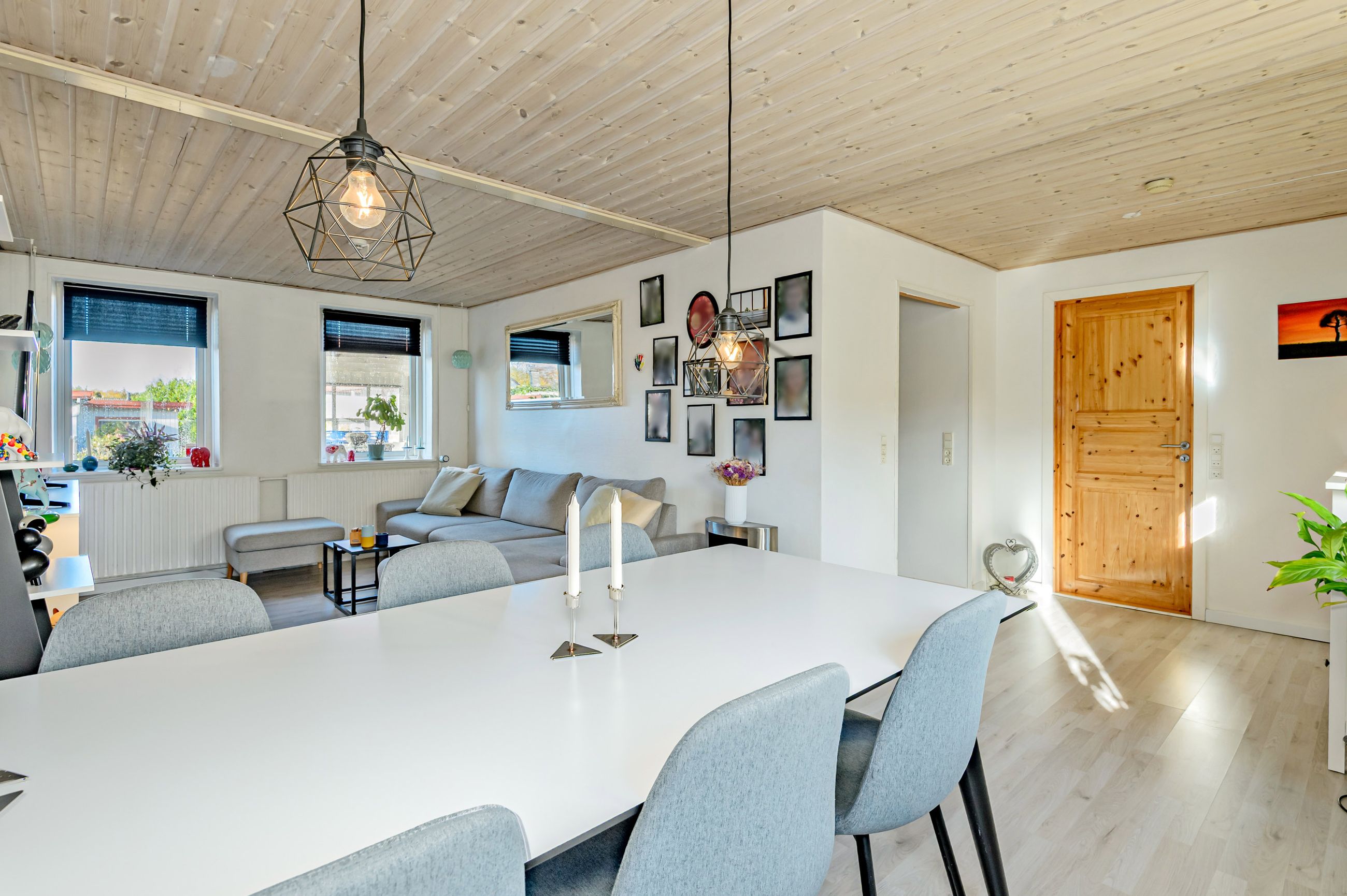 Og så ligger der ved indgangen til boligen en sydvendt hyggelig, overdækket og næsten helt lukket terrasse, hvor der kan nydes mange gode timer - både forår, sommer og efterår.
