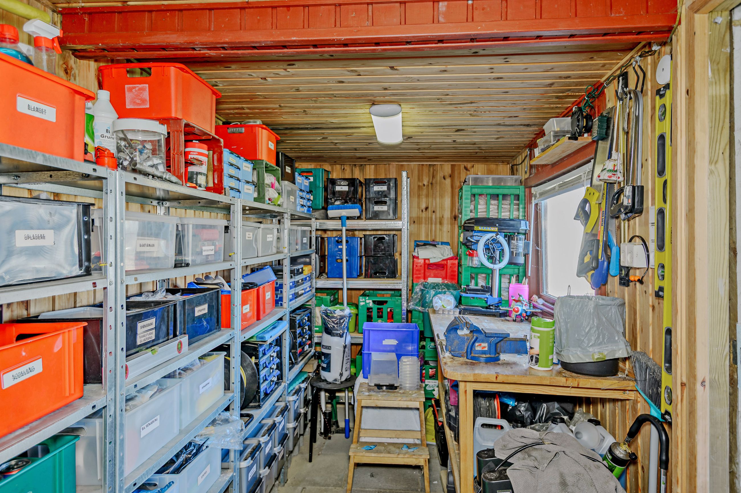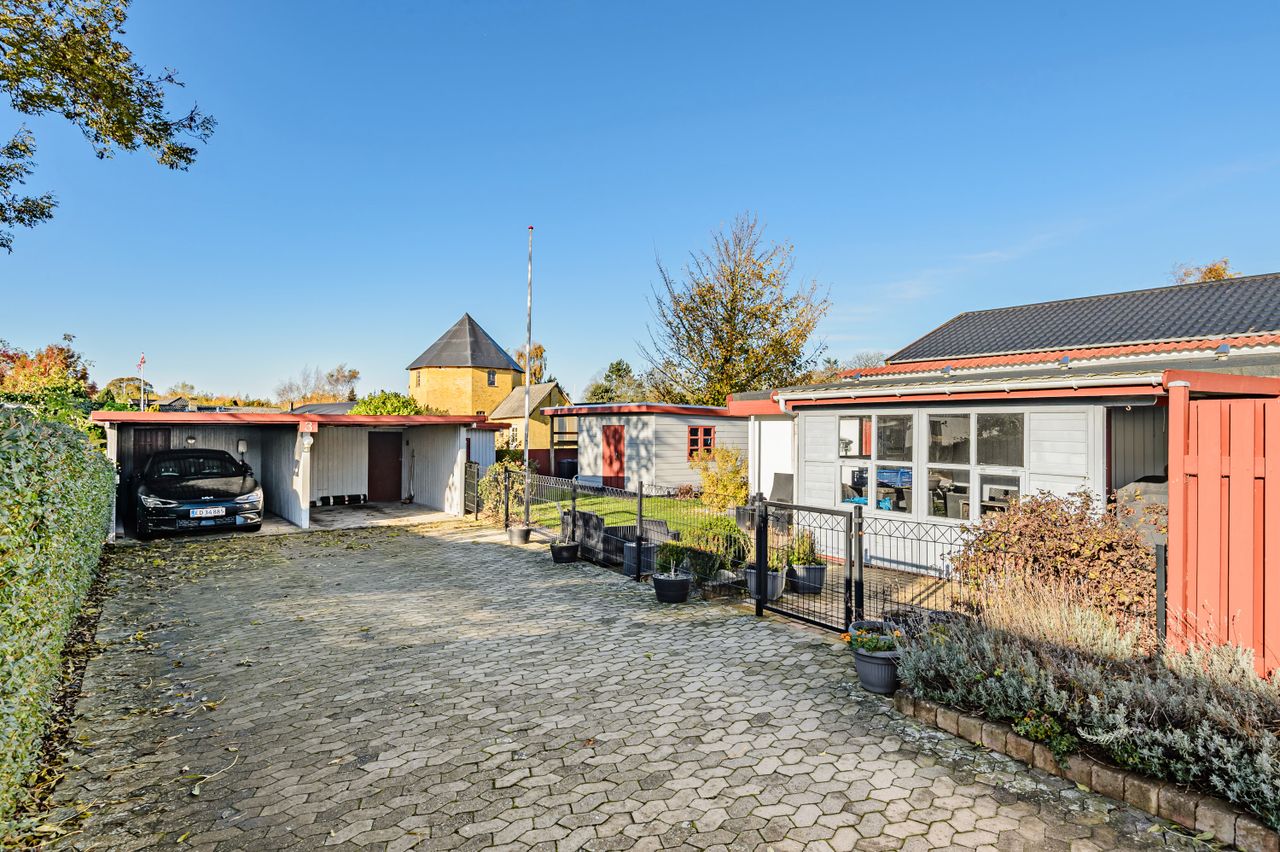 Der er en bred flisebelagt indkørsel frem til den dobbelte carport og udhus/værksted. Haven er velanlagt, indhegnet og nem at passe. Her er også opført et nyere isoleret udhus i vedligeholdelsesfrit "træ", og udhuset kan benyttes til mange formål.