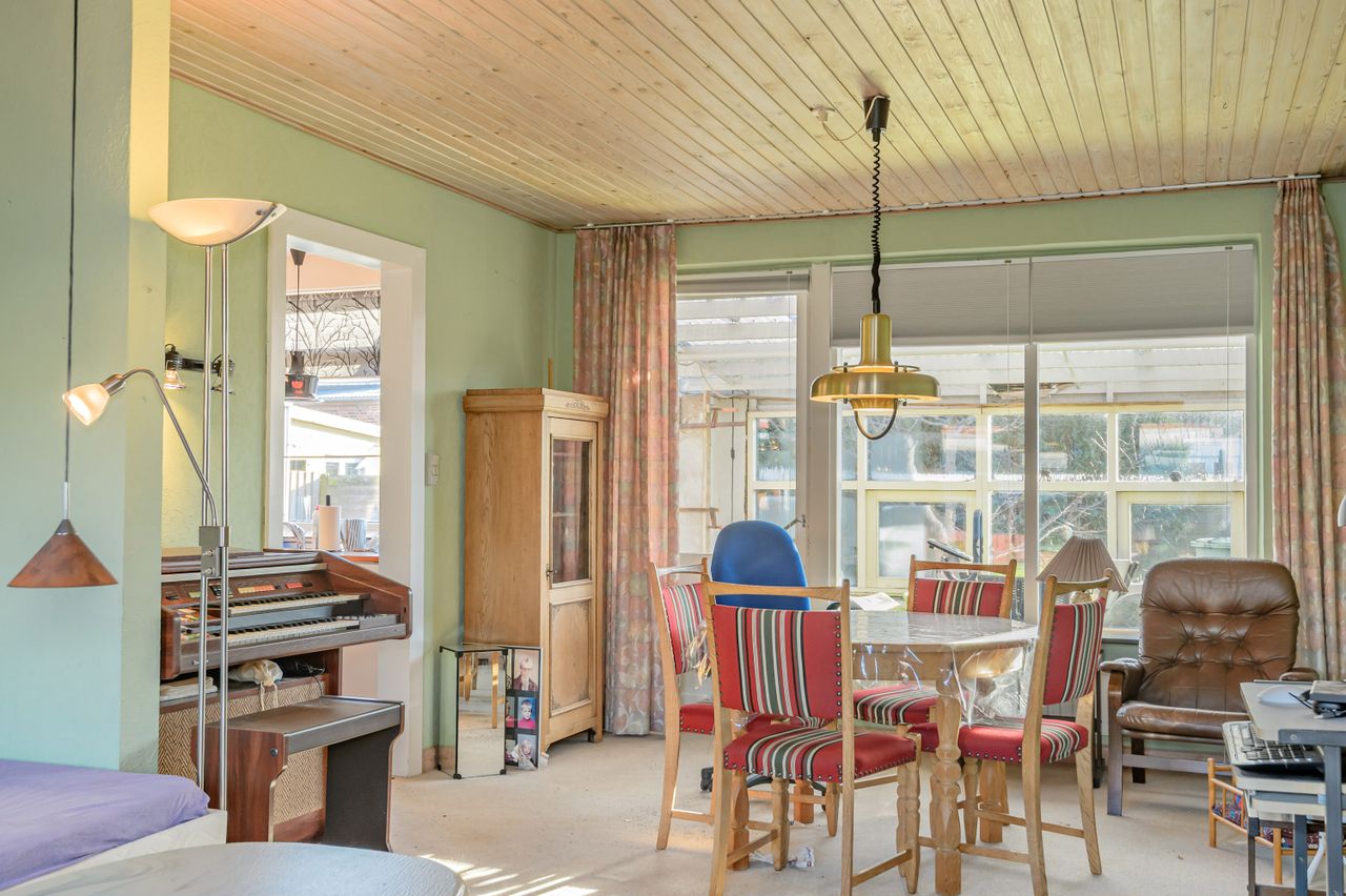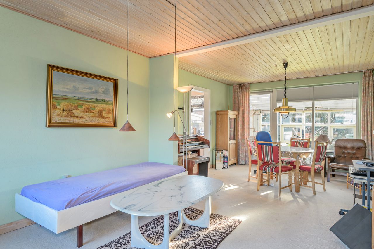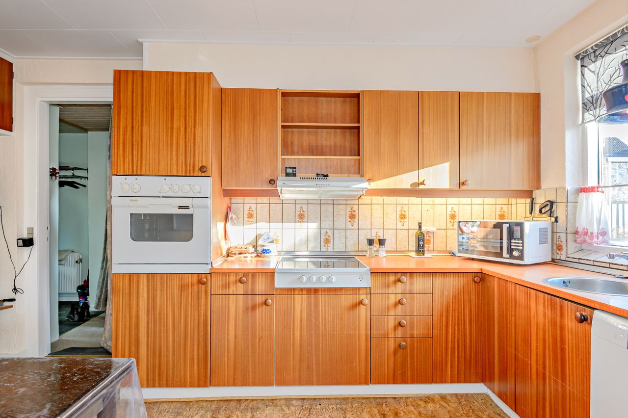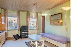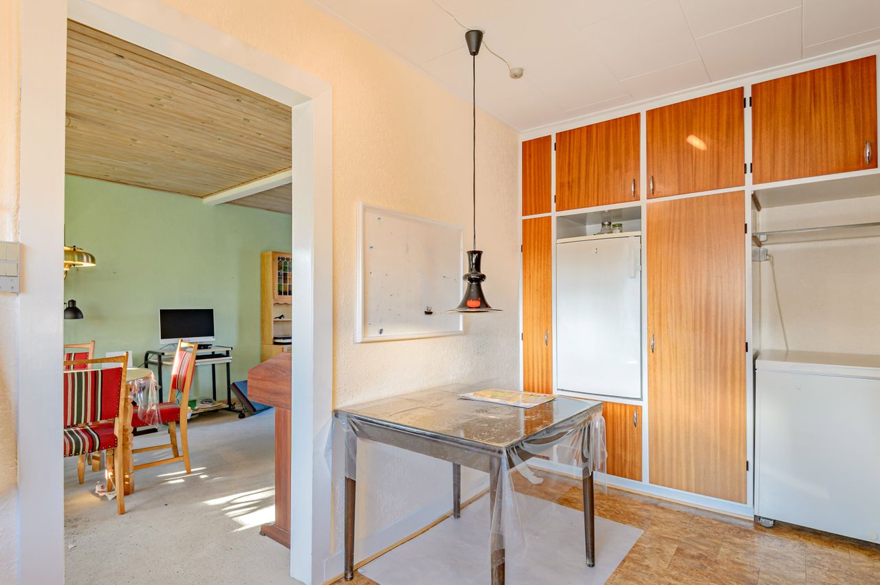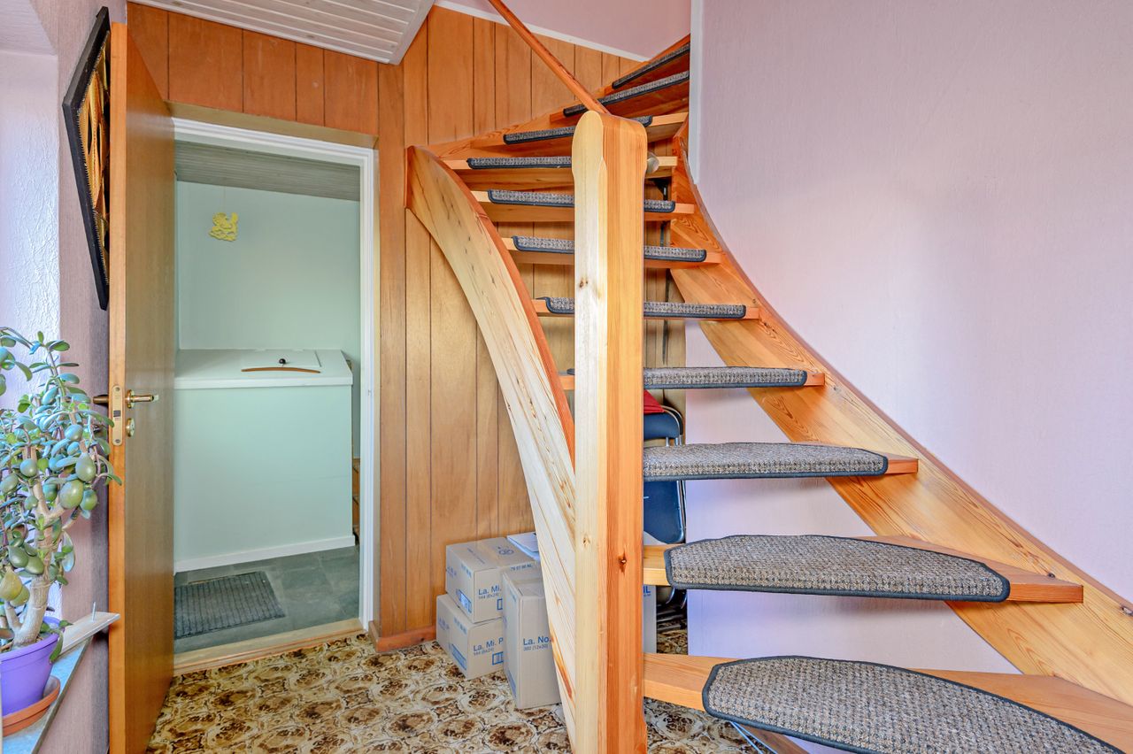 Indretningen er fin og rummer i stueplan: Entre/indgangsparti med garderobeplads og en næsten ny fjernvarmeunit, badeværelse med lyse fliser til loftet, bruseniche og gulvvarme, elementkøkken med god bordplads og mulighed for en lille spiseplads, rummelig stue med plads til spiseafdeling og hyggekrog med sofaer og tv, trapperum med god trappe til 1. sal. Fra stuen udgang til en hyggelig ældre overdækket terrasse. 1. sal: Soveværelse med skabsvæg, meget stort værelse på ca. 17 m2 samt et lille værelse. Trægulve i flere rum, som evt. kan afslibes.