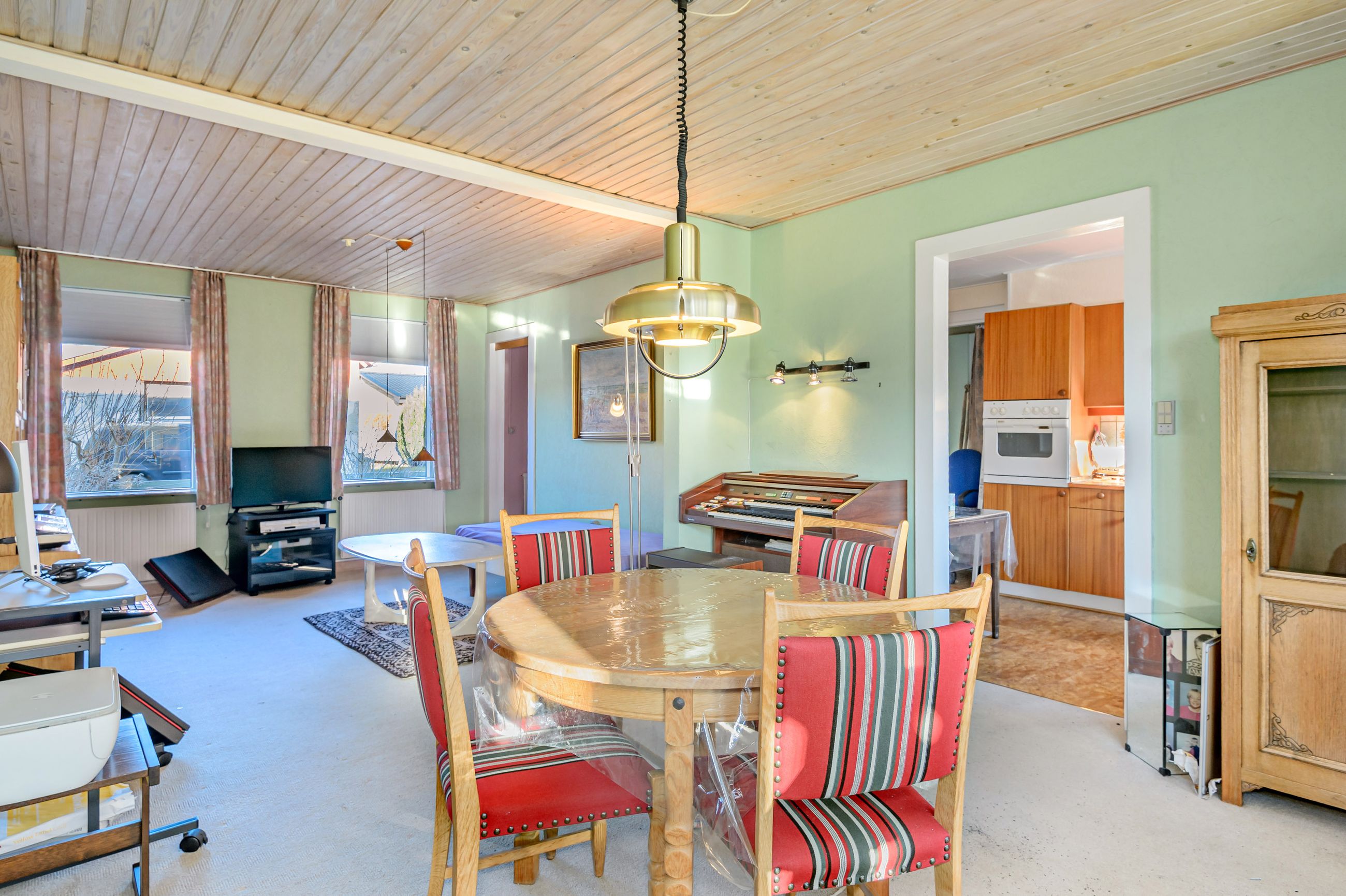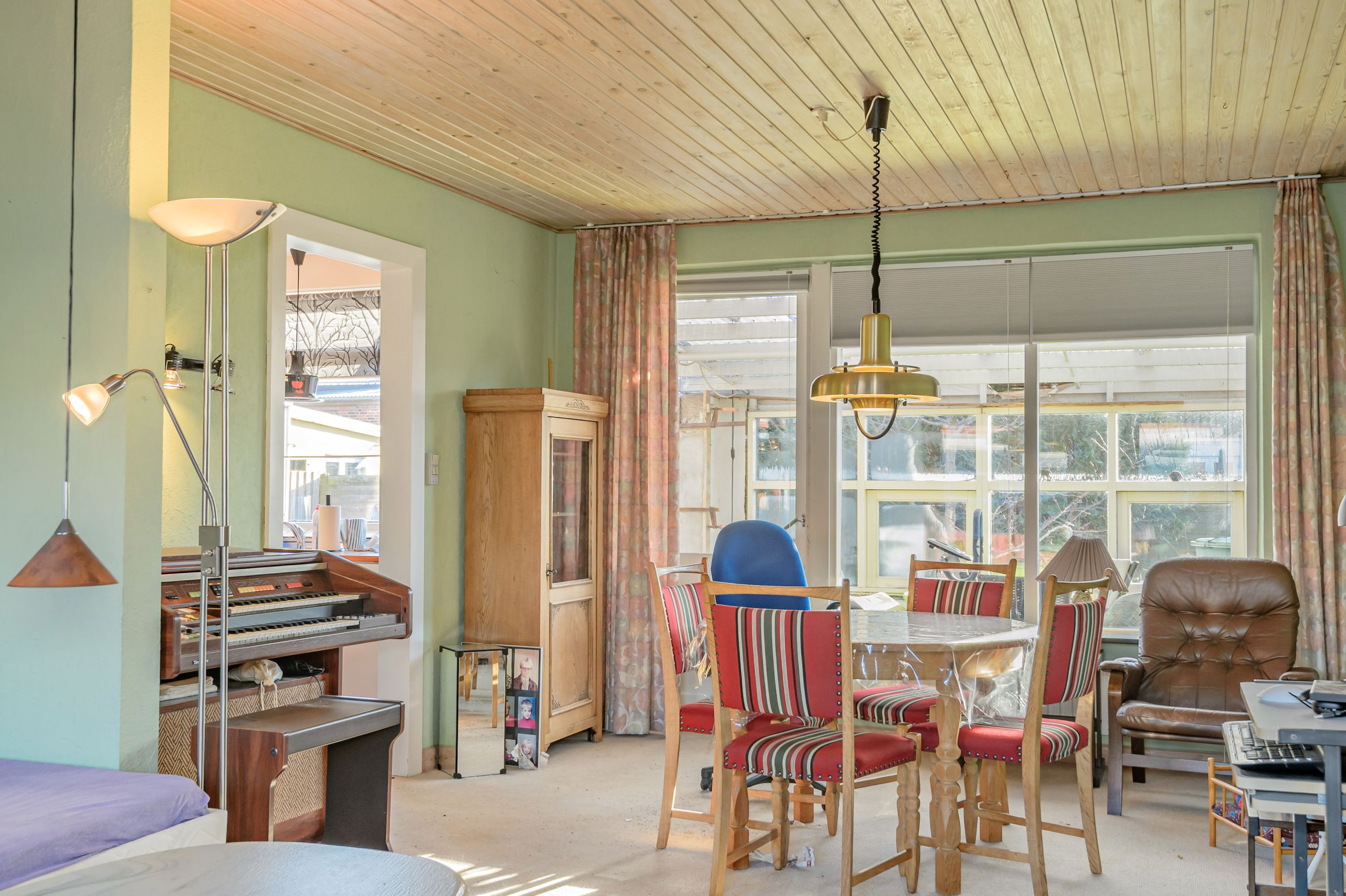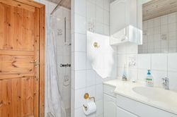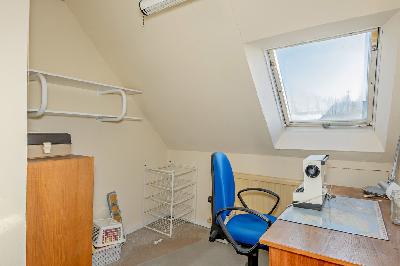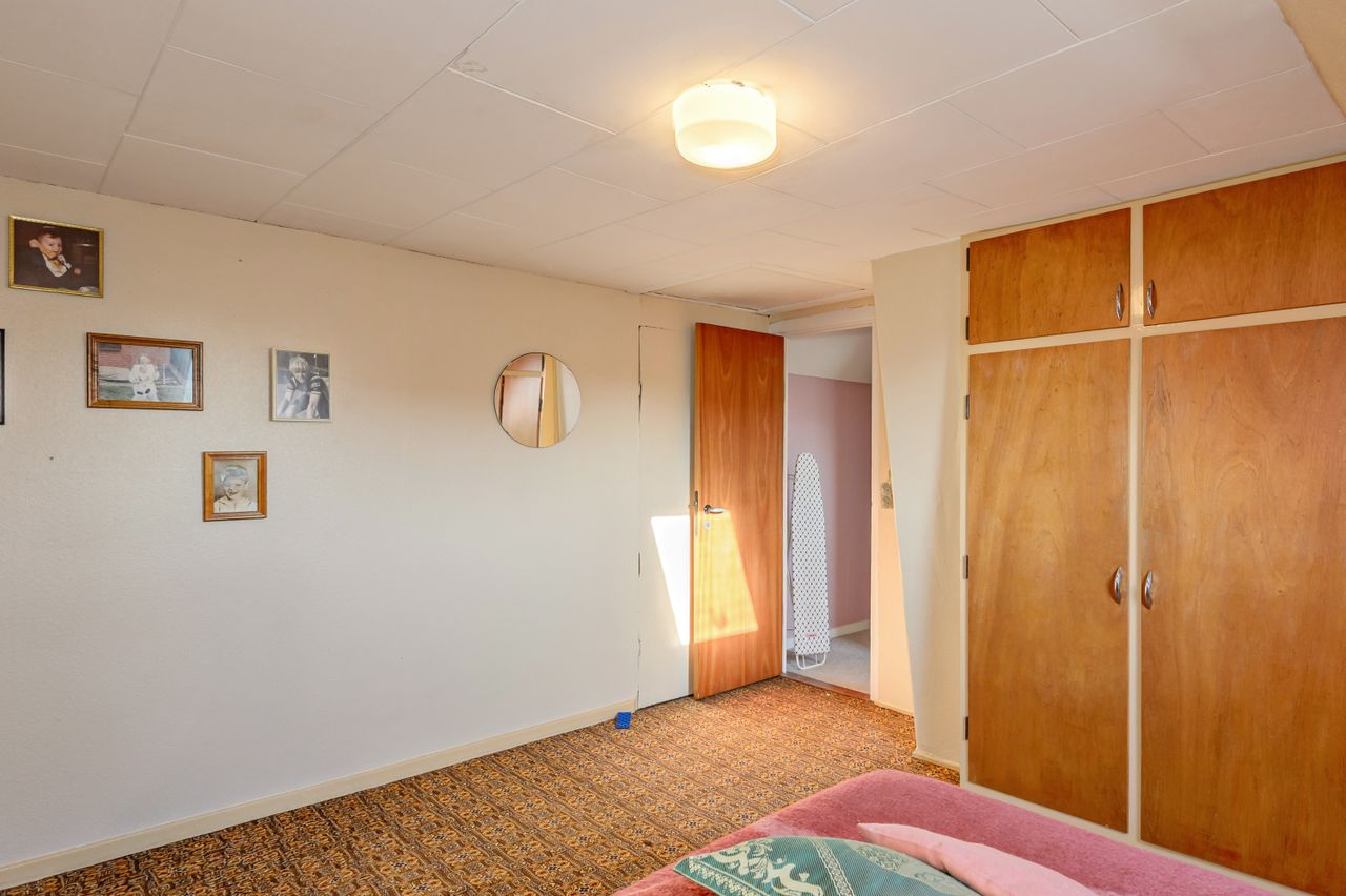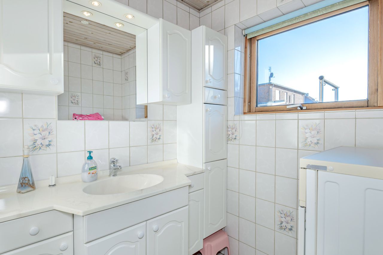 Indretningen er fin og rummer i stueplan: Entre/indgangsparti med garderobeplads og en næsten ny fjernvarmeunit, badeværelse med lyse fliser til loftet, bruseniche og gulvvarme, elementkøkken med god bordplads og mulighed for en lille spiseplads, rummelig stue med plads til spiseafdeling og hyggekrog med sofaer og tv, trapperum med god trappe til 1. sal. Fra stuen udgang til en hyggelig ældre overdækket terrasse. 1. sal: Soveværelse med skabsvæg, meget stort værelse på ca. 17 m2 samt et lille værelse. Trægulve i flere rum, som evt. kan afslibes.