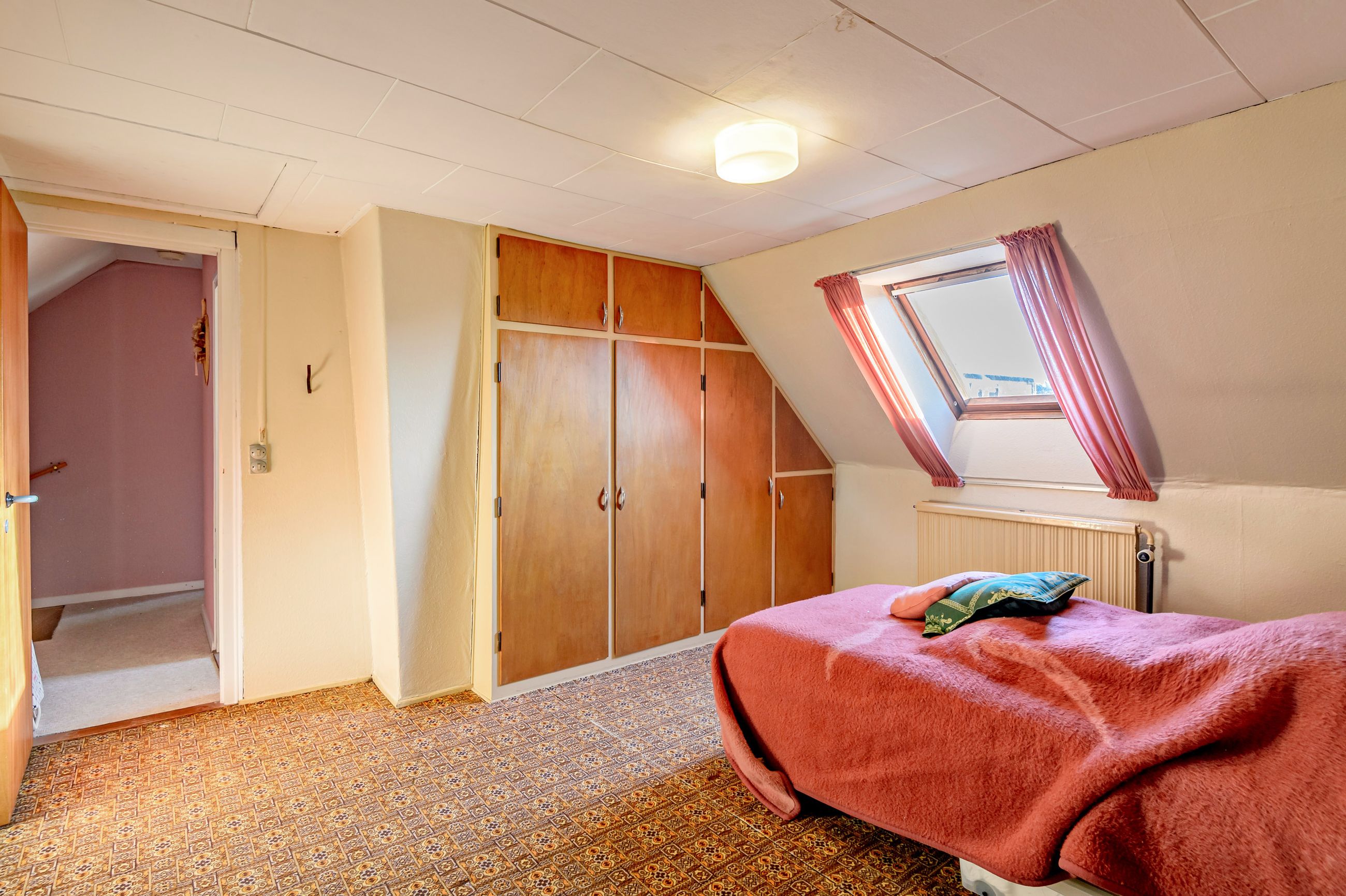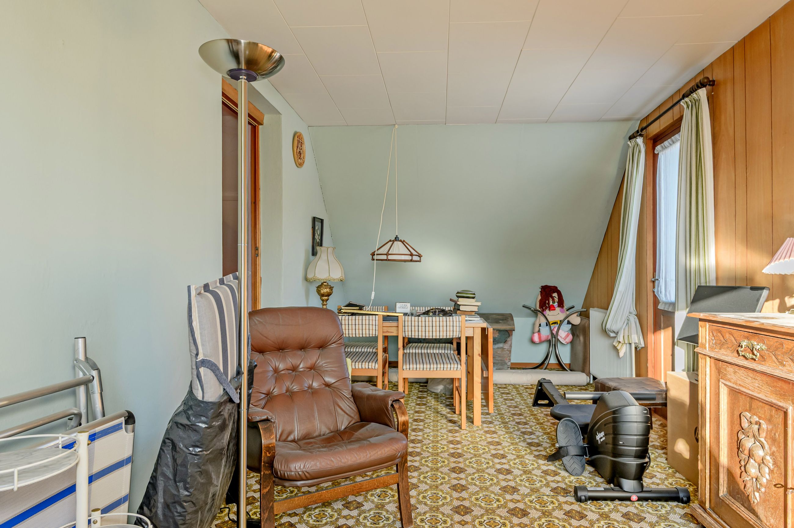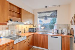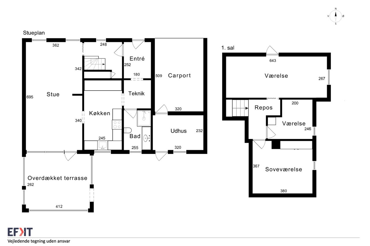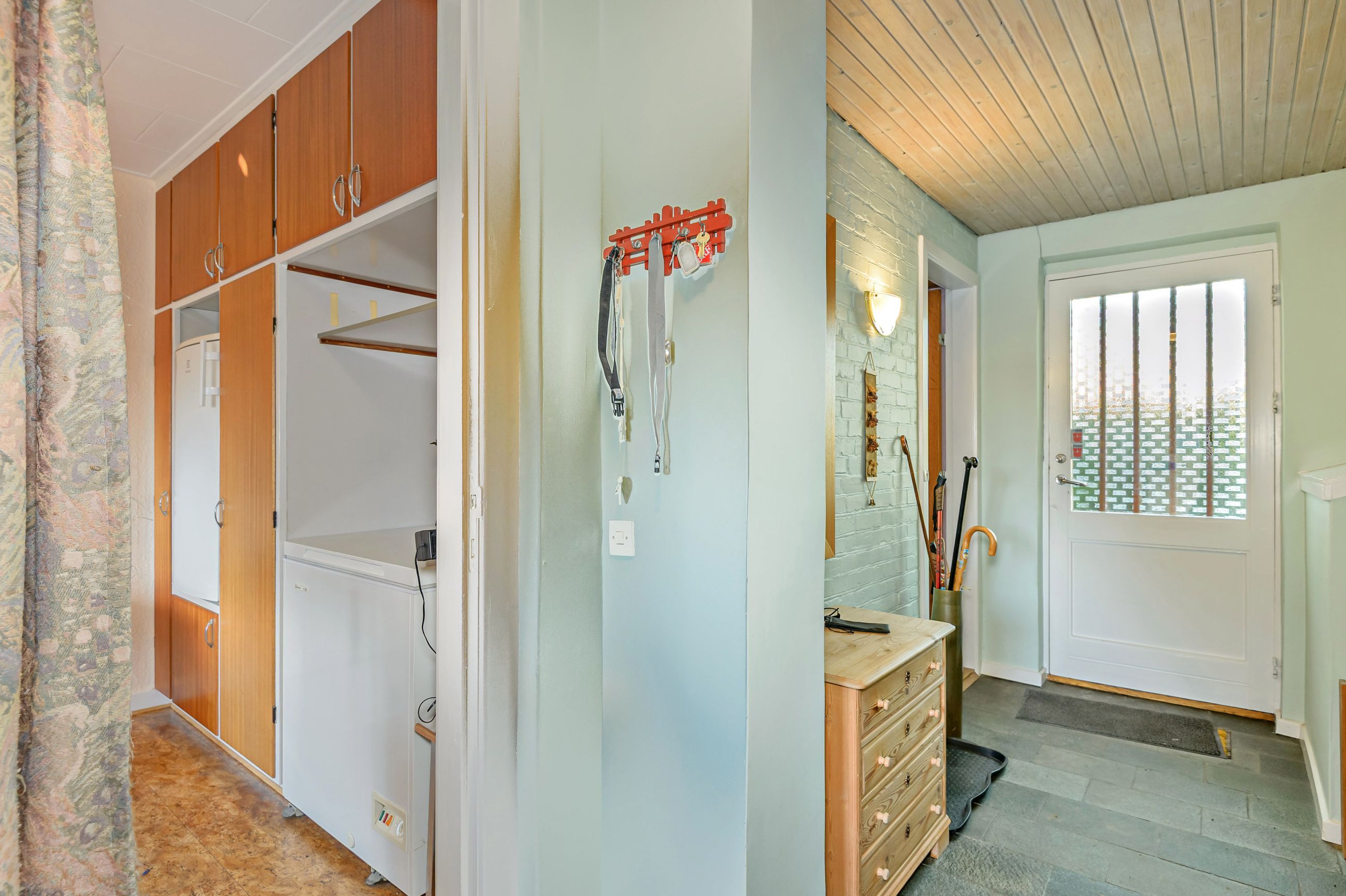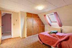 Indretningen er fin og rummer i stueplan: Entre/indgangsparti med garderobeplads og en næsten ny fjernvarmeunit, badeværelse med lyse fliser til loftet, bruseniche og gulvvarme, elementkøkken med god bordplads og mulighed for en lille spiseplads, rummelig stue med plads til spiseafdeling og hyggekrog med sofaer og tv, trapperum med god trappe til 1. sal. Fra stuen udgang til en hyggelig ældre overdækket terrasse. 1. sal: Soveværelse med skabsvæg, meget stort værelse på ca. 17 m2 samt et lille værelse. Trægulve i flere rum, som evt. kan afslibes.