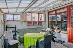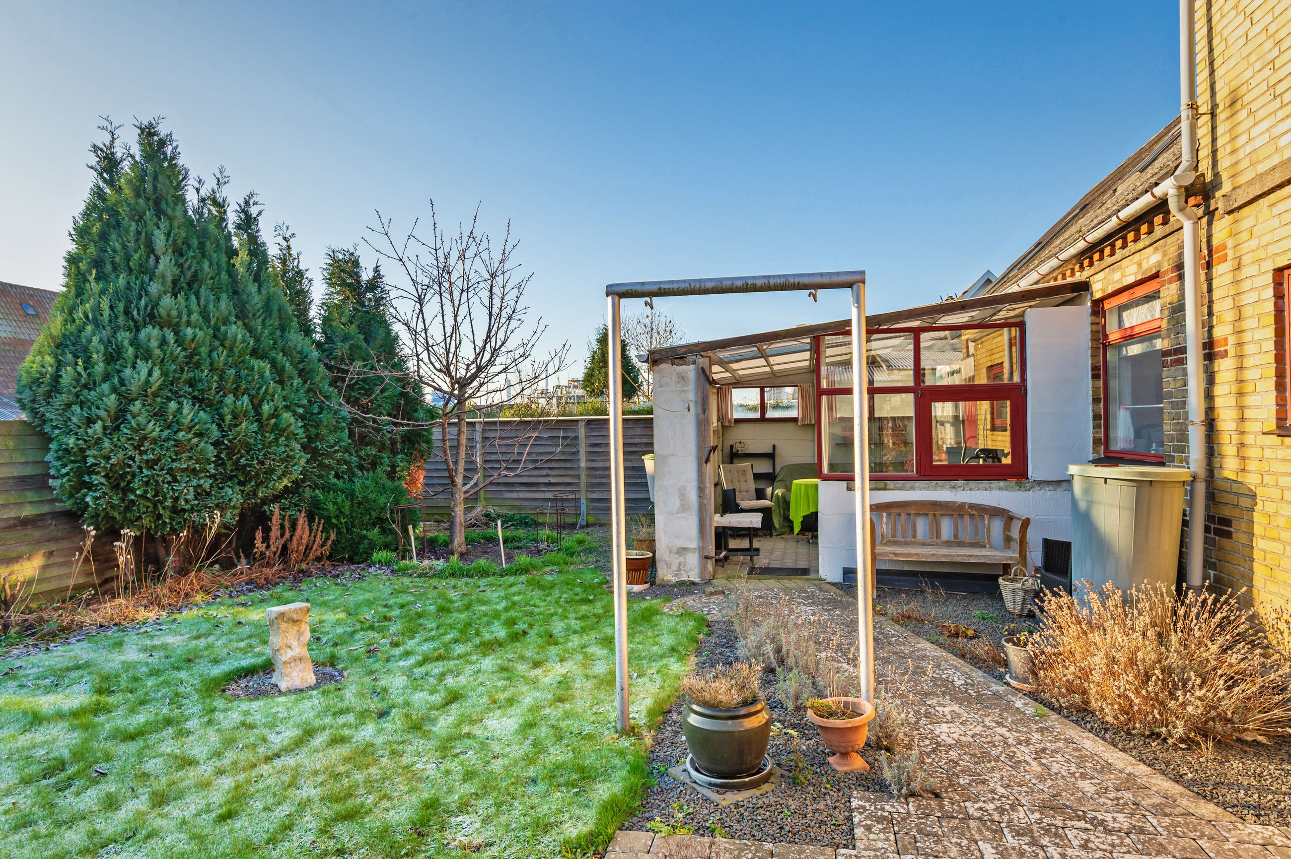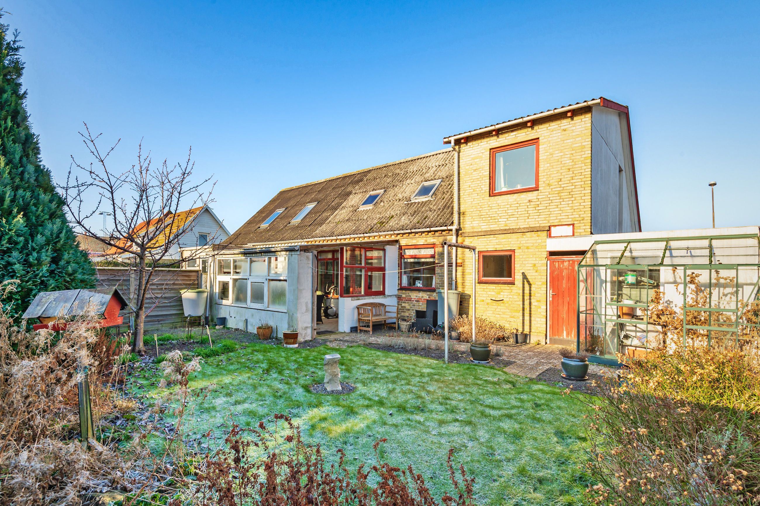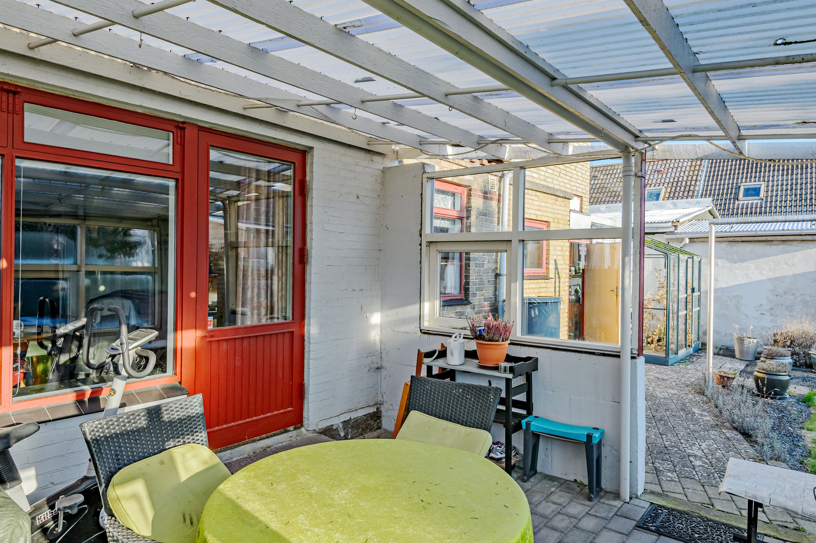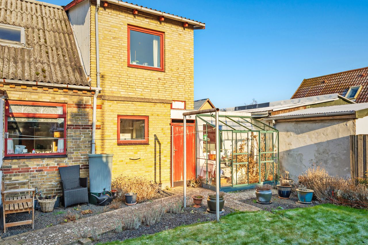 Carport og udhus. Nem lille have med græsplæne, enkelte bede og et drivhus.