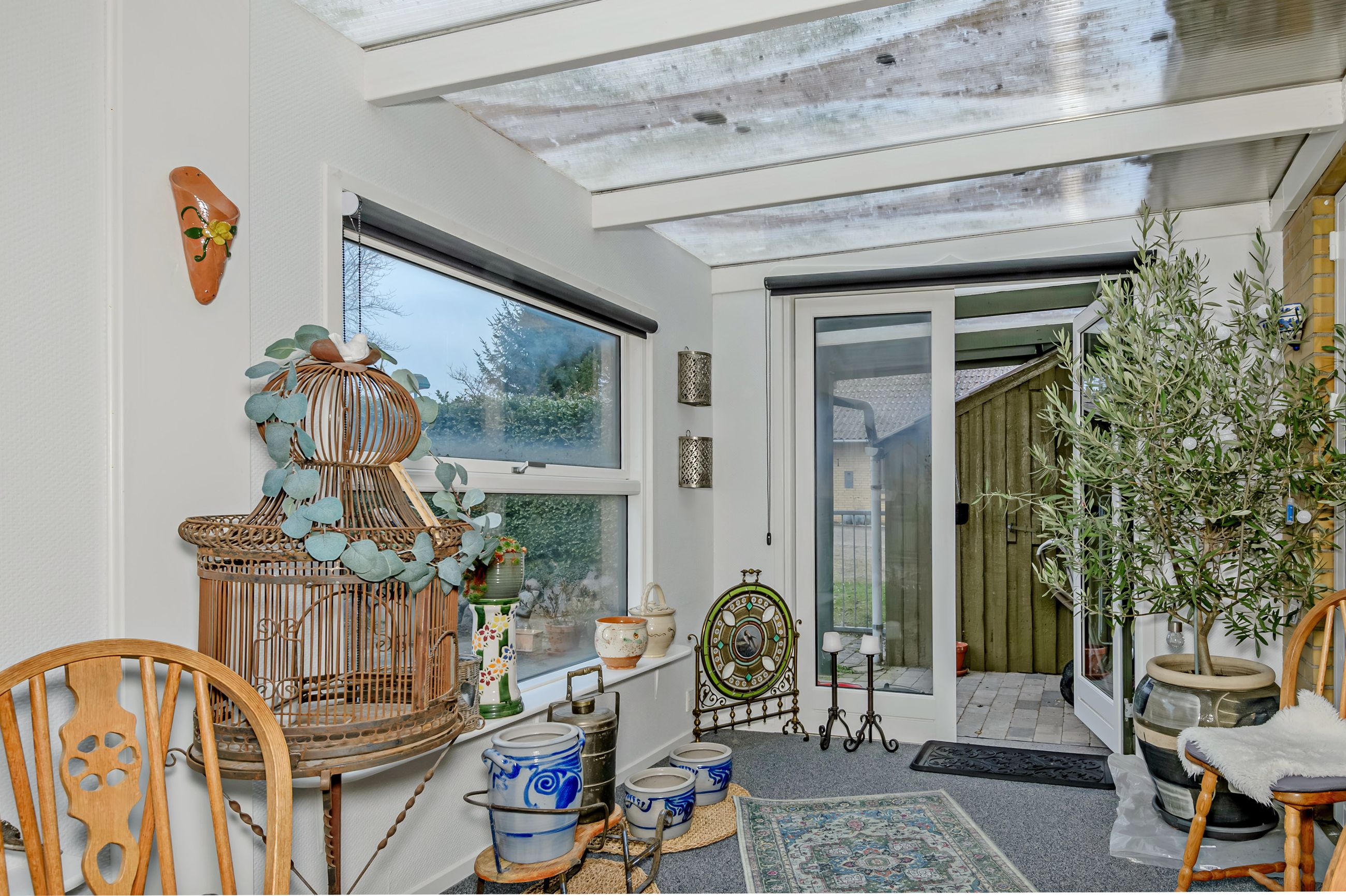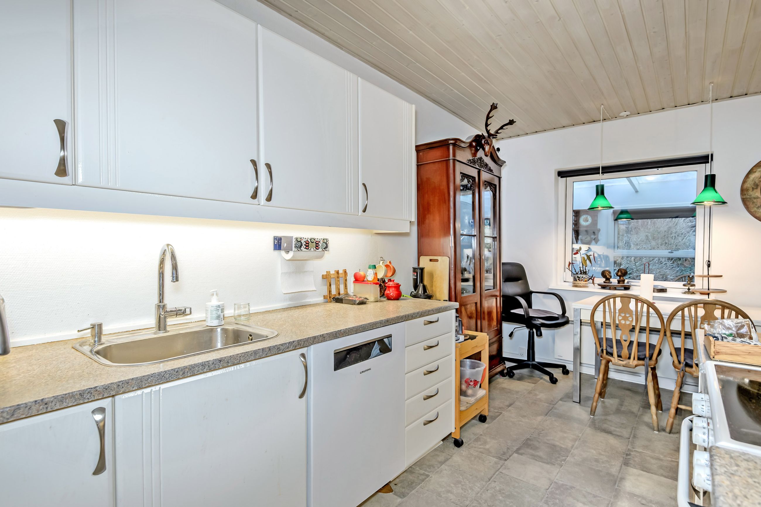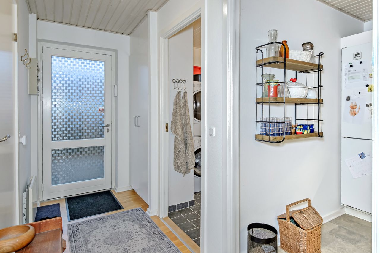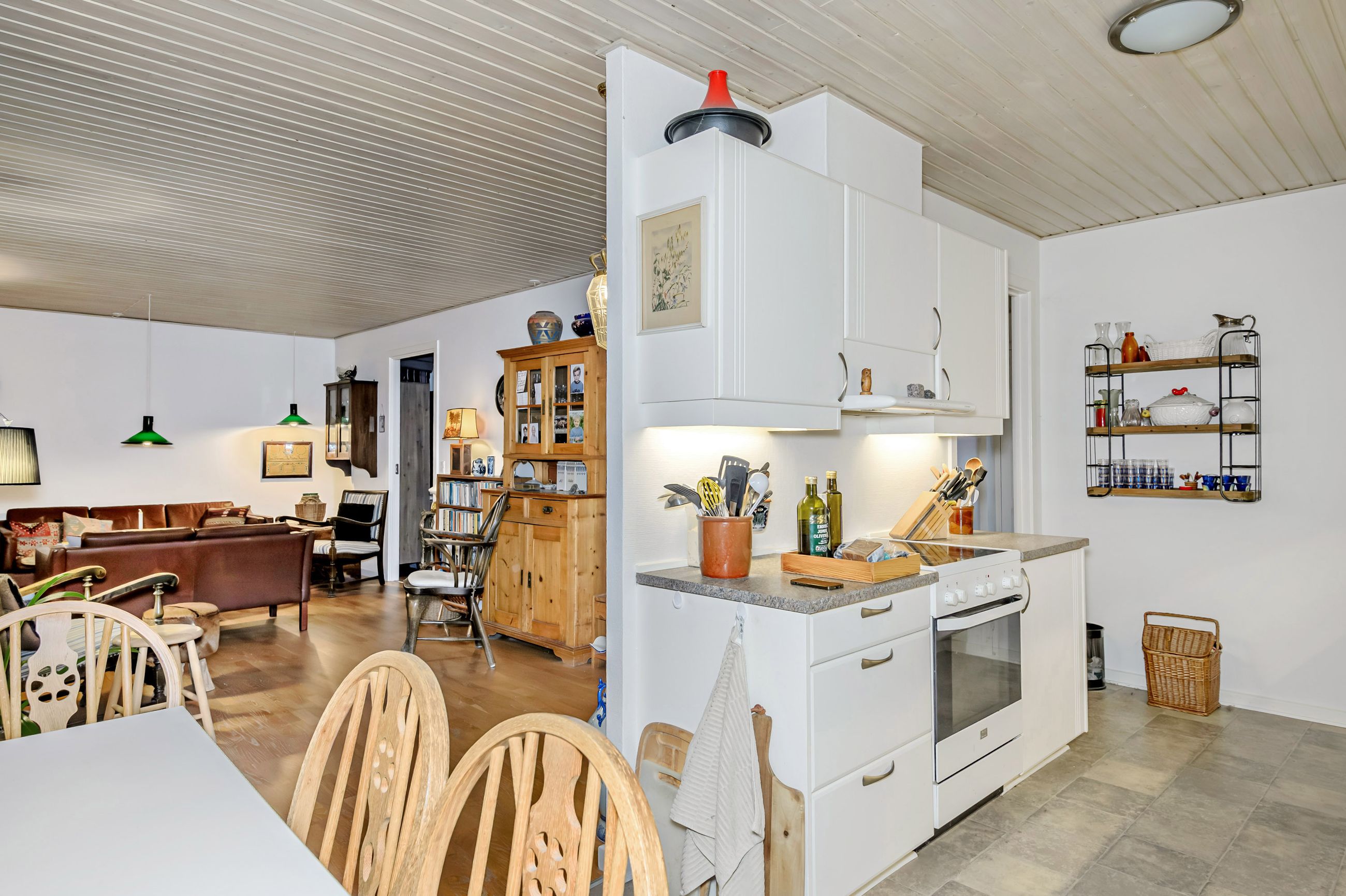 Enderækkehus der rummer: Entre med fast skab og garderobeplads, soveværelse med faste skabe, ekstra værelse, badeværelse med gulvvarme, bruseniche og plads til vaskemaskine, køkken med lyse elementer, god skabs- og bordplads samt en fin spiseplads, delvist åbent mod den rummelige stue. Fra stuen udgang til en dejlig udestue, der forlænger sæsonen i begge ender. Pæne trægulve i stuen og værelserne. Lyse trælistelofter.