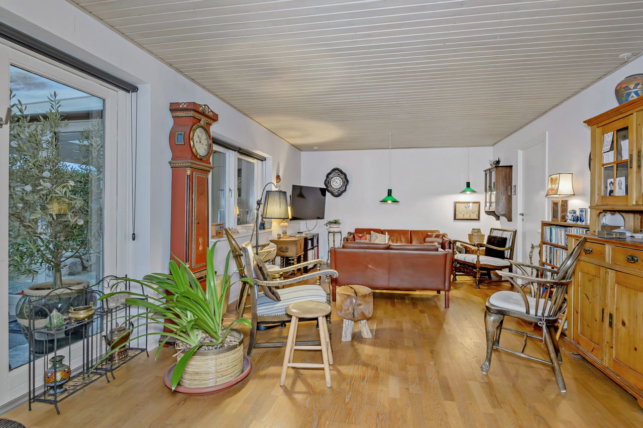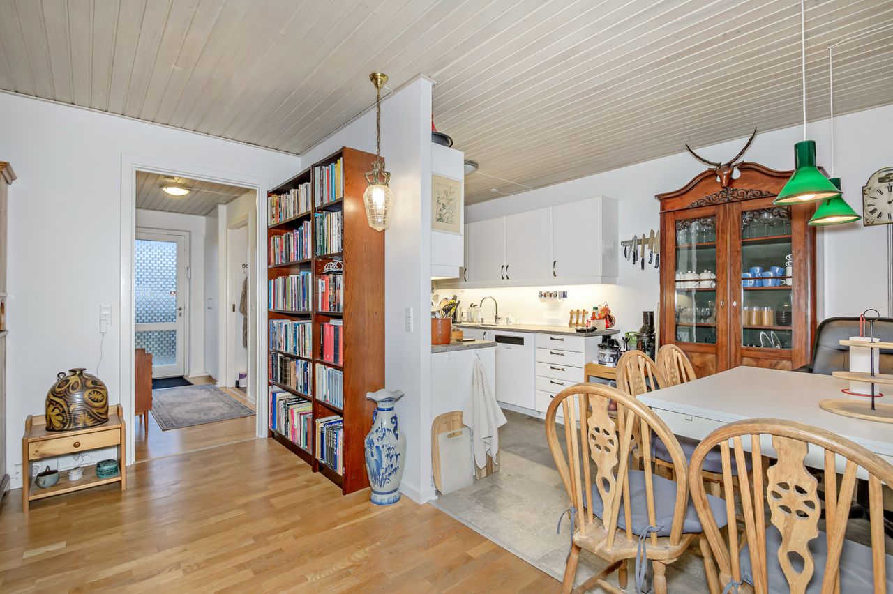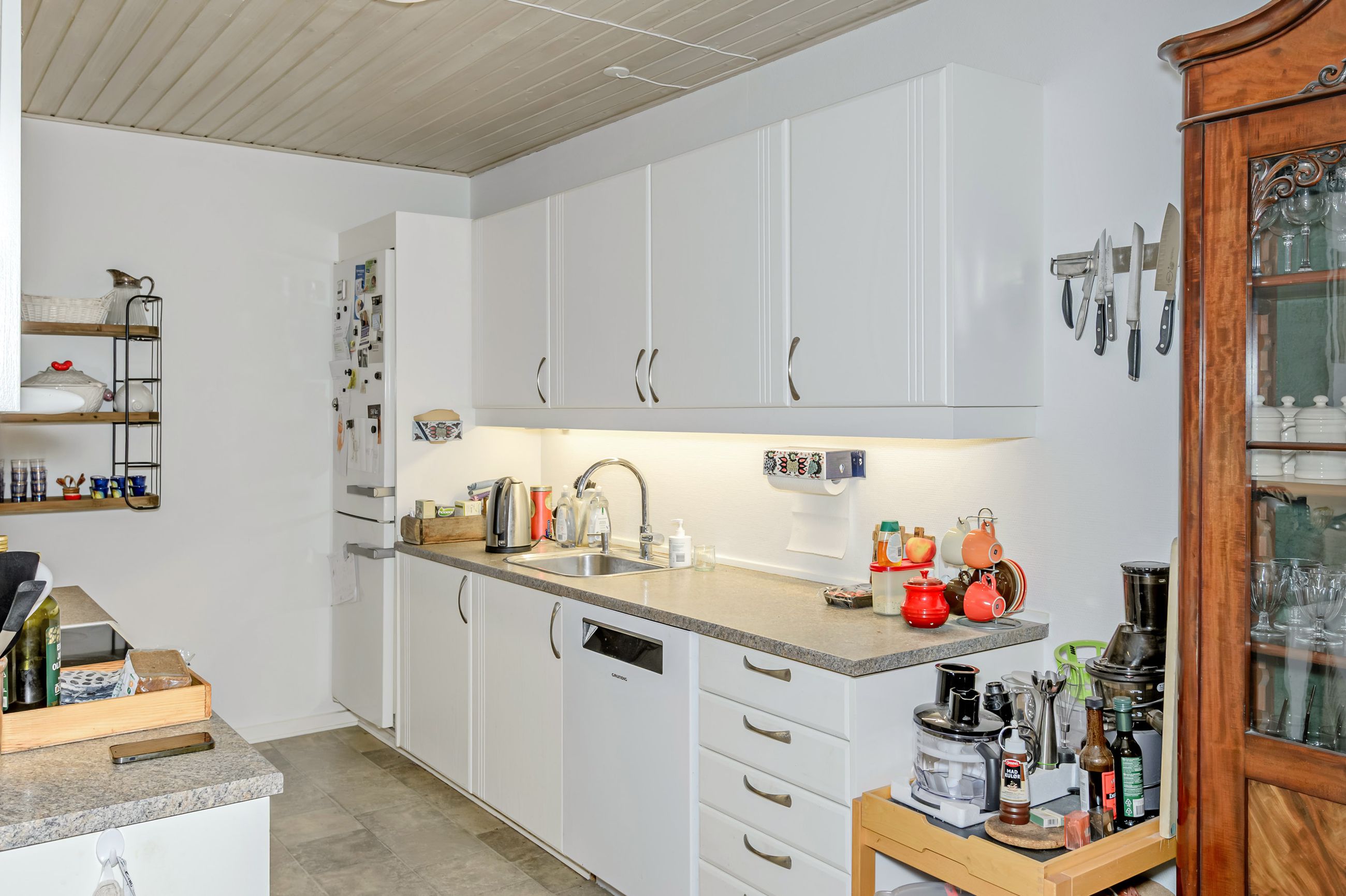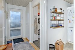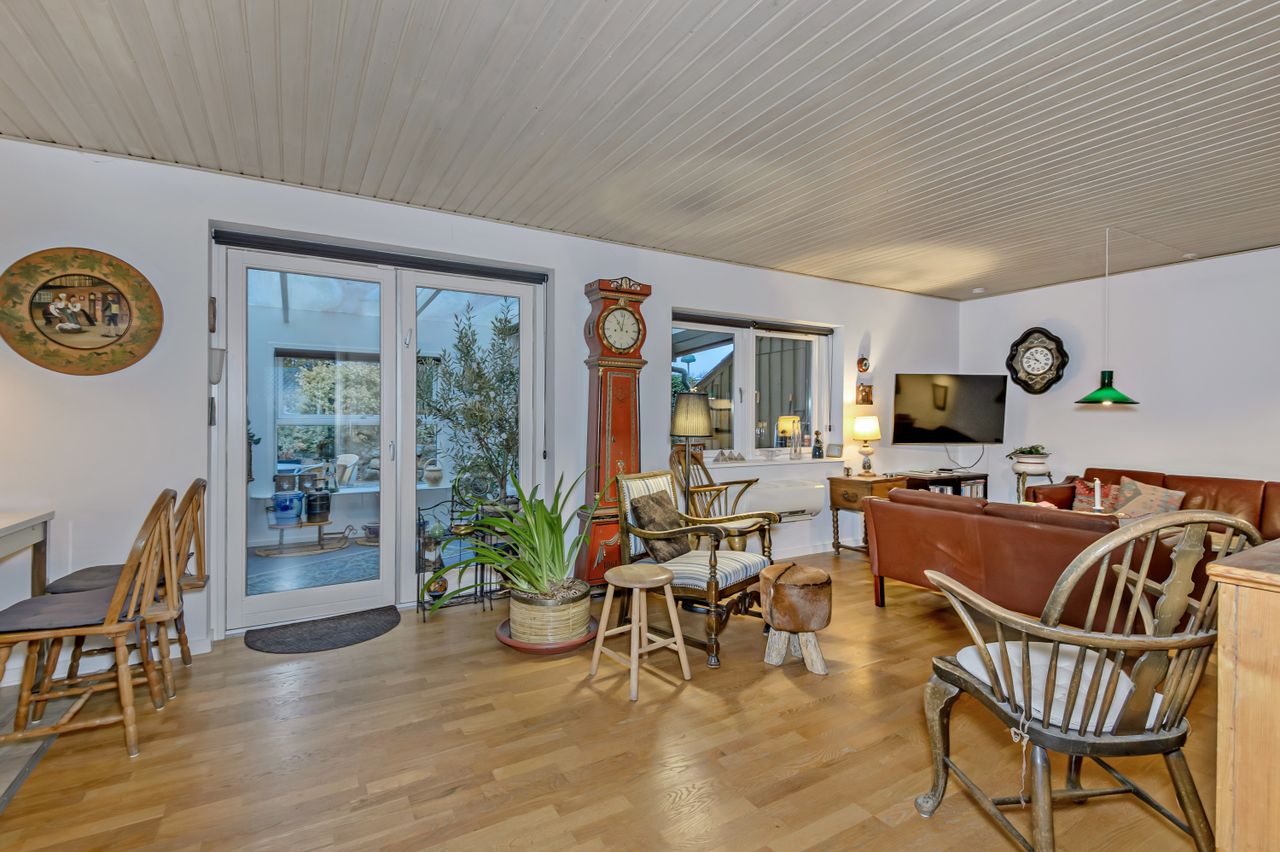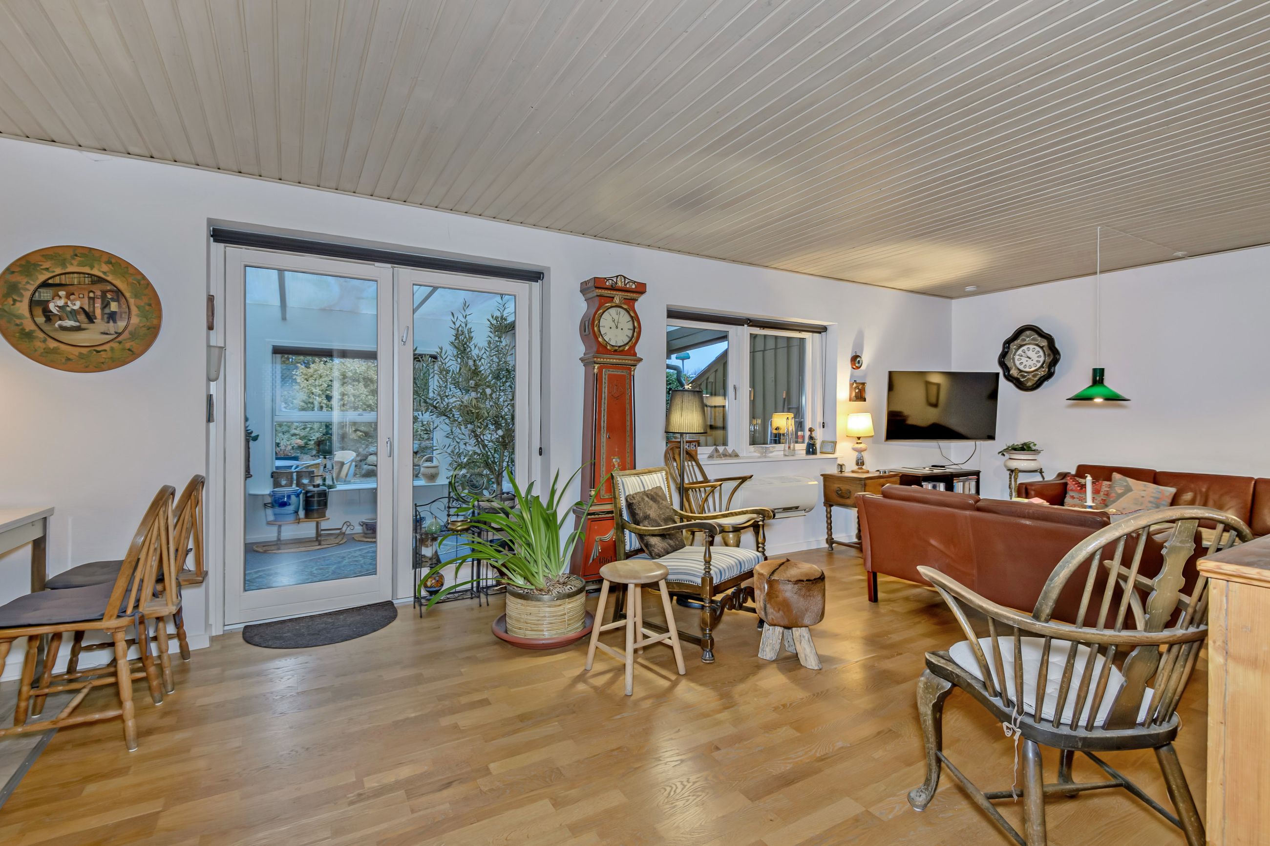 Enderækkehus der rummer: Entre med fast skab og garderobeplads, soveværelse med faste skabe, ekstra værelse, badeværelse med gulvvarme, bruseniche og plads til vaskemaskine, køkken med lyse elementer, god skabs- og bordplads samt en fin spiseplads, delvist åbent mod den rummelige stue. Fra stuen udgang til en dejlig udestue, der forlænger sæsonen i begge ender. Pæne trægulve i stuen og værelserne. Lyse trælistelofter.