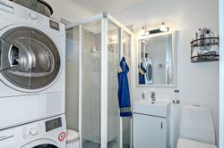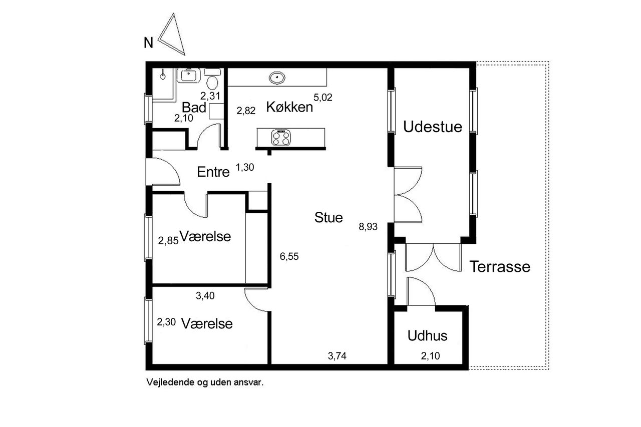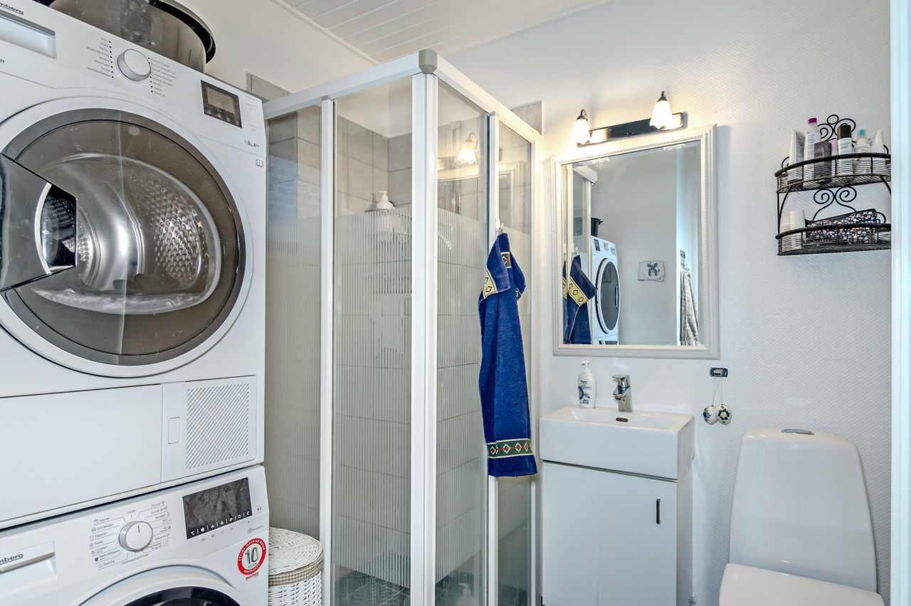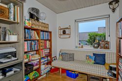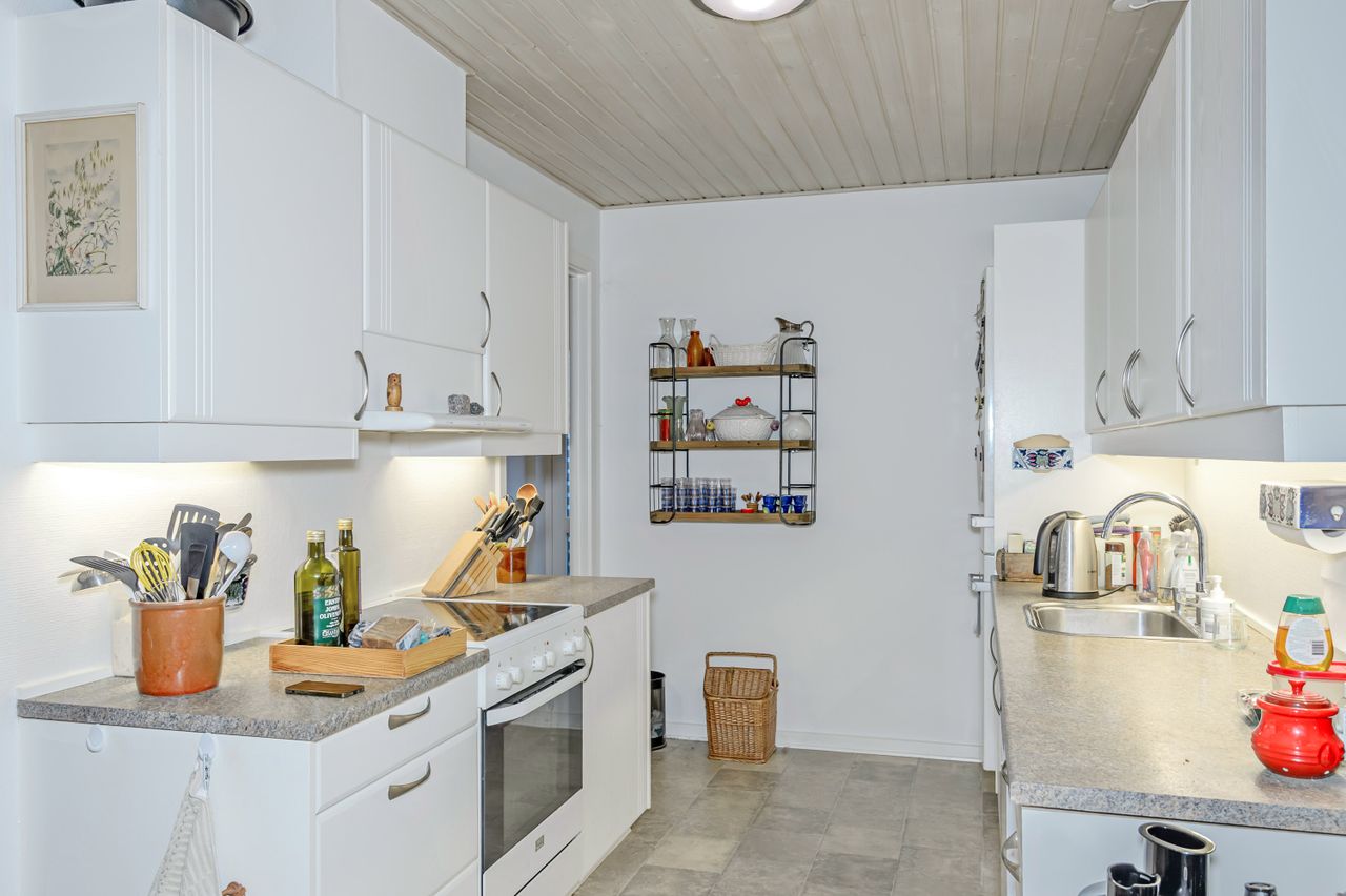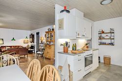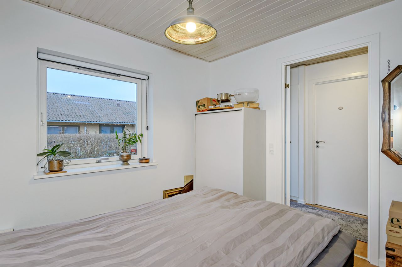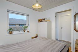 Enderækkehus der rummer: Entre med fast skab og garderobeplads, soveværelse med faste skabe, ekstra værelse, badeværelse med gulvvarme, bruseniche og plads til vaskemaskine, køkken med lyse elementer, god skabs- og bordplads samt en fin spiseplads, delvist åbent mod den rummelige stue. Fra stuen udgang til en dejlig udestue, der forlænger sæsonen i begge ender. Pæne trægulve i stuen og værelserne. Lyse trælistelofter.