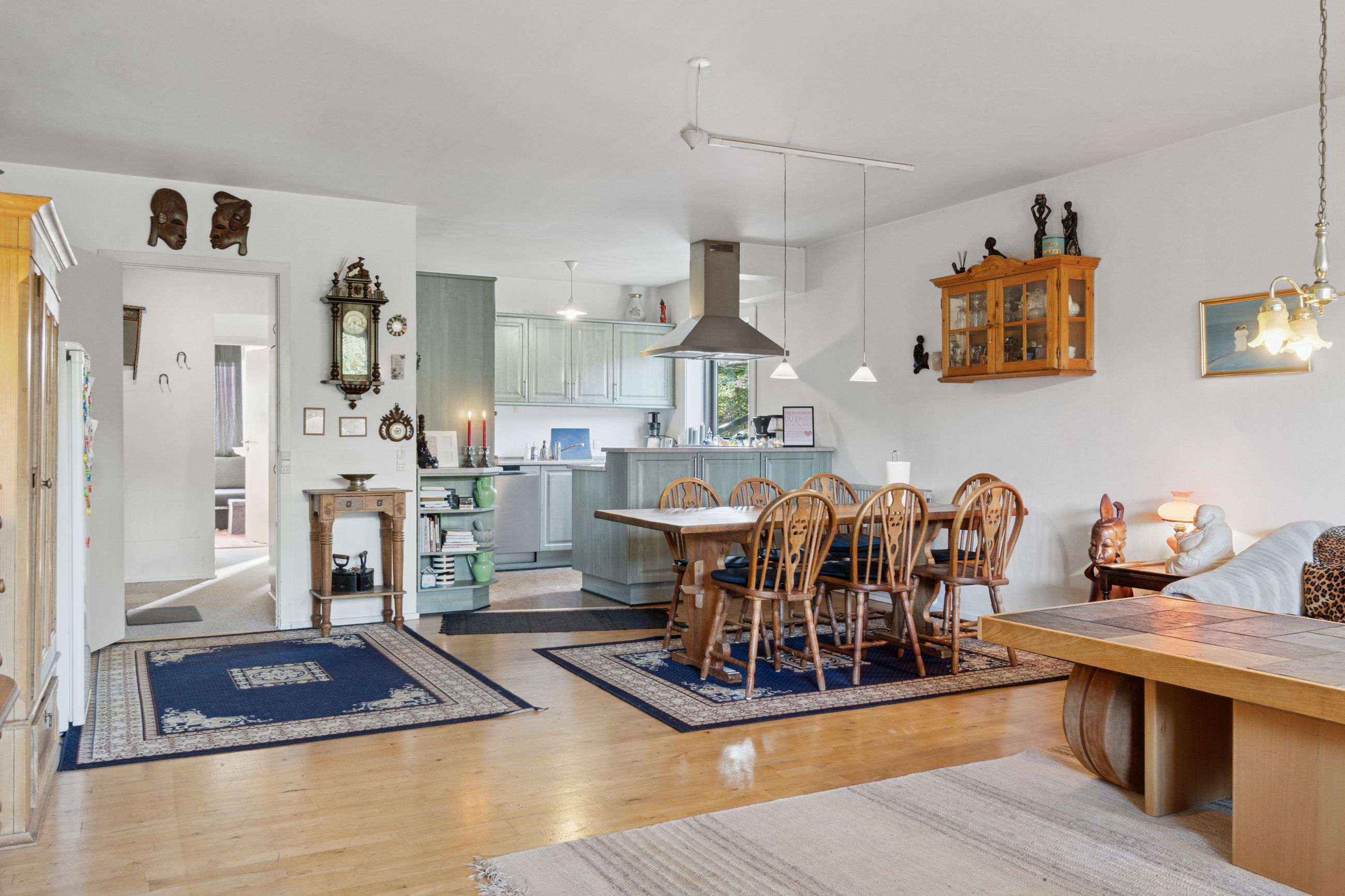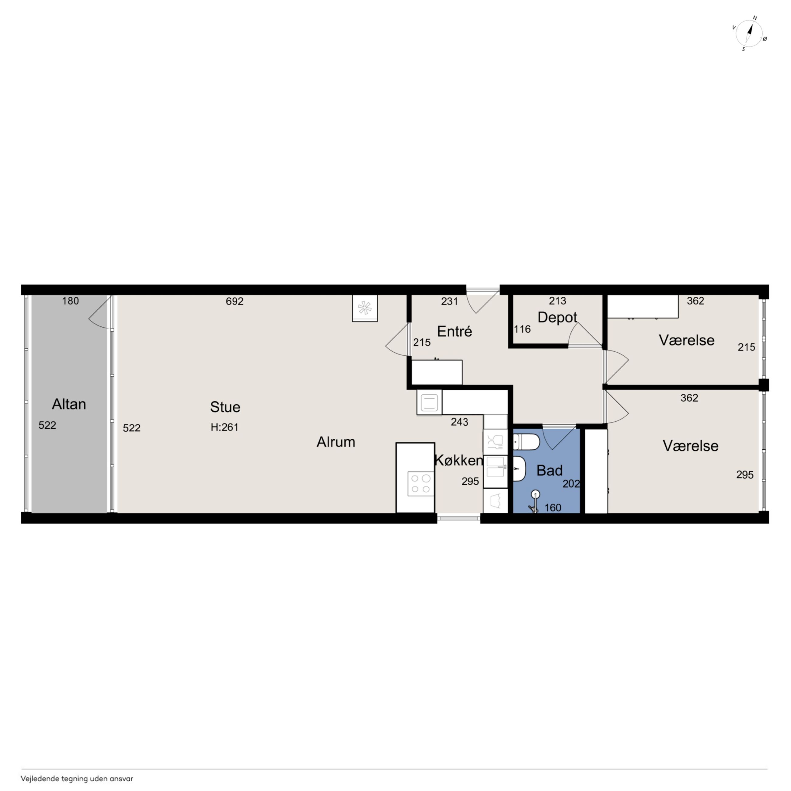 Boligen åbner op til en entré med adgang til et praktisk depotrum. Herfra fortsætter du ind i alrummet, hvor stue og køkken ligger i åben forbindelse. Køkkenet er indrettet med et ekstra vindue qua placeringen i enden af ejendommen, som giver et naturligt lysindfald, og stuen har god plads til både spiseafdeling og sofahjørne. Fra stuen er der adgang til udestuen, hvor skydedørspartiet forener boligen med den fine have.