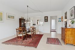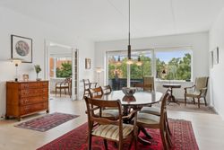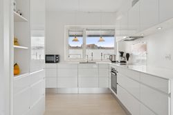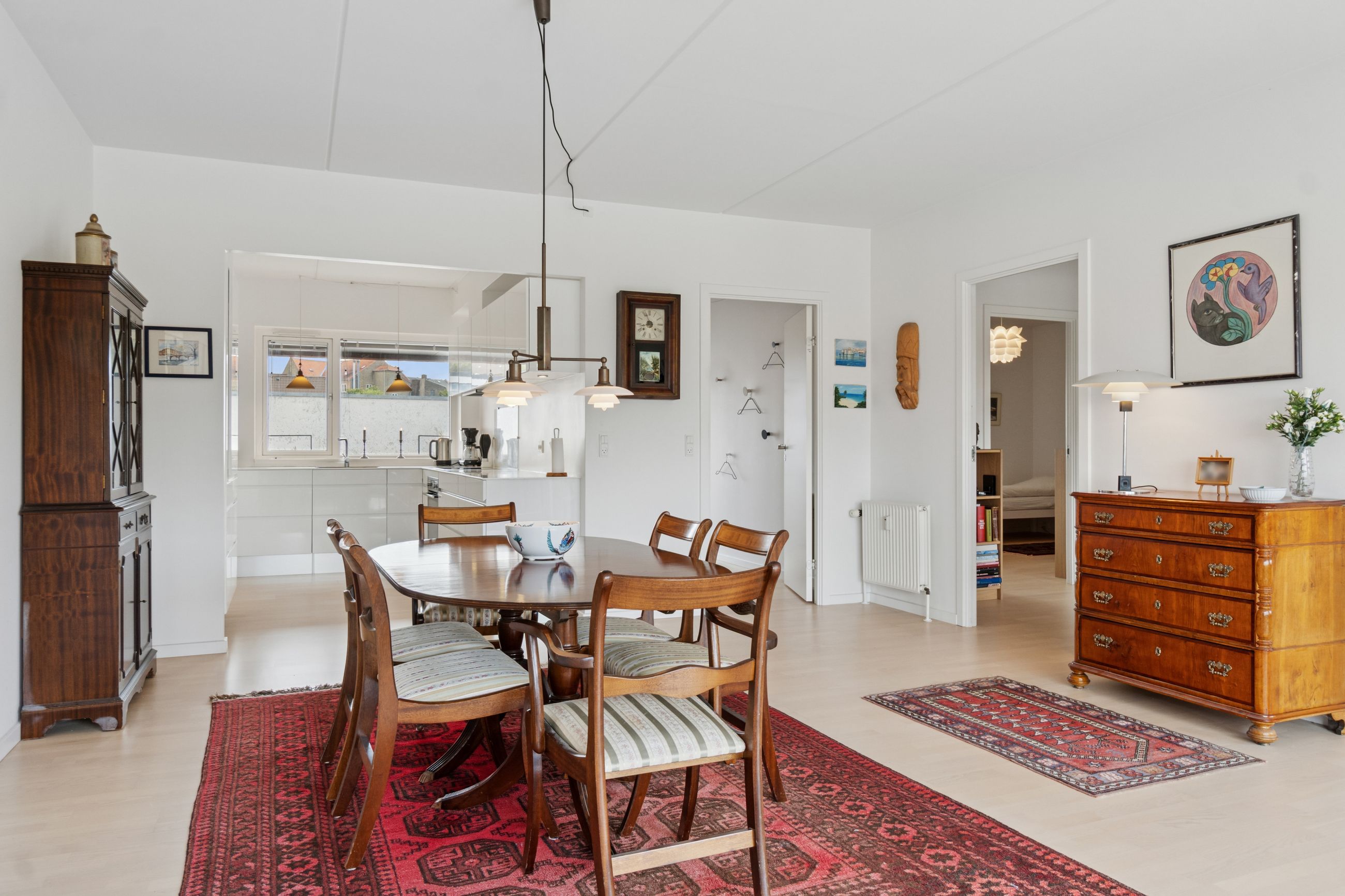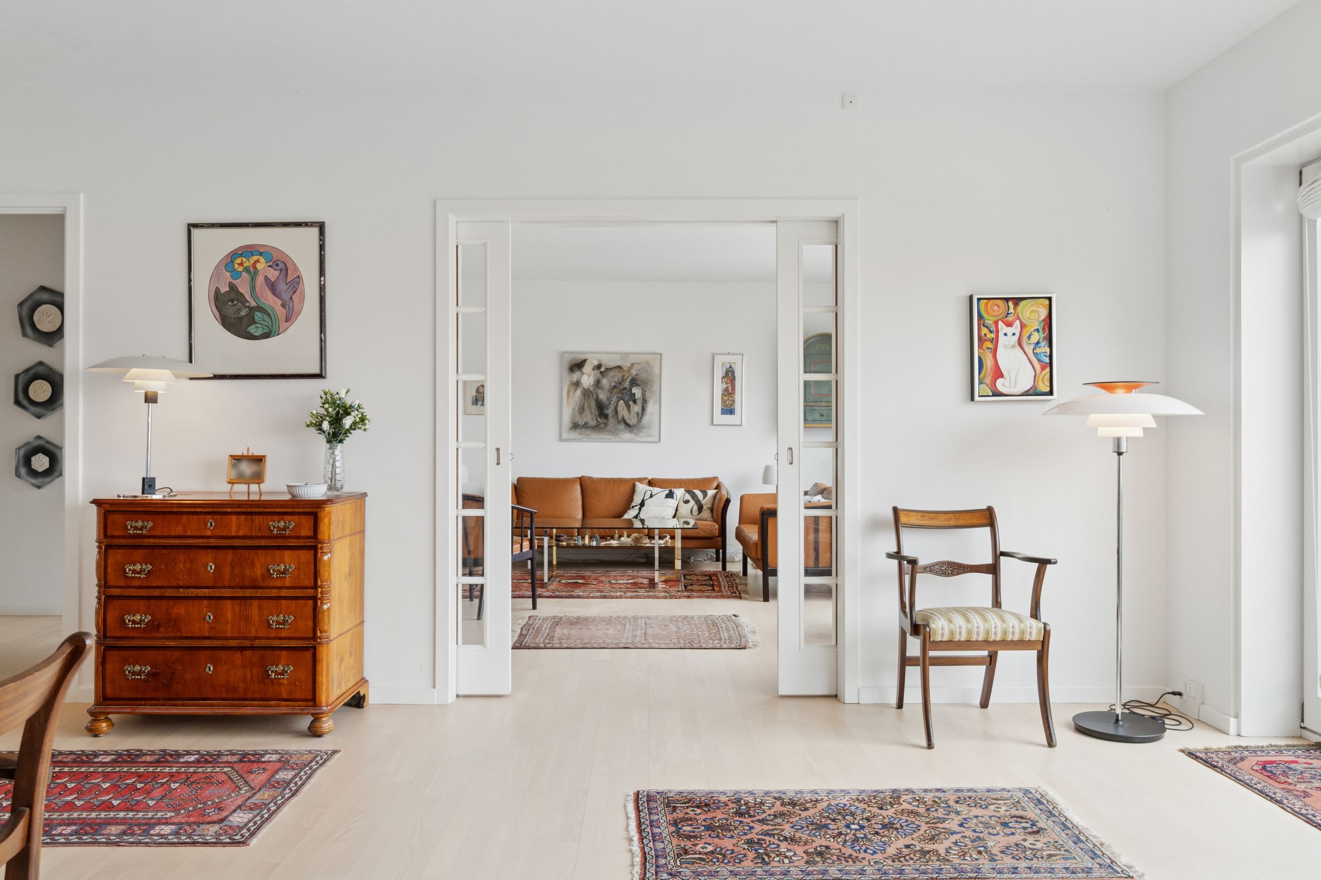 Inden døre starter rundturen i entréen, som fører dig direkte til det rummelige stuemiljø. Dér er lysindfaldet gavmildt takket være det vældige glasparti og pladsen god, så spisebordet og sofaen snildt kan arrangeres. I åben forbindelse har du det moderne, hvide køkken med fine opbevaringsmuligheder. I stuen åbner skydedøren op til endnu en stue, der også kan anvendes til et ekstra værelse ved behov.