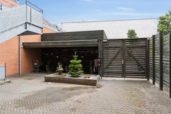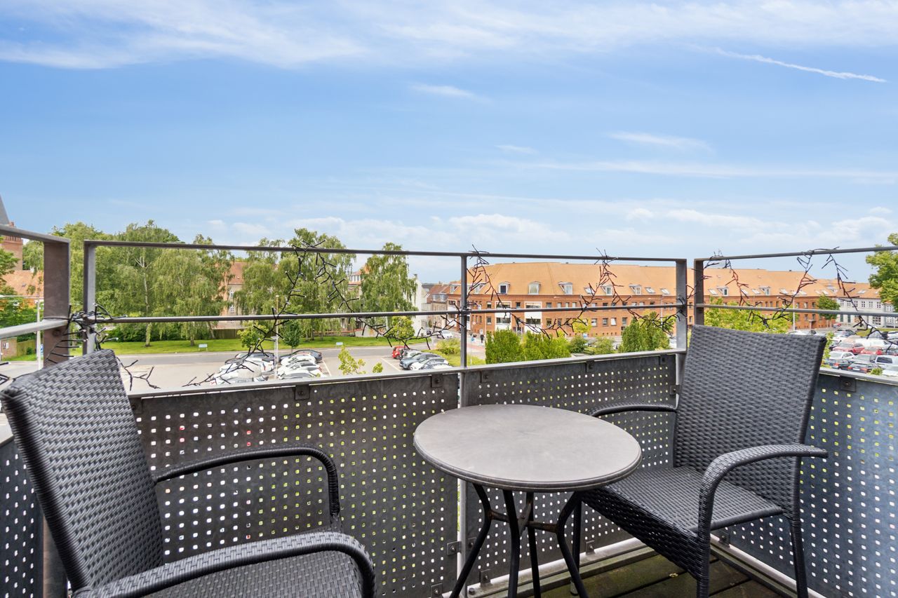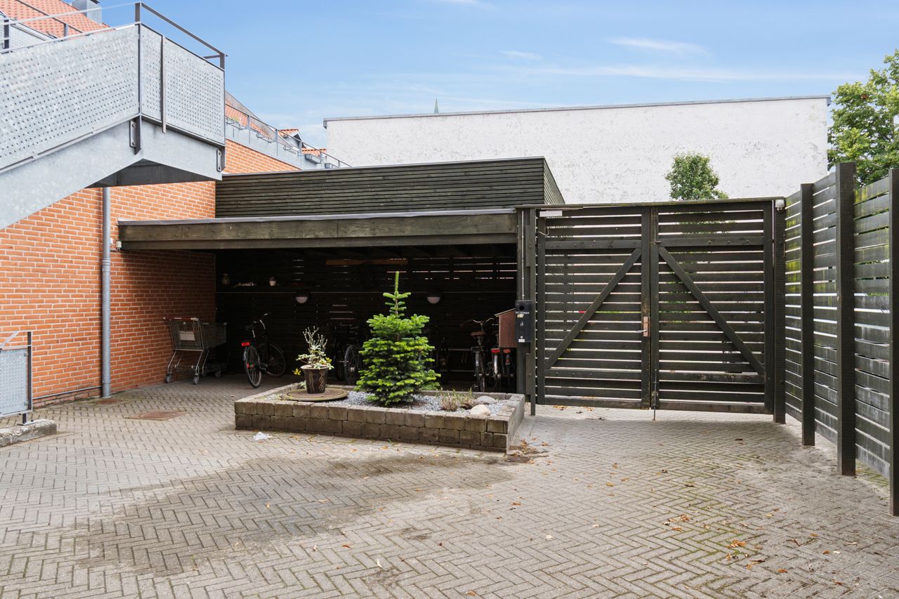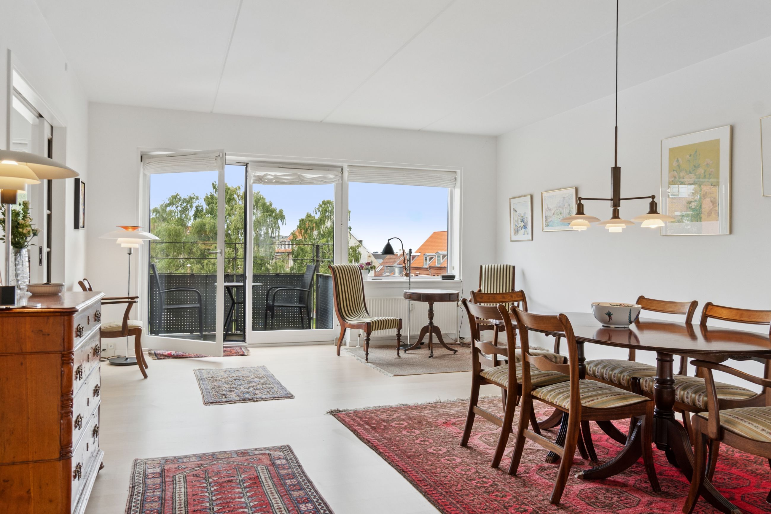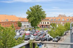 Lejligheden ligger i en pæn rødstensejendom med elevator, butik i gadeplan og parkeringspladser bagved. Her kommer du til at bo midt i byen, hvorved du har nem adgang til alle centrums tilbud i form af både butikker, spisesteder og kulturoplevelser. På samme vis får du kort afstand til alt det, du har behov for i dagligdagen, og du kan således nå indkøb og stationen til fods. Også Lystskovens rekreative omgivelser spadserer du til. Pendler du i bil, er motorvejen ligeledes let tilgængelig.