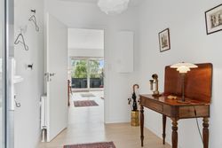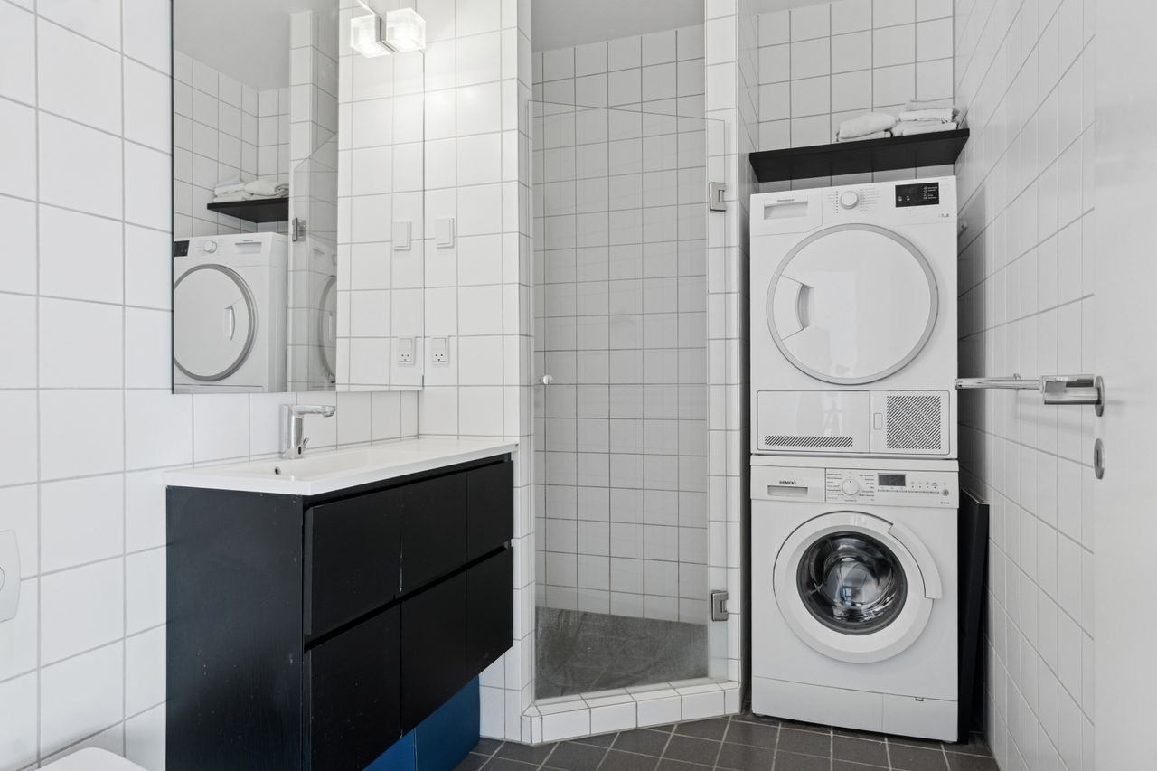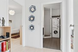 Et gangareal leder dig til det pæne badeværelse med bruseafsnit og plads til vaskesøjlen, ligesom du her finder det store soveværelse med indbyggede skabe til garderoben.